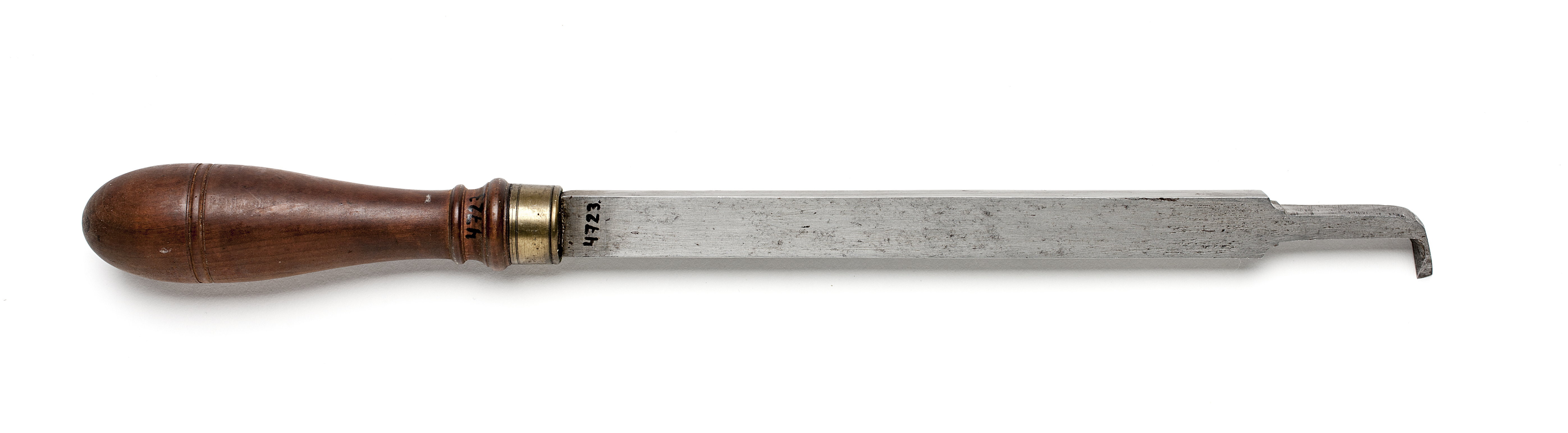 Klinga med rektangulär genomskärning, via profilering på två sidor övergående i smalare, vinkelböjd ände. Rak egg. Svarvat skaft av päronträ med två vulster nedtill ("skoklostertyp"). Mässingsring. Stämpel på skaftets ände vid fästet: "V".