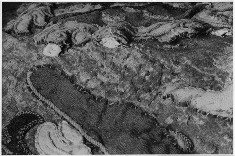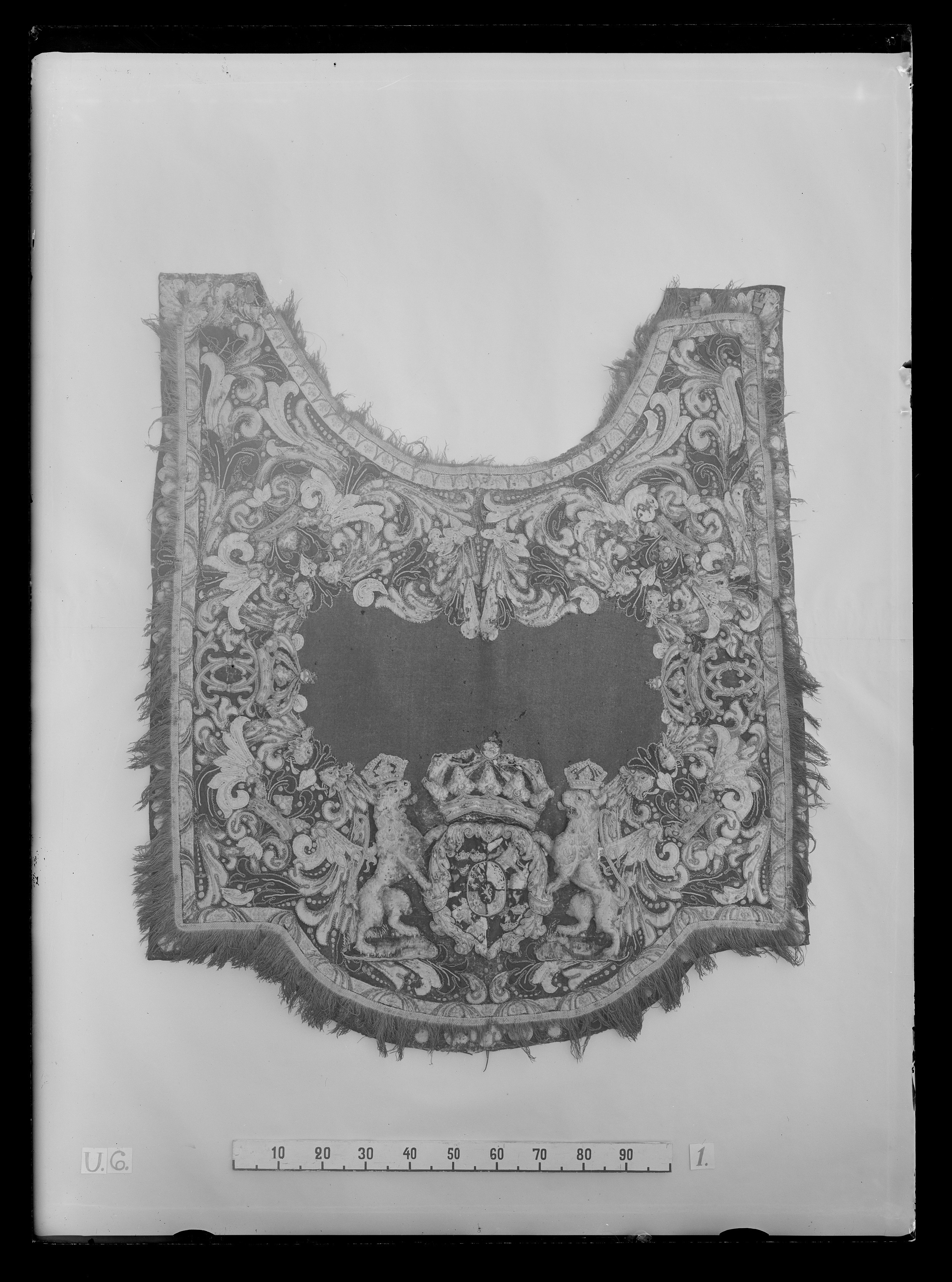 Täcke av blått kläde med applikationer av kläde i flera färger, huvudsakligen gult och vitt. Samma typ som nr 4061 men skiljer sig från detta i följande avseenden: Bredd framtill: 1620 mm. Riksvapnets mått: 520x620 mm. De små gula lejonen i vapenskölden är sydda av ullgarn i schattersöm. De sköldhållande lejonen står på små grästuvor av grönt kläde utan broderier. Höger framstycke har två läderremmar, 180x22 mm, placerade 60 mm frånframkanten. Höger framstycke har två tränsar av läder ca 50x20 mm, med spännen av vitmetall, 30x30 mm, tränsarna sitter ca 75 mm från framkanten. På baksidan sitter fem tränsar liksom på nr 4061. Märkt "G.21" med svart tusch 80 mm nedanför inskärningen. Två hällor av brunt läder, 260x38 mm, sitter ca 550-600 mm innanför respektive långsida, ungefär i täckets mittparti. Svansrem, 360x20 mm, av brunt läder, kluven nästan ända upp till kortänden. Remmen sitter 310 mm ovanför bakre fliken. I ena bakre hörnet sitter en pappersetikett, 39x39 mm, med inskription med brunt bläck: "C XII //No 97 // 30 st.". I ena främre hörnet sitter en fastsydd pappersetikett, 55x40 mm. Svårläslig text, lyder enligt konserveringsprotokoll: "Schabraque Sadell och hestetäcken //No 19 // 30 st hantäcken // 12 st d:o // 42 st inalles".