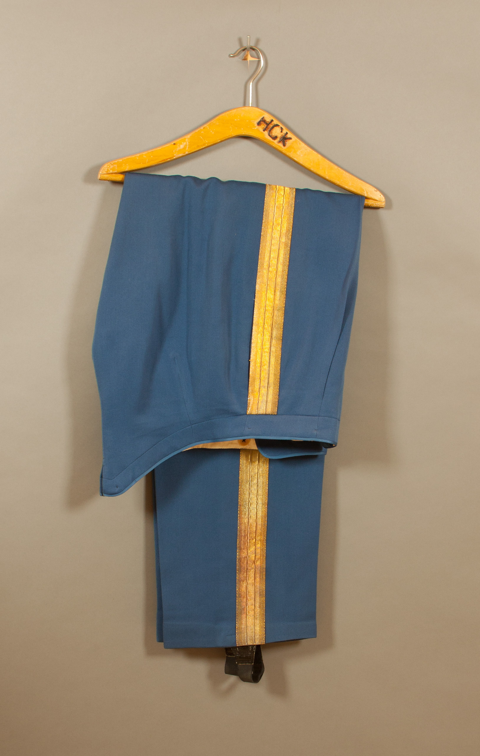 Långbyxor av mellanblå diagonal, knäppta med gylf med fem blå knappar d: 14 mm med firmamärke "J. M.Jansson & Wallgren". Fickor i sidsömmen, på höger sida en liten ficka utmed linningen samt en bakficka med en knapp. Utmed sidsömmen 44 mm bred guldgalon. Nedtill hällor av svart resårband med läderskoning. Hällorna fästade på byxbenens insidor med dubbla knappar, lika som de övriga. Foder upptill v vit bomull samt på linningens insida sex vita knappar, d: 18 mm med firmamärke: "J:M. JANSSON & WALLGREN, STOCKHOLM".