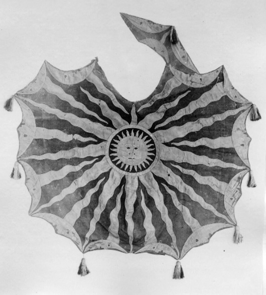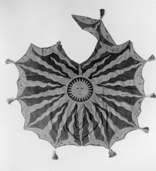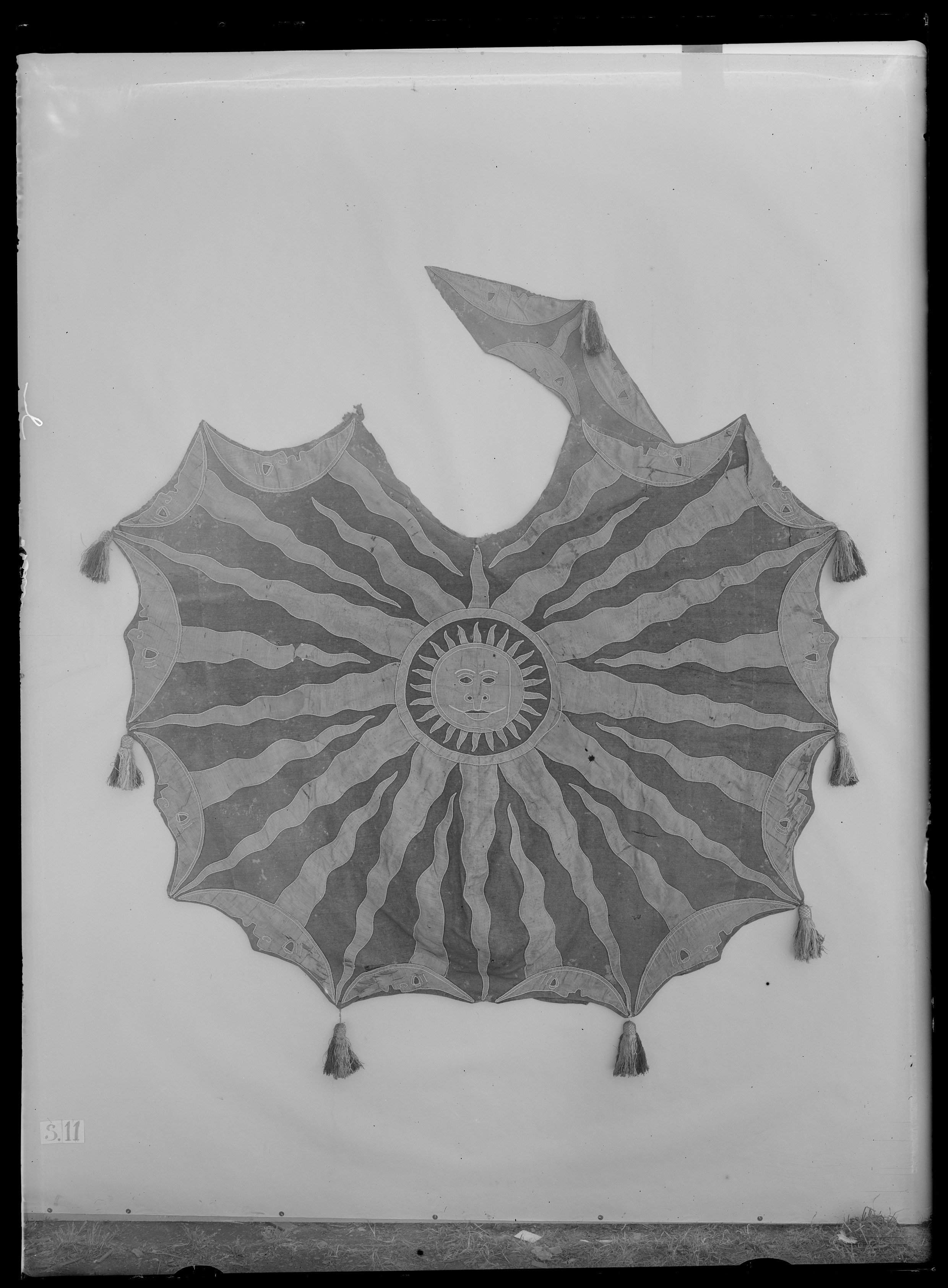 Bottentyg av rött kläde med applikationer av ljusblått taft med ljusa 2 mm bredasilkessnoddar i kanterna, även som konturer av ansiktsdetaljer.Centrerad bildad sol med en diameter på ca 400 mm med tolv utgående vågformadestrålar som är bredare vid basen och spetsiga mot täcktets ytterkanter. Längsytterkanterna tolv bildade månar, åtta större och fyra mindre, och tre stycken påbogstycket, medansikten vända utåt. Från varje månrygg utgår en stråle som spetsigtavslutas mot solringen. Varannan stråle går mot solen och varannan ifrån. Bogstyckethar en liten stråle. Vid den strålens spets en tofs och i täckets sidor avslutasvarje stråle från solen med en tofs, 150 mm lång med snodd, av silke i brunt, beigeoch blått, de övre 35 mm har ett sammanhållande nätverk. Fyra tofsar i höger sida,tre i vänster och en saknas. Längs bogstyckets ytterkant och i ytterkanten längs första vänstra månasiktet genombottentyget och fodret sex parvis sittande hål kantade med kaststygn, ca 4 mm idiameter. I slutet av bakre kantens mittstråle två likadana hål. diagonaler, bogstycke 740 m. Foder av blått linne i tuskaft, vådbredd 800 mm.