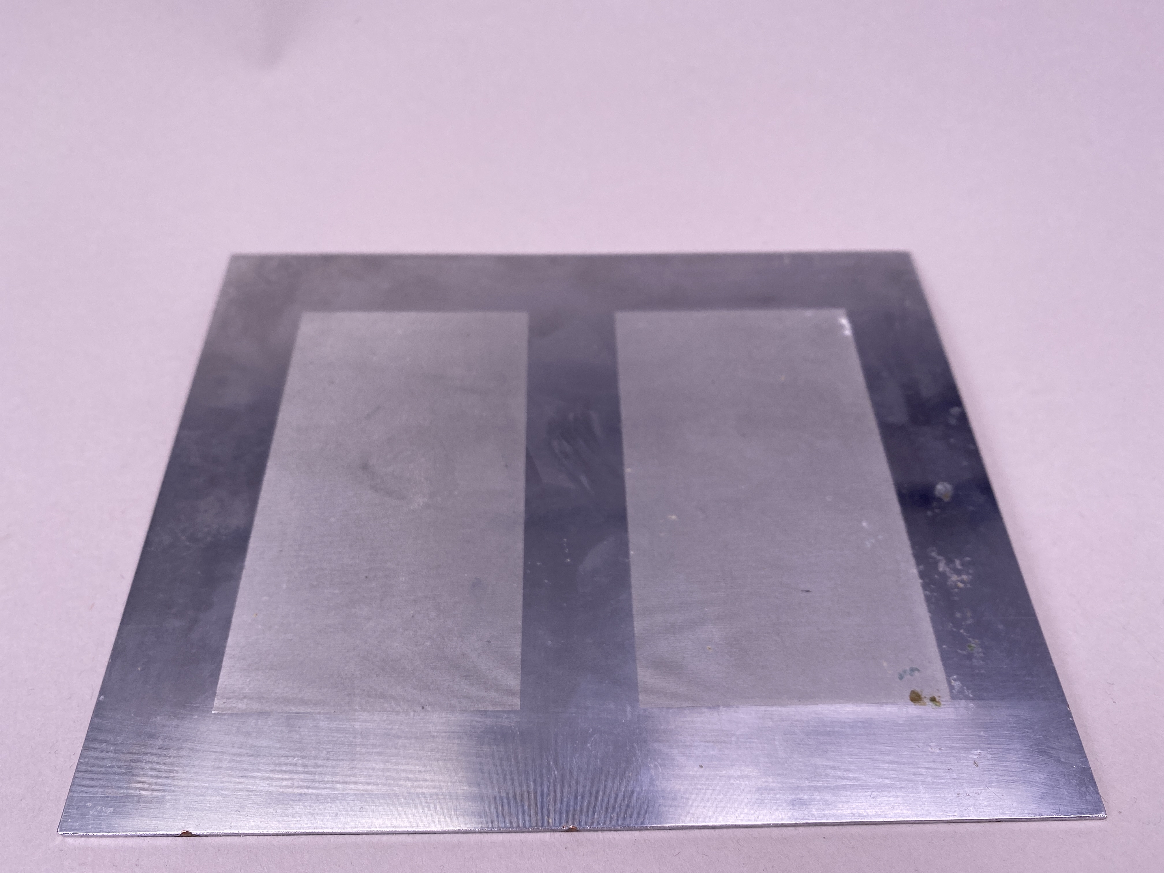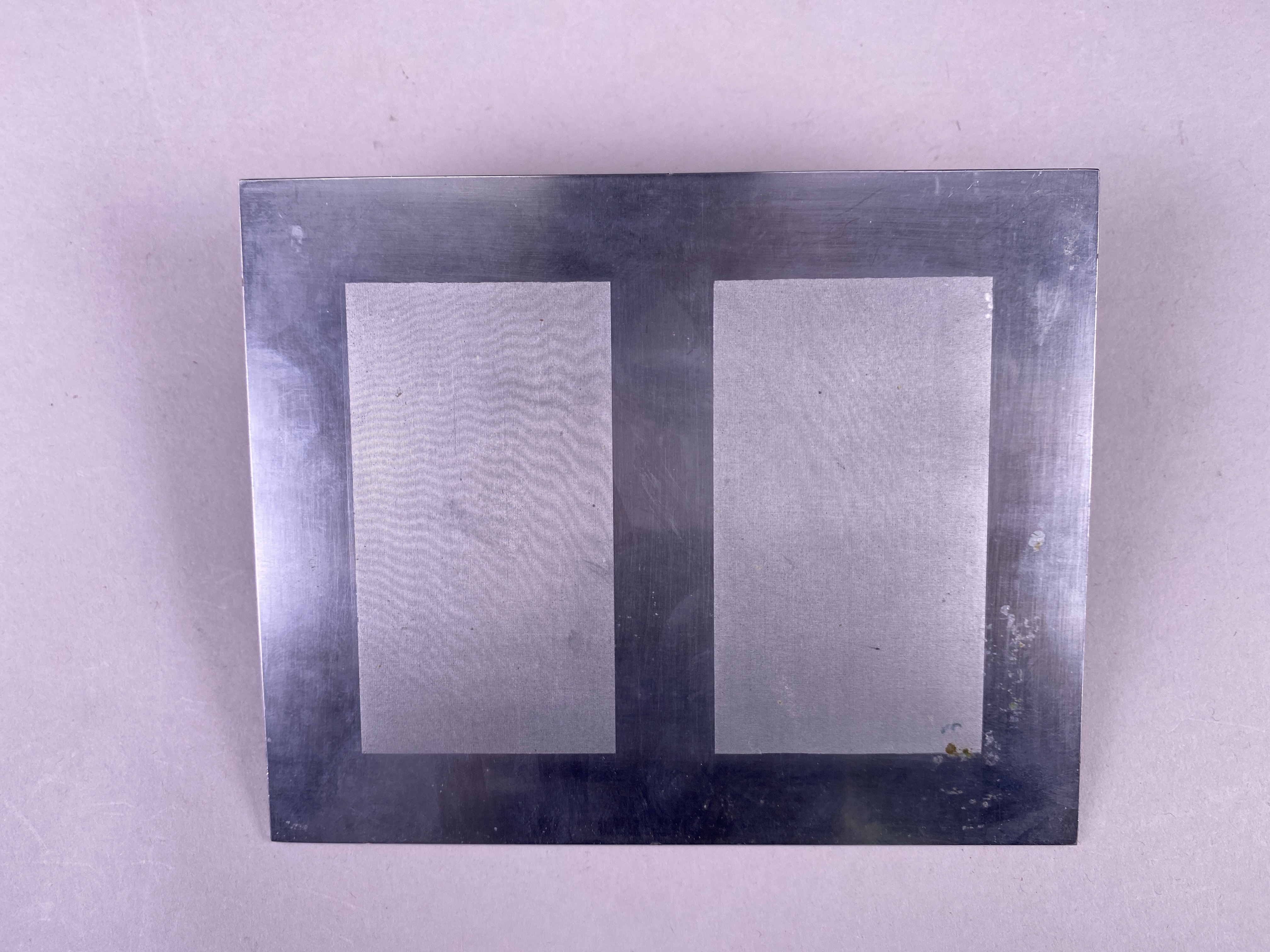 Rektangulär tryckplåt av koppar, framsidan överdragen med ljusare metall (rostfritt stål). Motiv: finmaskigt nät i två block.