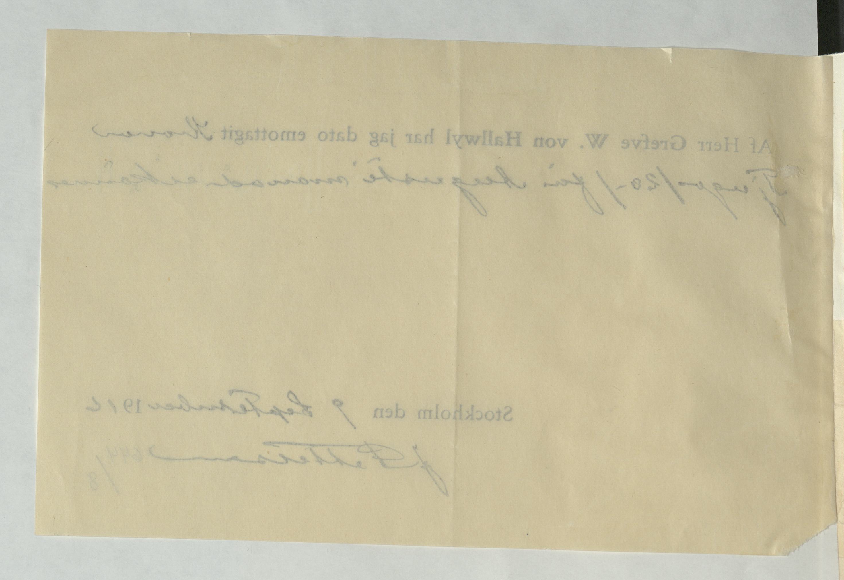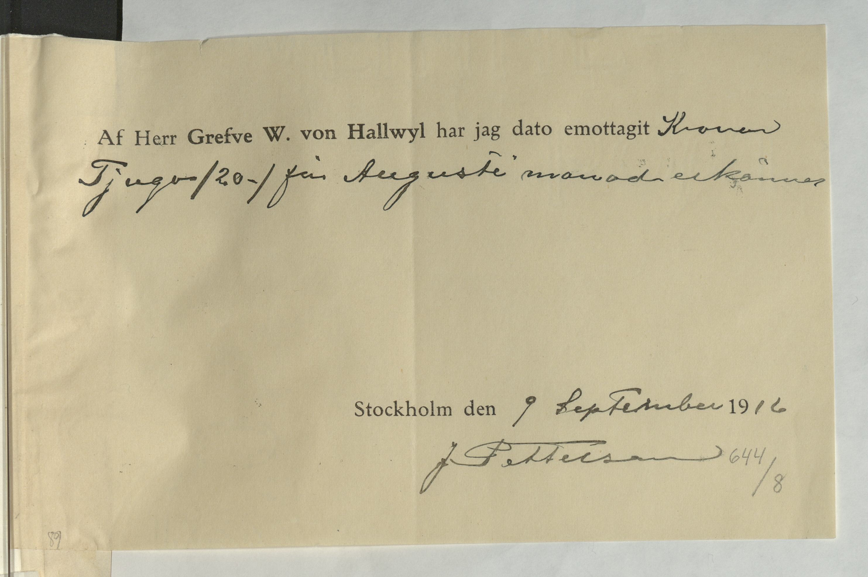 Kvitto från J. Pettersson, på att han emottagit 20Kr av Greve W. von Hallwyl för augusti månad. Stockholm 9 september 1916.