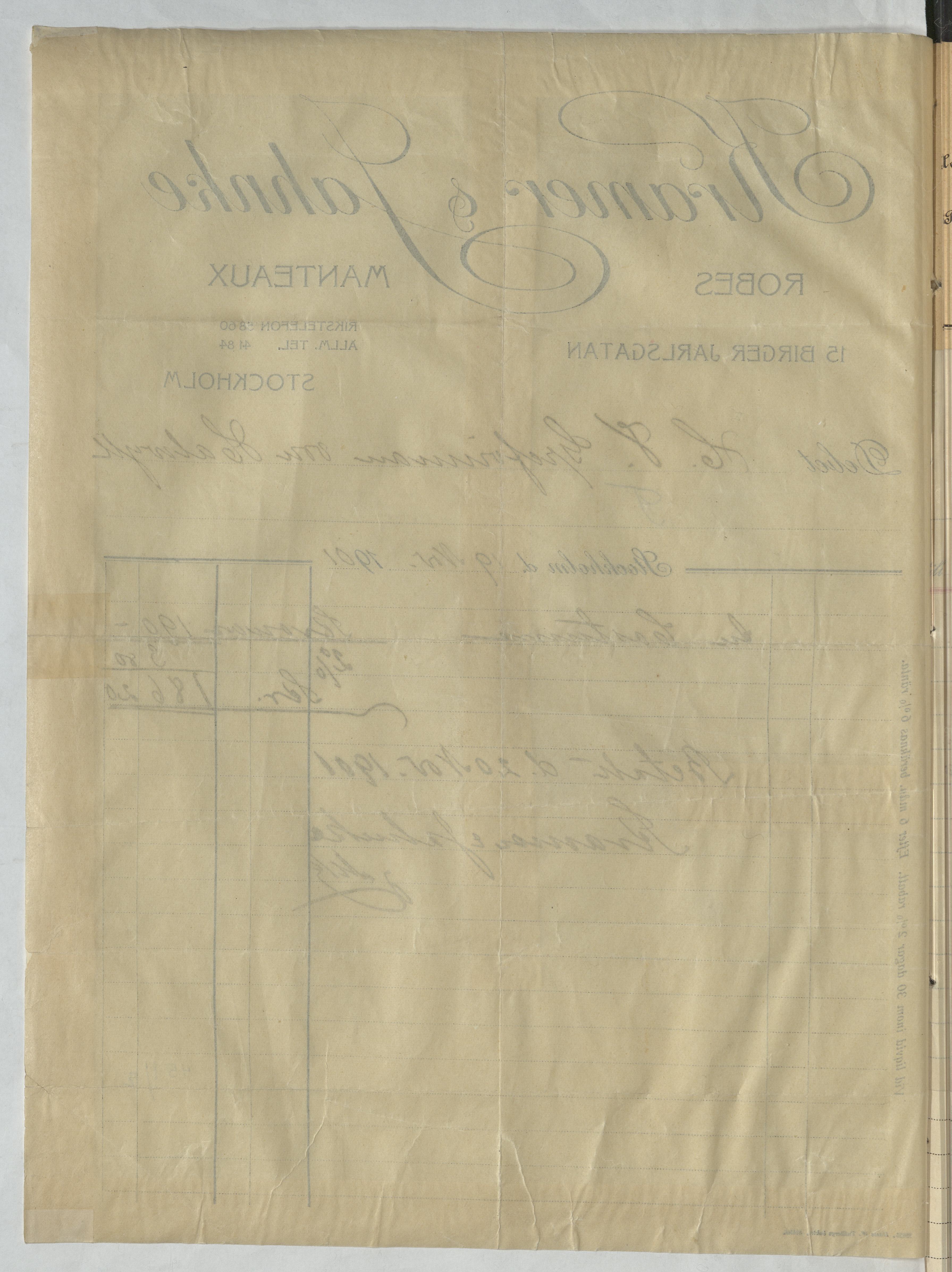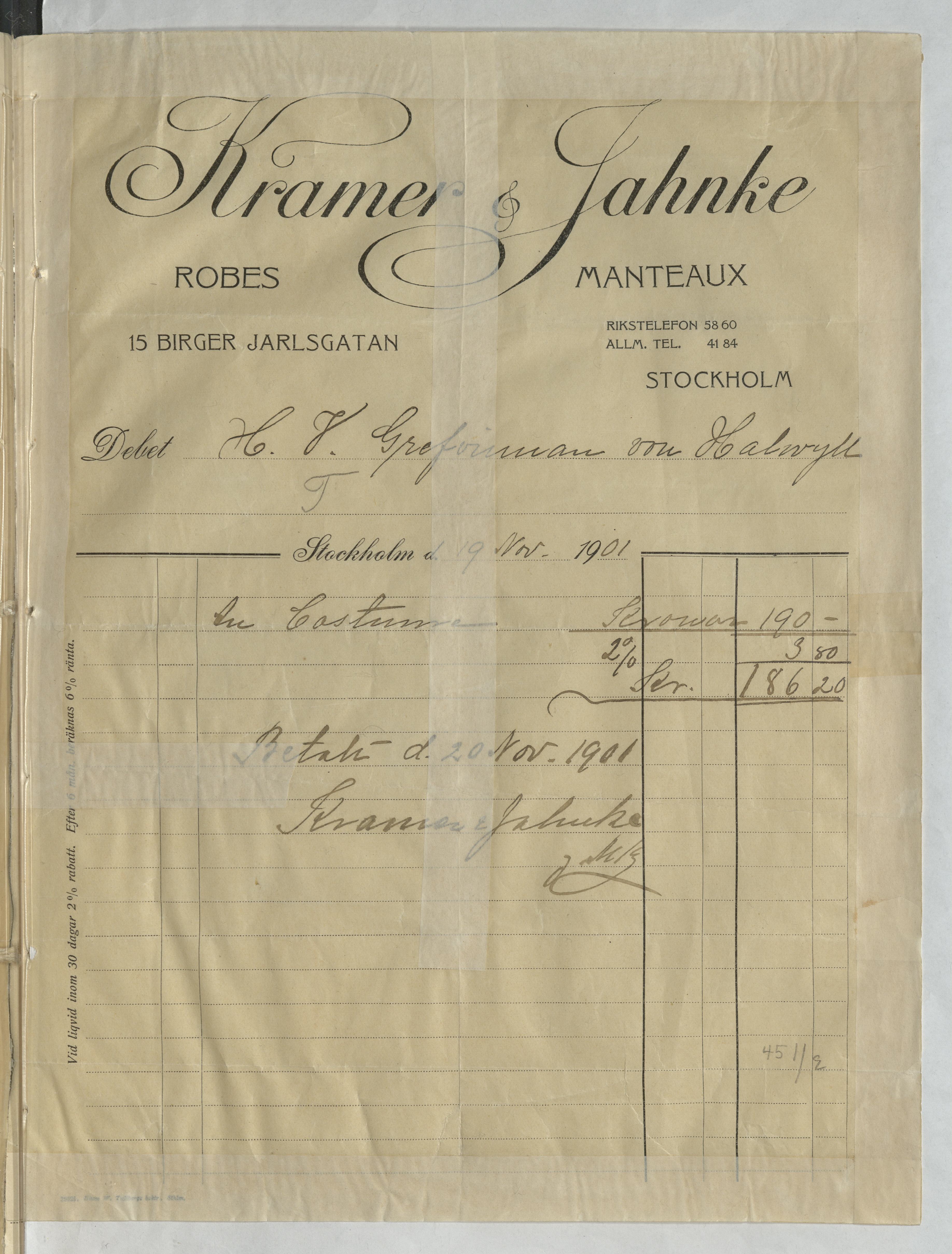 Kvitto från Kramer & Jahnke. Stockholm, 1901.