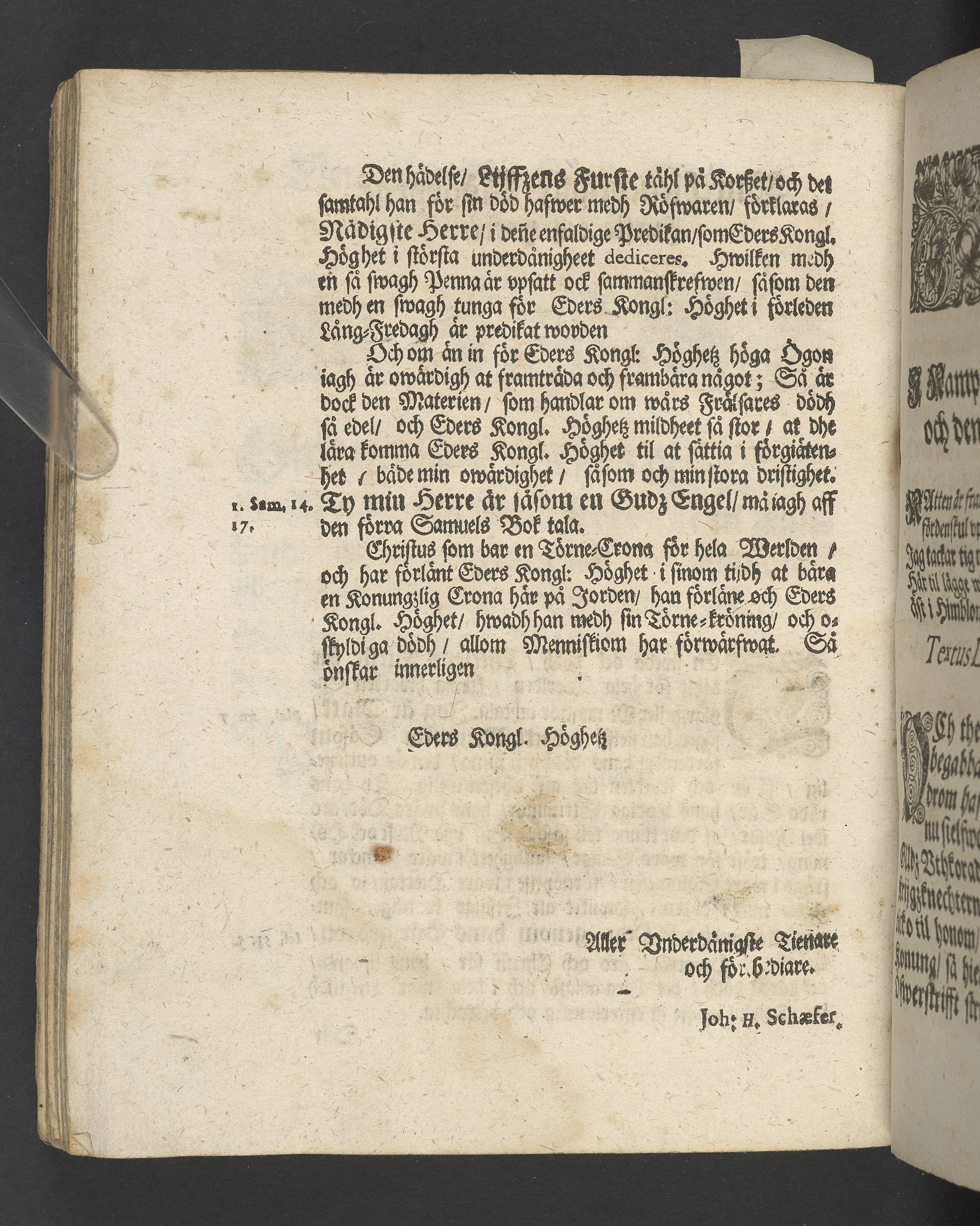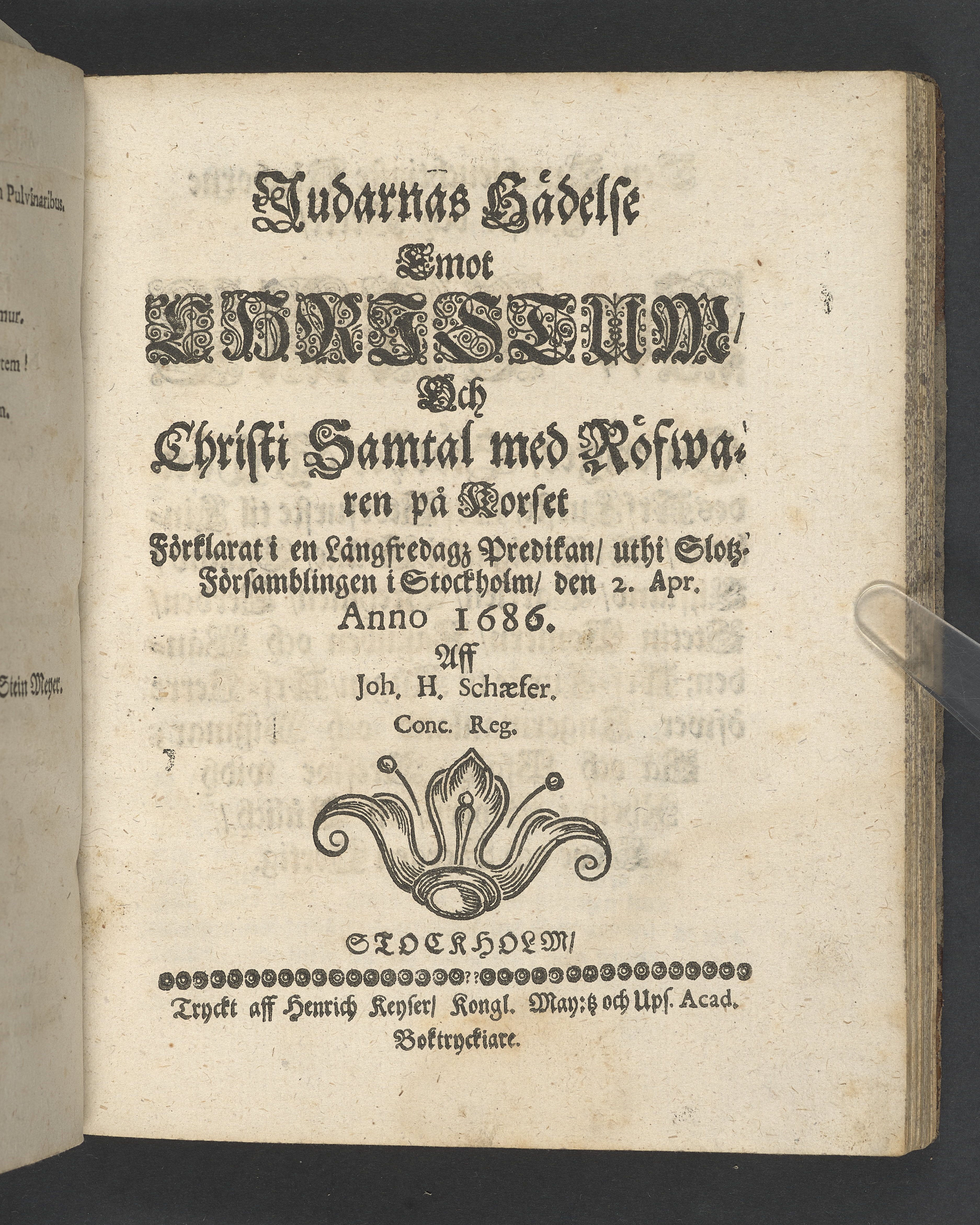 Judarnas hädelse emot Christum och Christi samtal med röfwaren på korset förklarat i Långfredagz predikan, uthi slotz-församlingen i Stockjolm, den 2. apr. anno 1686. Aff Joh. H. Schaefer. conc. reg. Stockholm. Tryckt aff Henrich Keyser, kongl. may:tz och Ups. acad. boktryckiare.