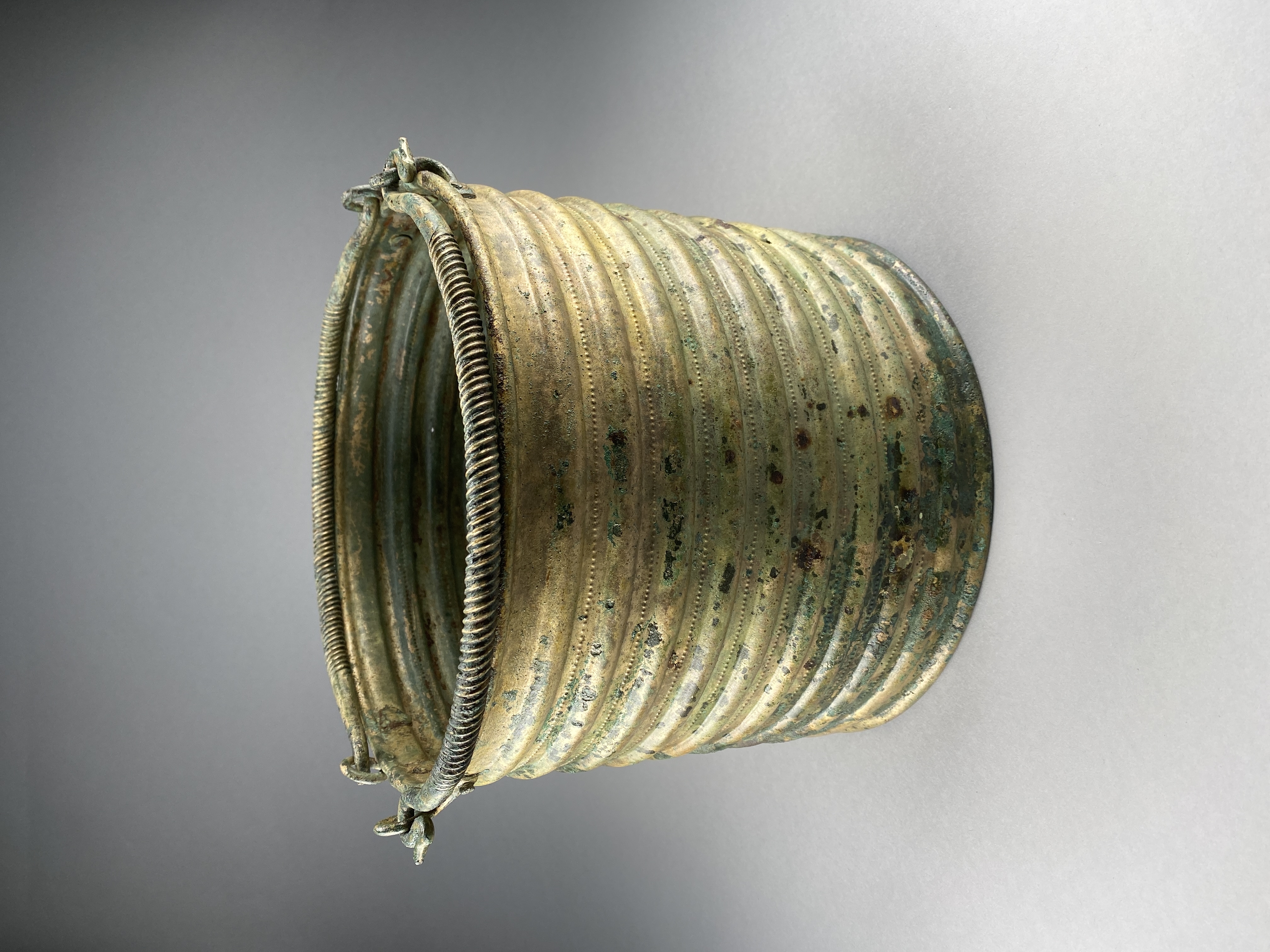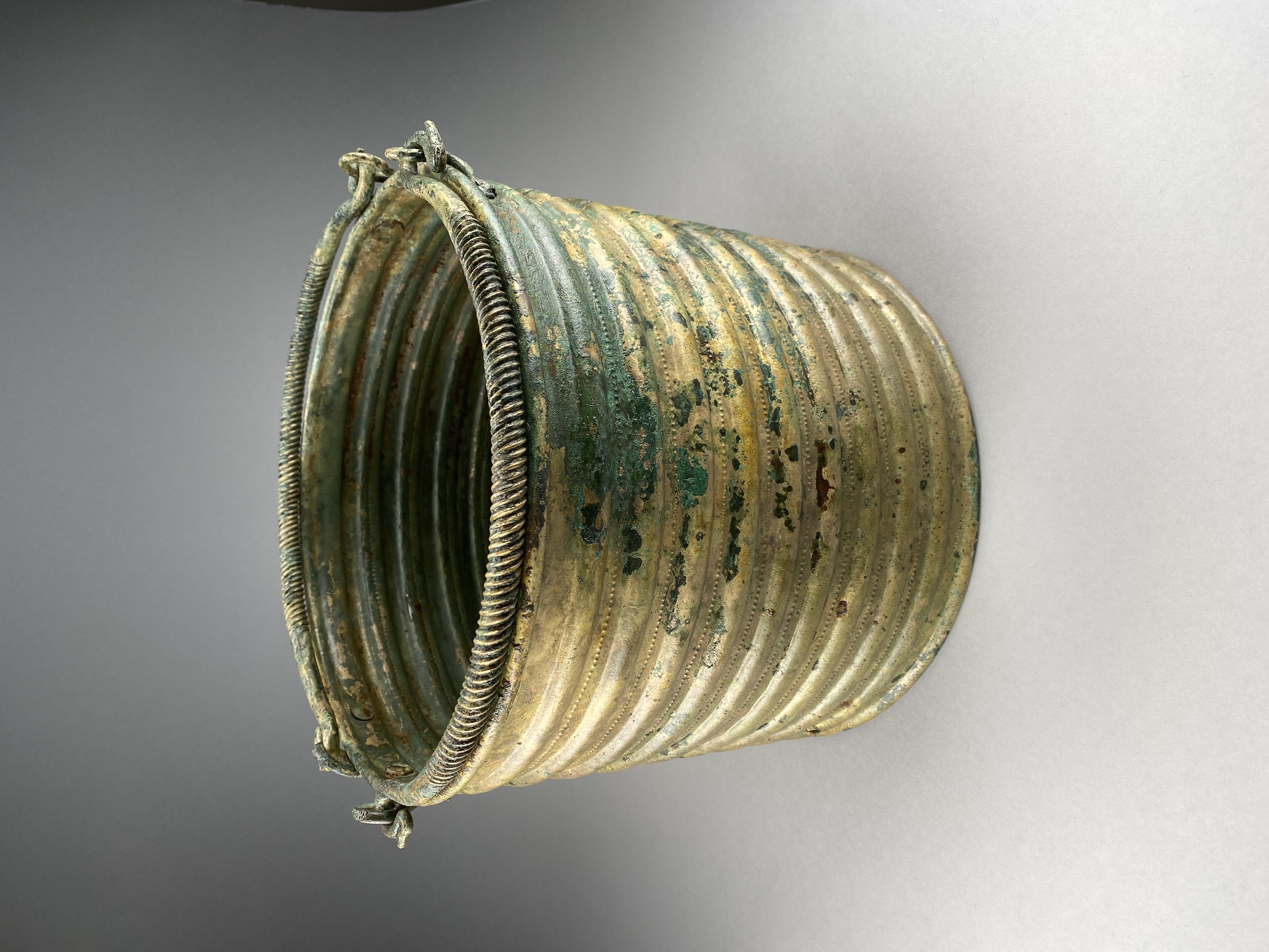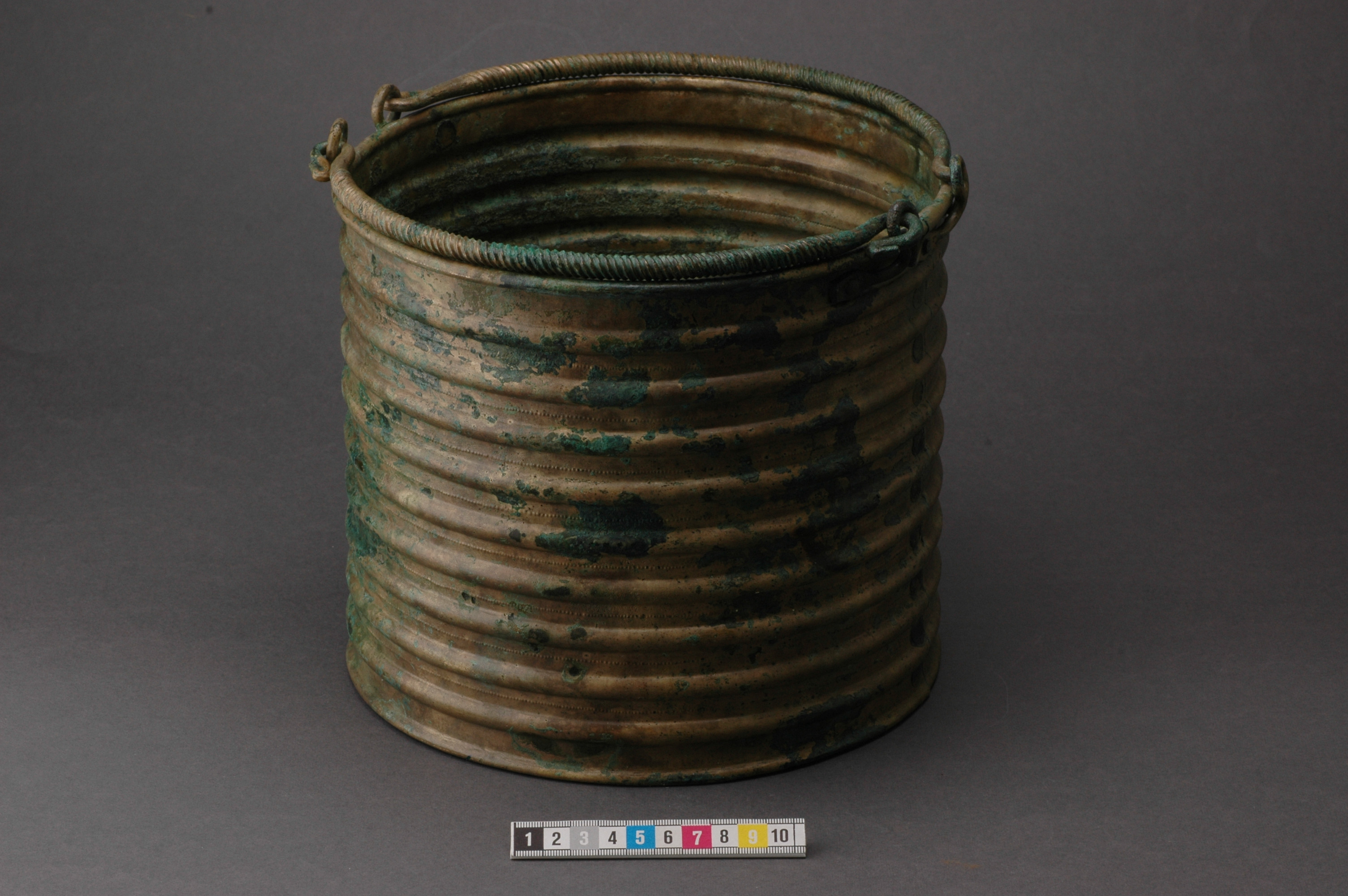 Ciste a cordoni eller Rippenzisten. Ett ämbar av brons, nästan identiskt lika drivna med nio kraftiga vulster och mellan dessa rader av drivna punkter. Botten är särskilt fastsatt med stöd av den invikta nederkanten. Bottens ornamentik består av ett kraftigt ringformat parti och i mitten cirklar kring en mot kärlets insida uppdriven buckla. Dubbla hankar med ensidig räfflad ornering samt avslutade med stiliserade fågelhuvuden. Hankfästena är gjorda av en bronsten, fäst med tre nitar. Mitt för ena hankfästet är ämbaret sammanfogat med en rad stora nitar med platta huvuden.