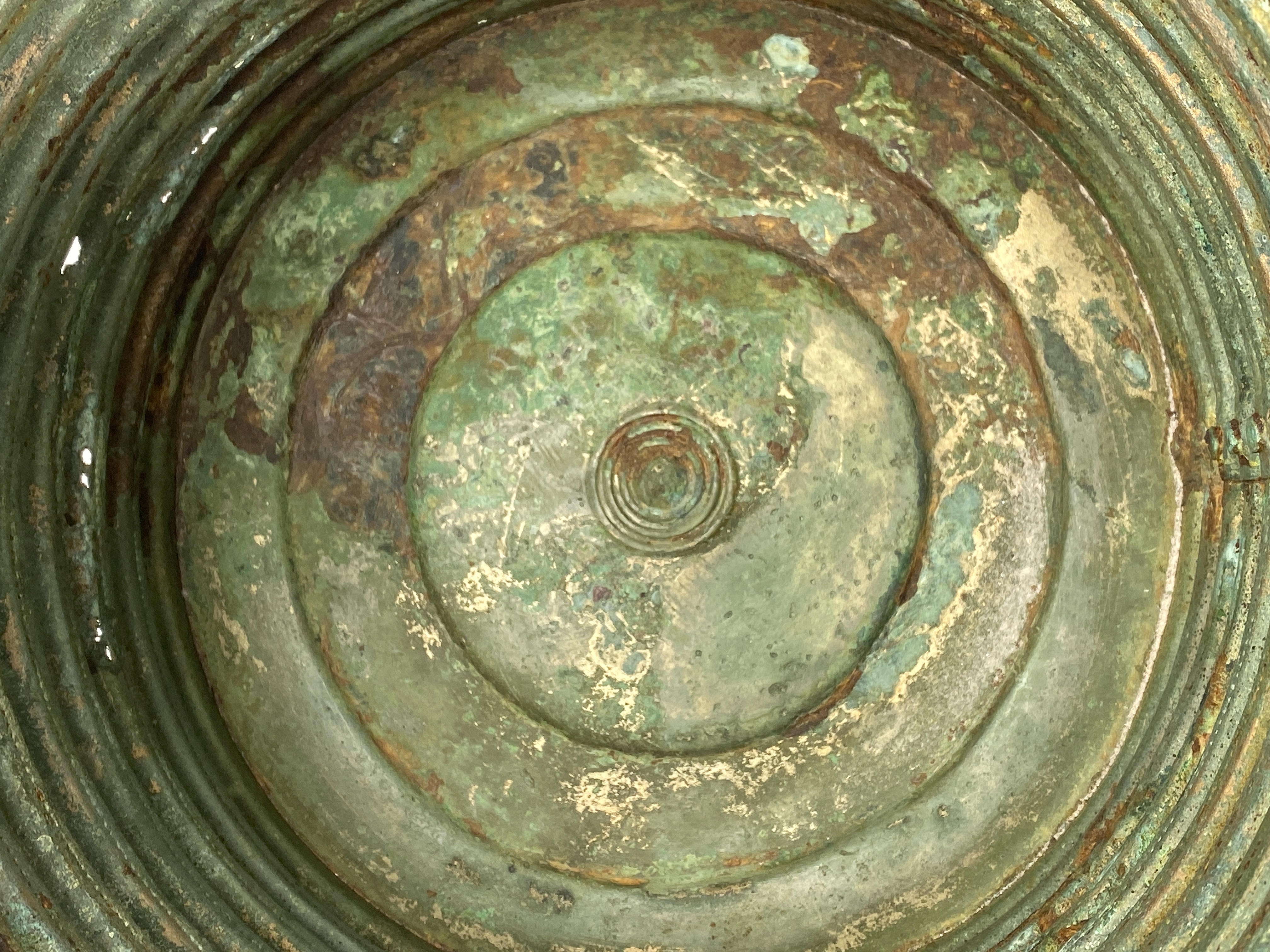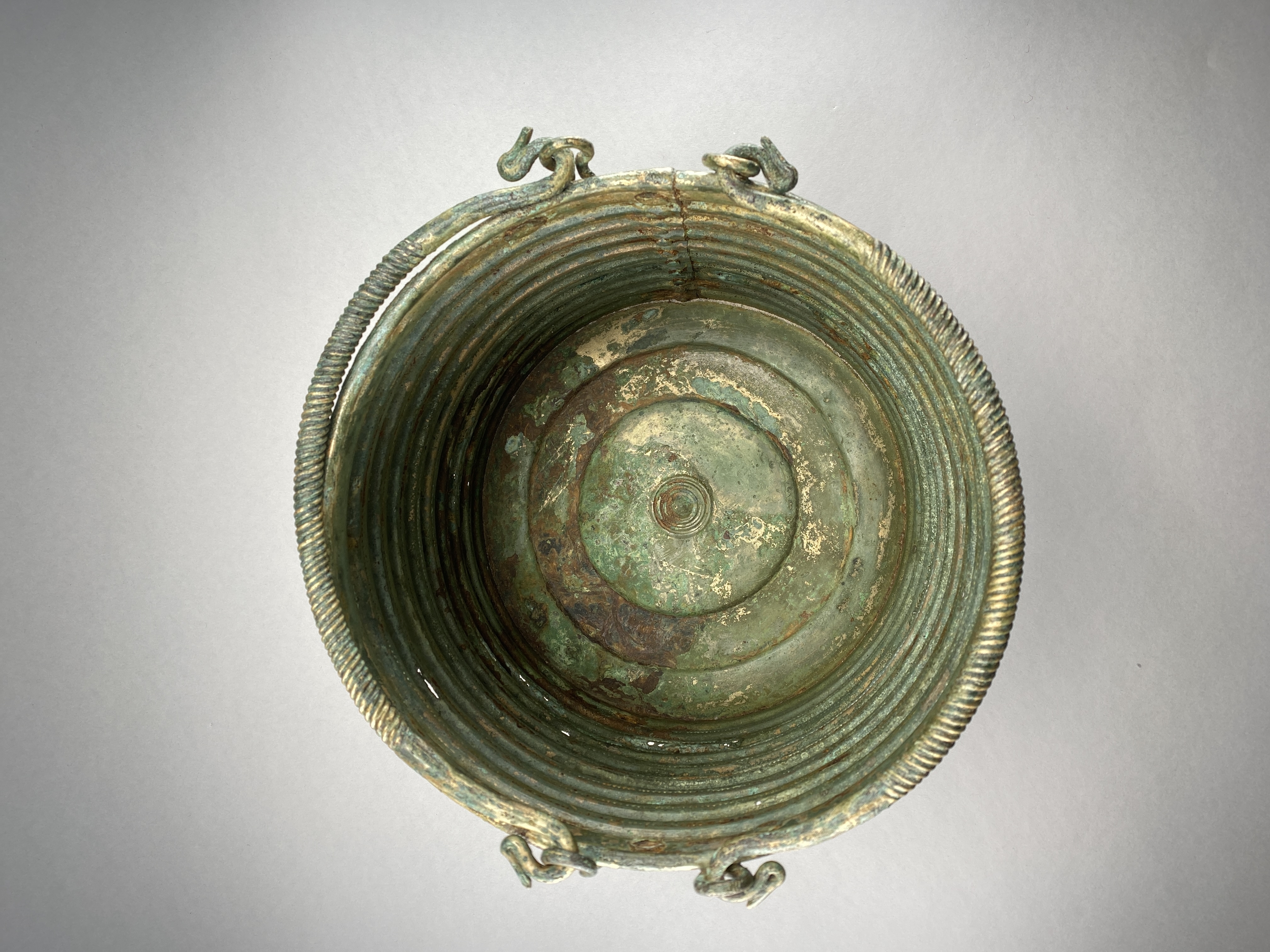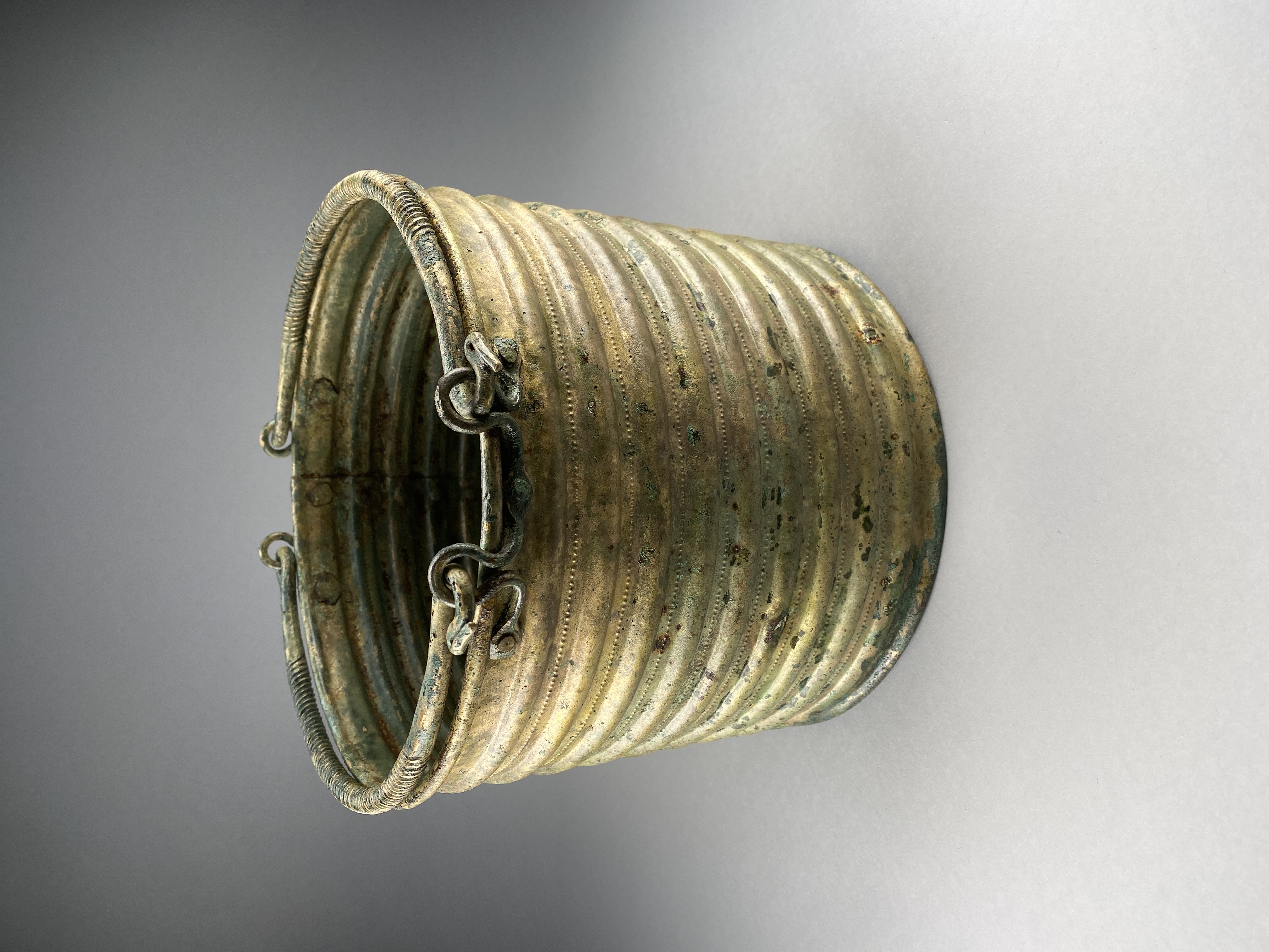 Ciste a cordoni eller Rippenzisten. Ett ämbar av brons, nästan identiskt lika drivna med nio kraftiga vulster och mellan dessa rader av drivna punkter. Botten är särskilt fastsatt med stöd av den invikta nederkanten. Bottens ornamentik består av ett kraftigt ringformat parti och i mitten cirklar kring en mot kärlets insida uppdriven buckla. Dubbla hankar med ensidig räfflad ornering samt avslutade med stiliserade fågelhuvuden. Hankfästena är gjorda av en bronsten, fäst med tre nitar. Mitt för ena hankfästet är ämbaret sammanfogat med en rad stora nitar med platta huvuden.