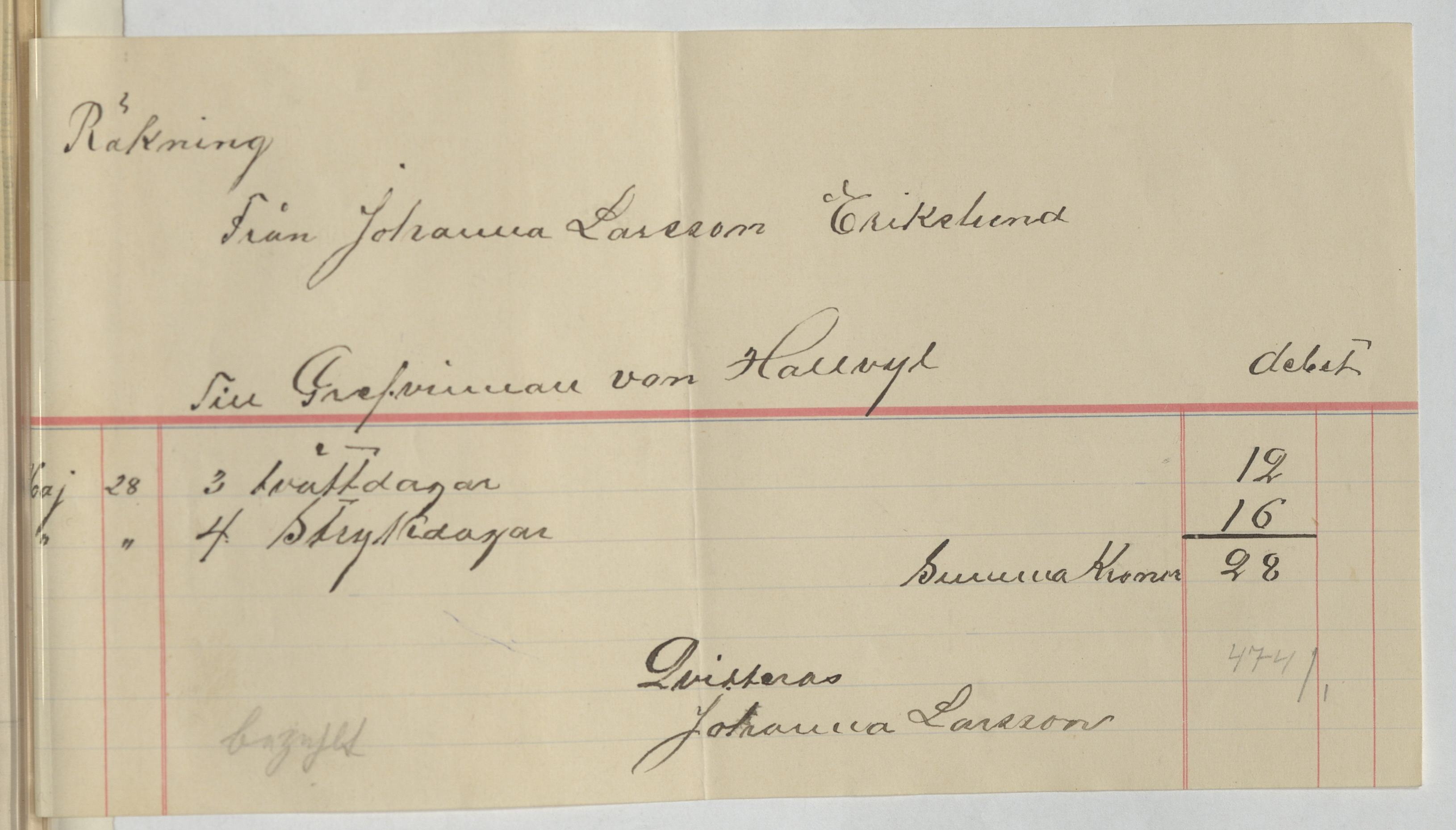 Kvitto från Johanna Larsson vid Erikslund. Gällande 3 tvättdagar och 4 strykdagar.