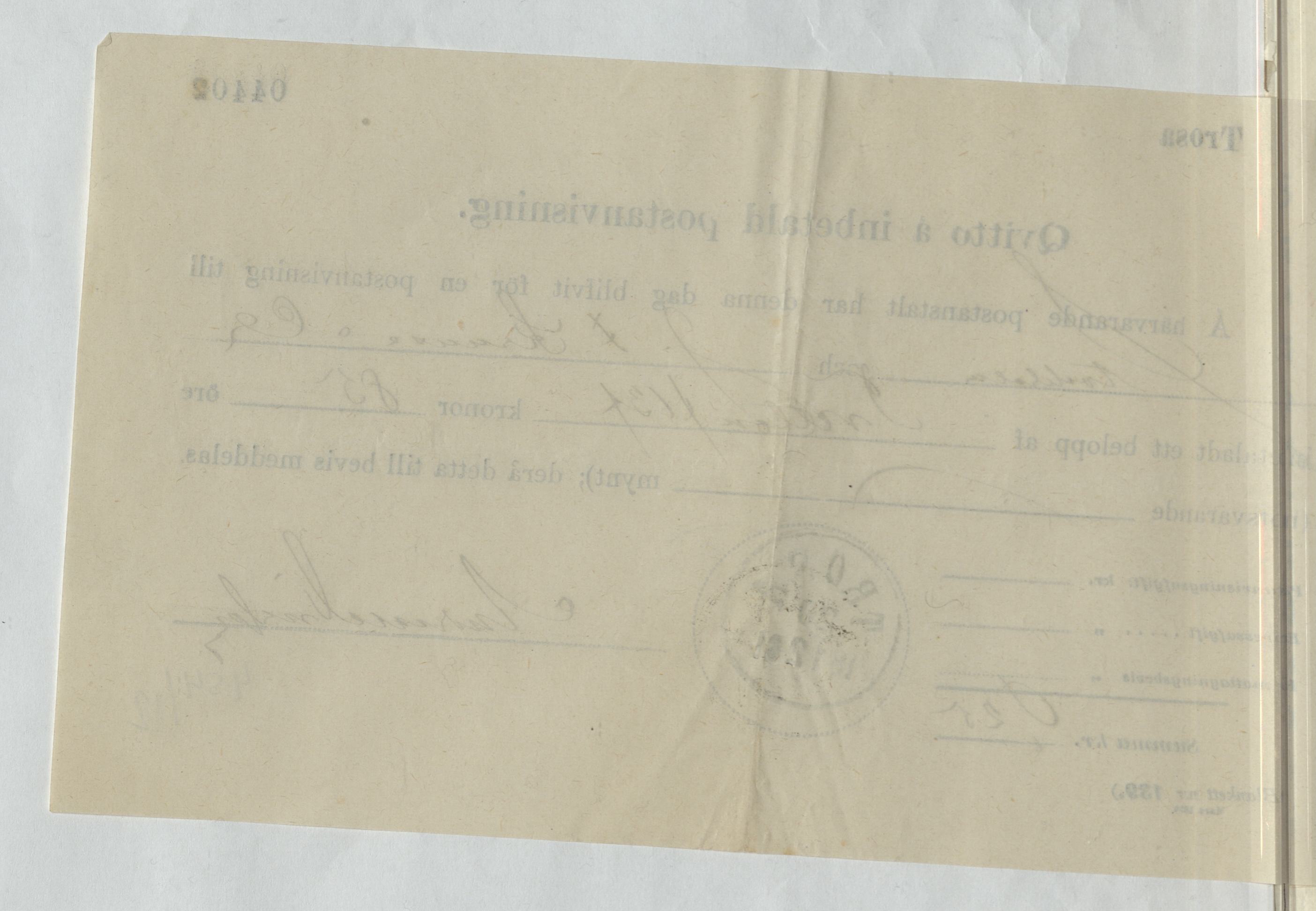 Kvitto för inbetald postanvisning gällande J. F. Kruuse & Co