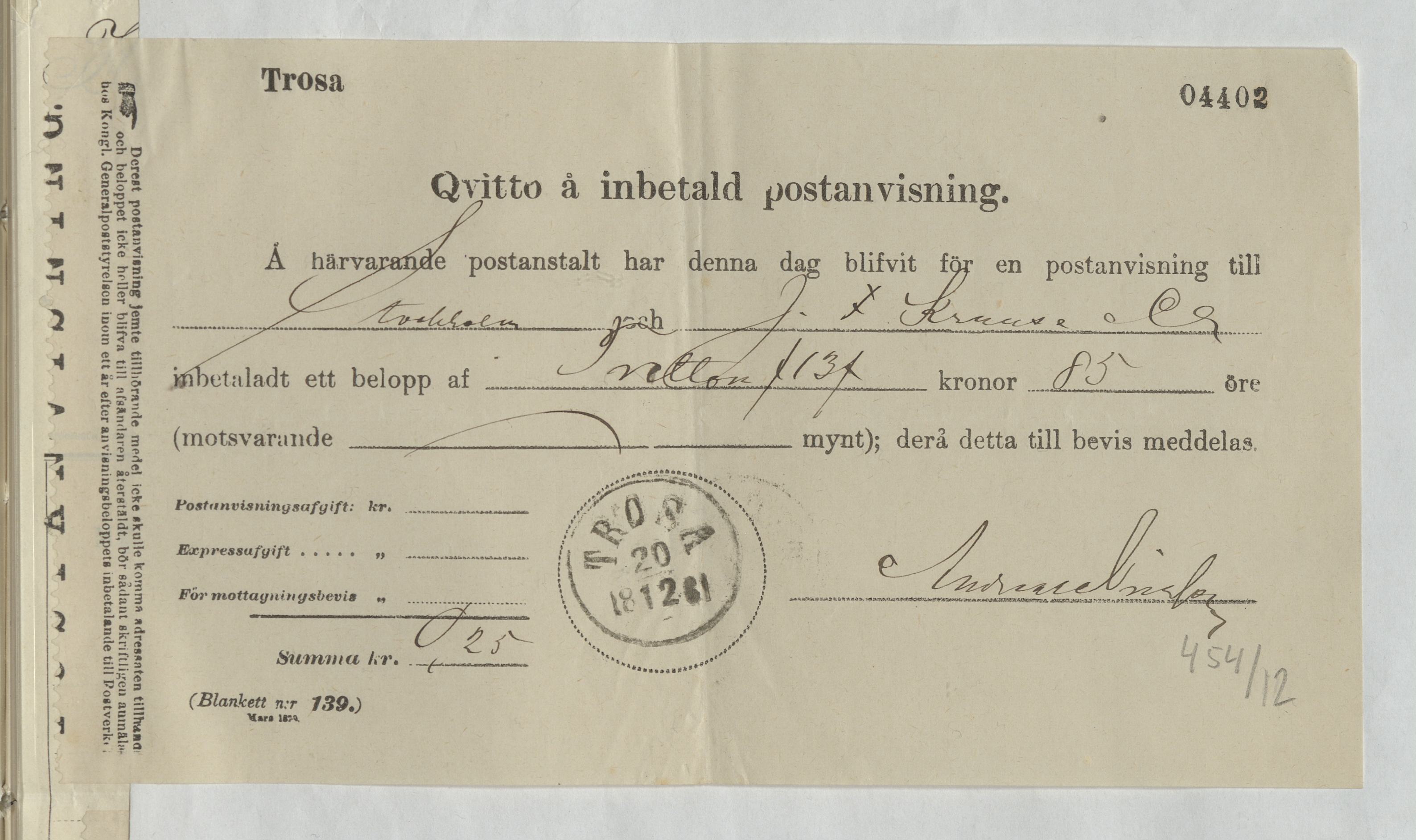 Kvitto för inbetald postanvisning gällande J. F. Kruuse & Co. Stockholm, 1881.