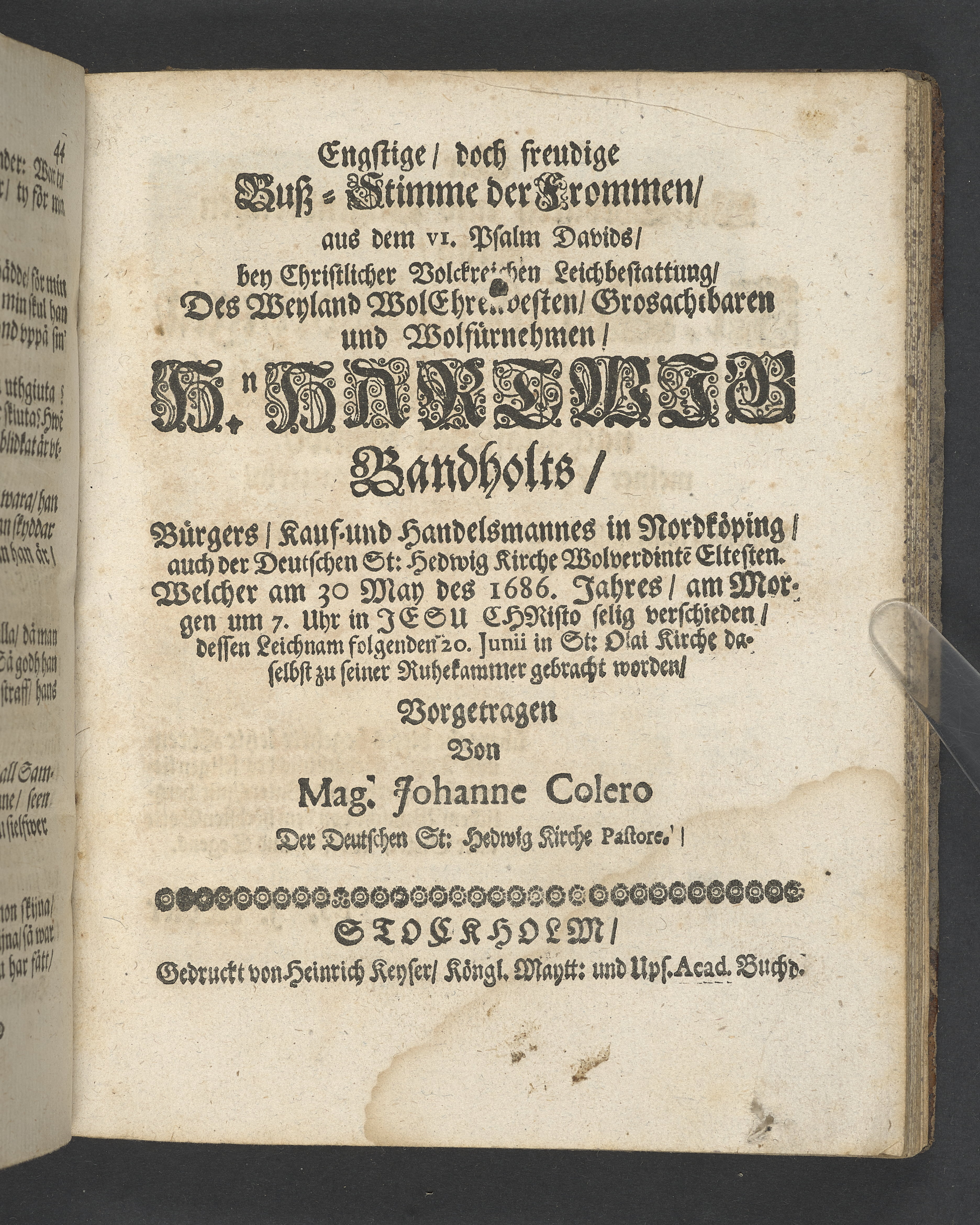 Engstige, doch freudige Buß-Stimme der frommen, aus dem VI. Psalm Davids, bey christlicher Volkreichen Leichbestattunf, des weyland wolehrenvesten, grosachtbaren und wolfürnehmen, HnHartwig Bandholts, Bürgers, Kauf- und Handelsmannes in Nordköping, auch der Deutschen St:Hedwig Kirche wolverdinte Eltesten. Welcher am 30 May des 1686. Jahres, am Morgen um 7. Uhr in Jesu Christoselig verschieden, dessen Leichnam folgenden 20. Junii in St: Olai Kirche daselbst zu seiner Ruhekammer gebracht worden, vorgetragen von Mag. Johanne Colero der Deutschen St: Hedwig Kirche Pastore. Stockholm, gedruckt von Heinrich Keuser, königl. Maytt: und Ups. Acad. Buchd.