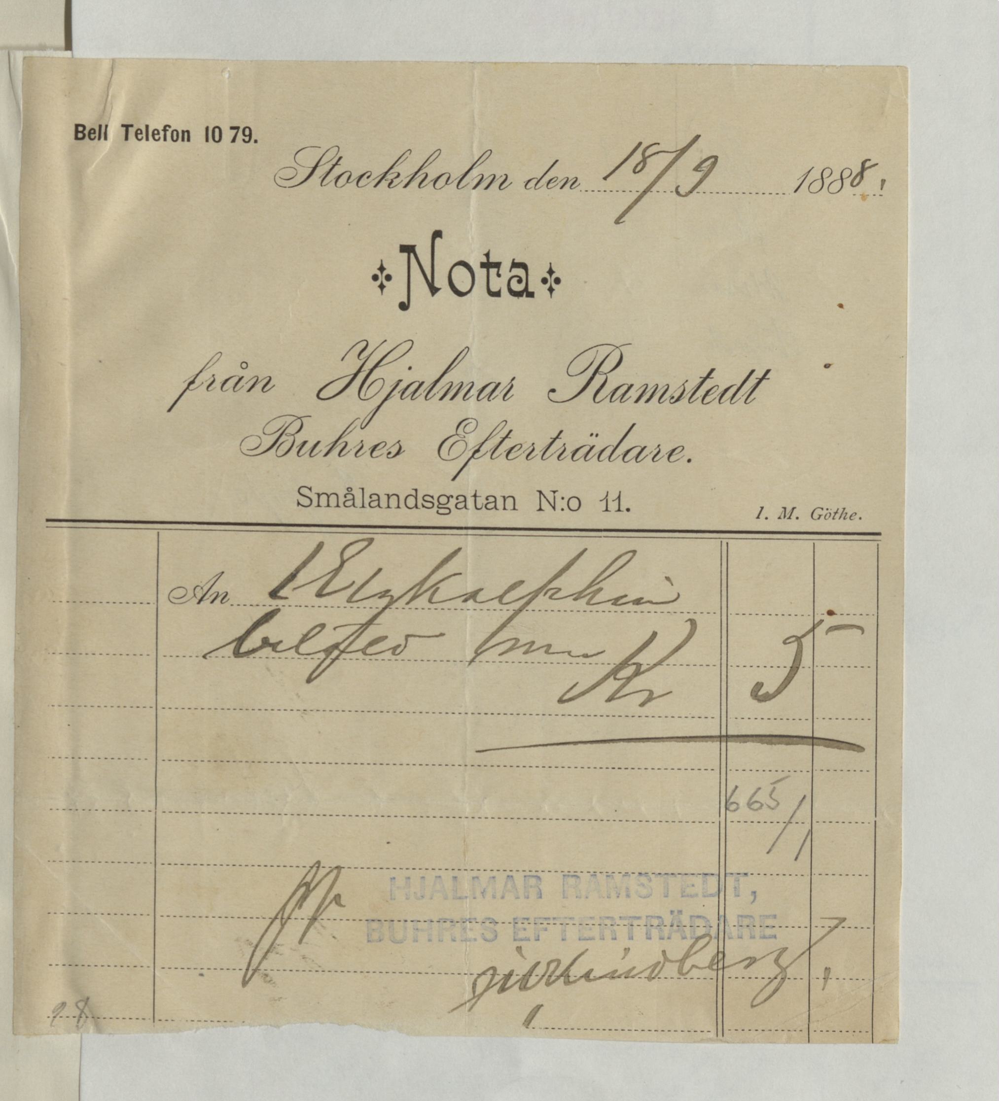 Kvitto från Hjalmar Ramstedt, lädervaror, på 5Kr. Betalt Stockholm, 18 september 1888.
