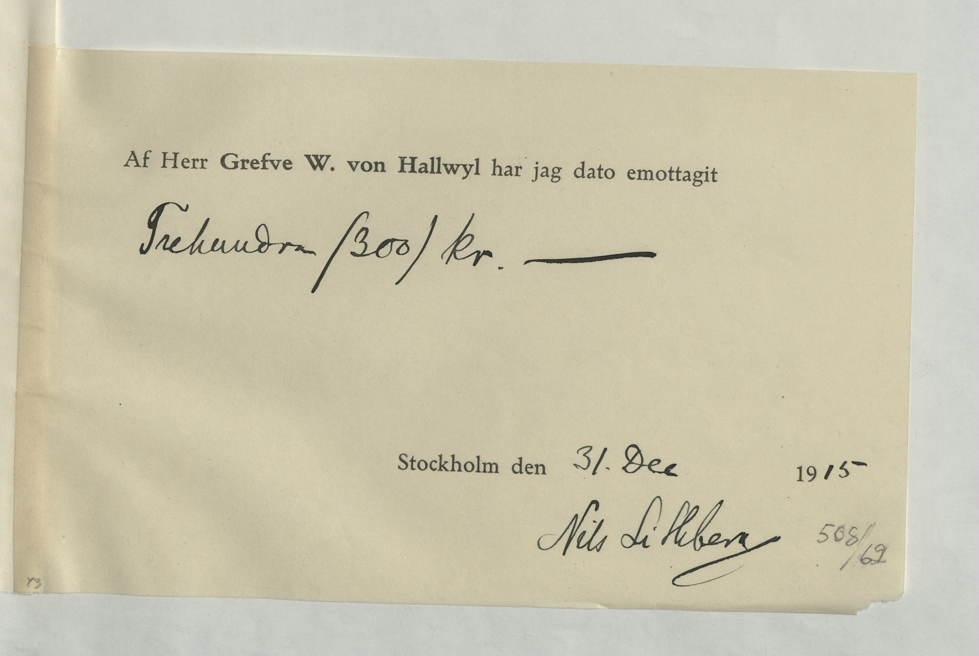 Emottagande av arvode från greven Walther von Hallwyl till Nils Lithberg, 31 december 1915.