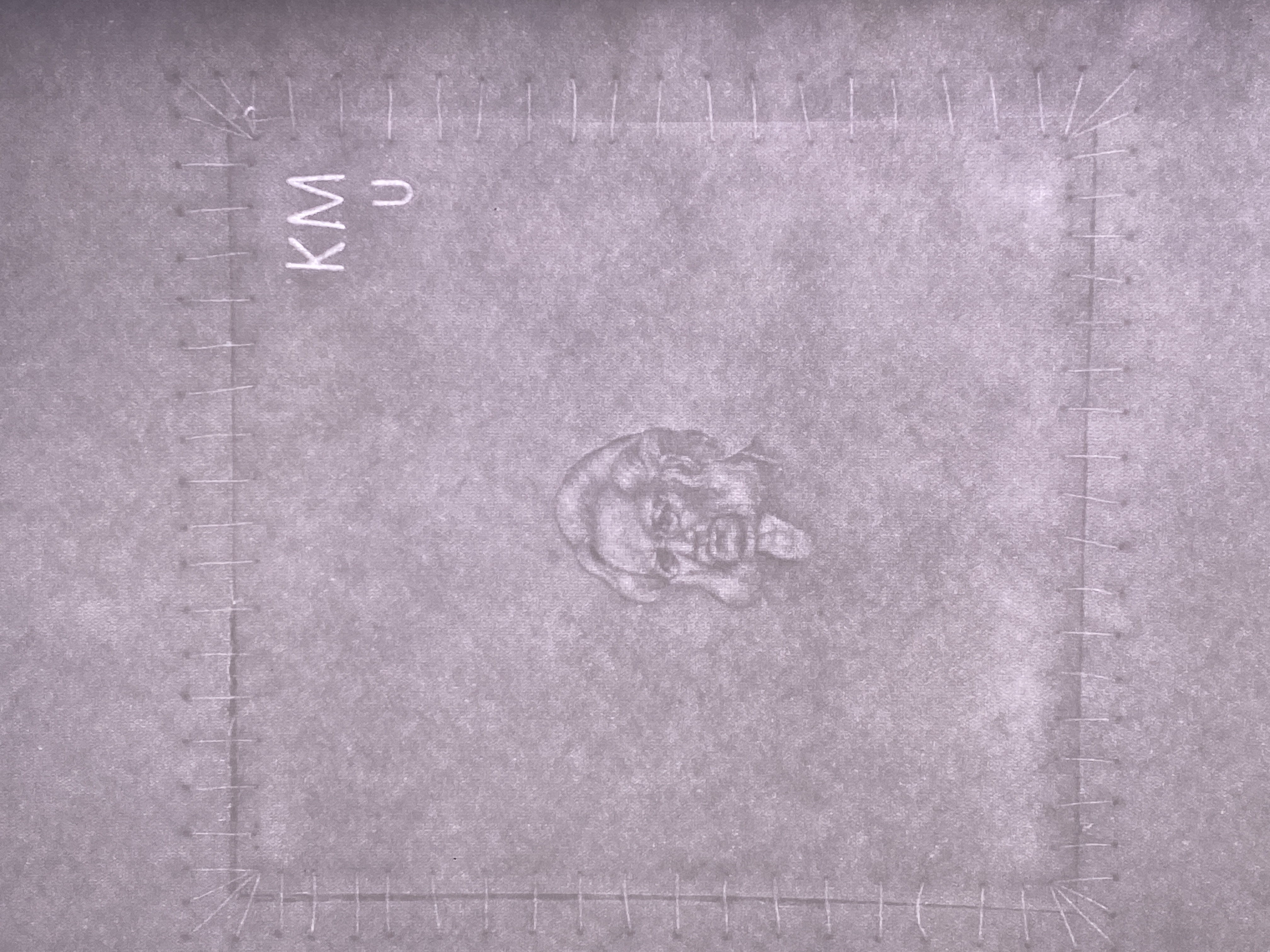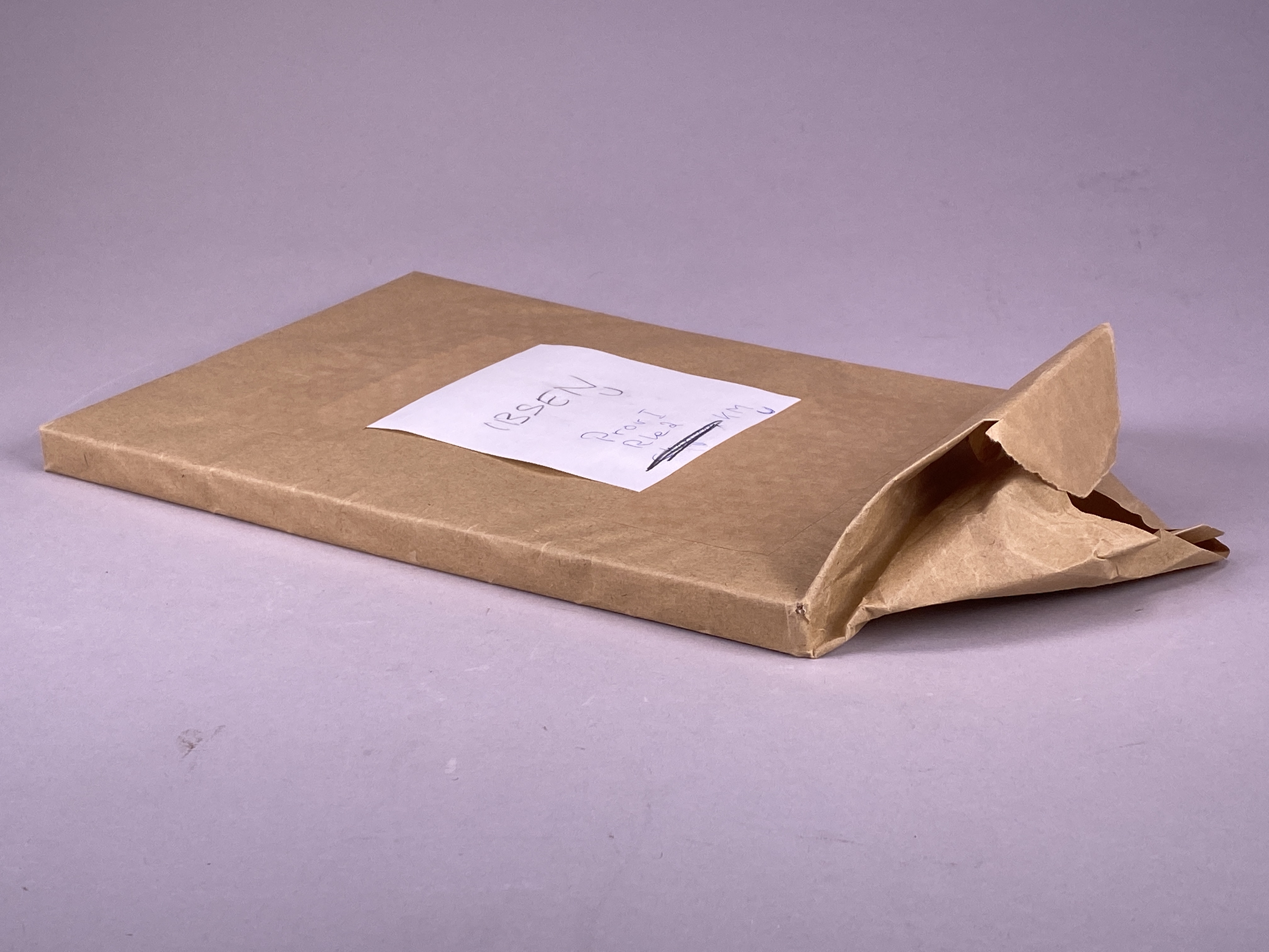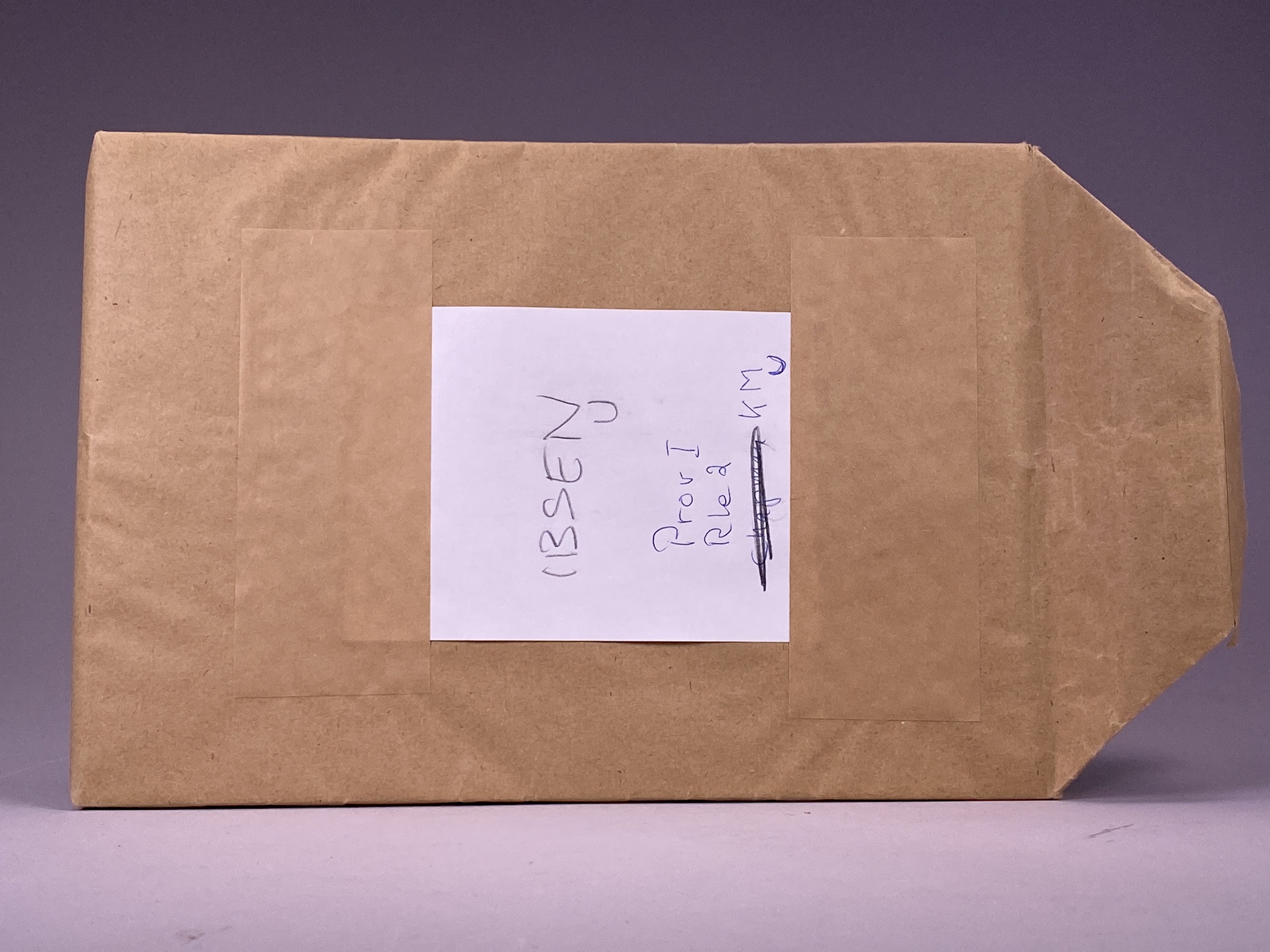 Paket av brun papp innehållandes ett flertal pappersark tillverkade på Tumba bruk. Vita pappersark med vattenmärke föreställande Henrik Ibsen (1828-1906) innanför en ram av stygn, samt bokstäverna "KM U". Omslaget med vit etikett märkt: "IBSEN U Prov 1 Rel 2 KM U".
