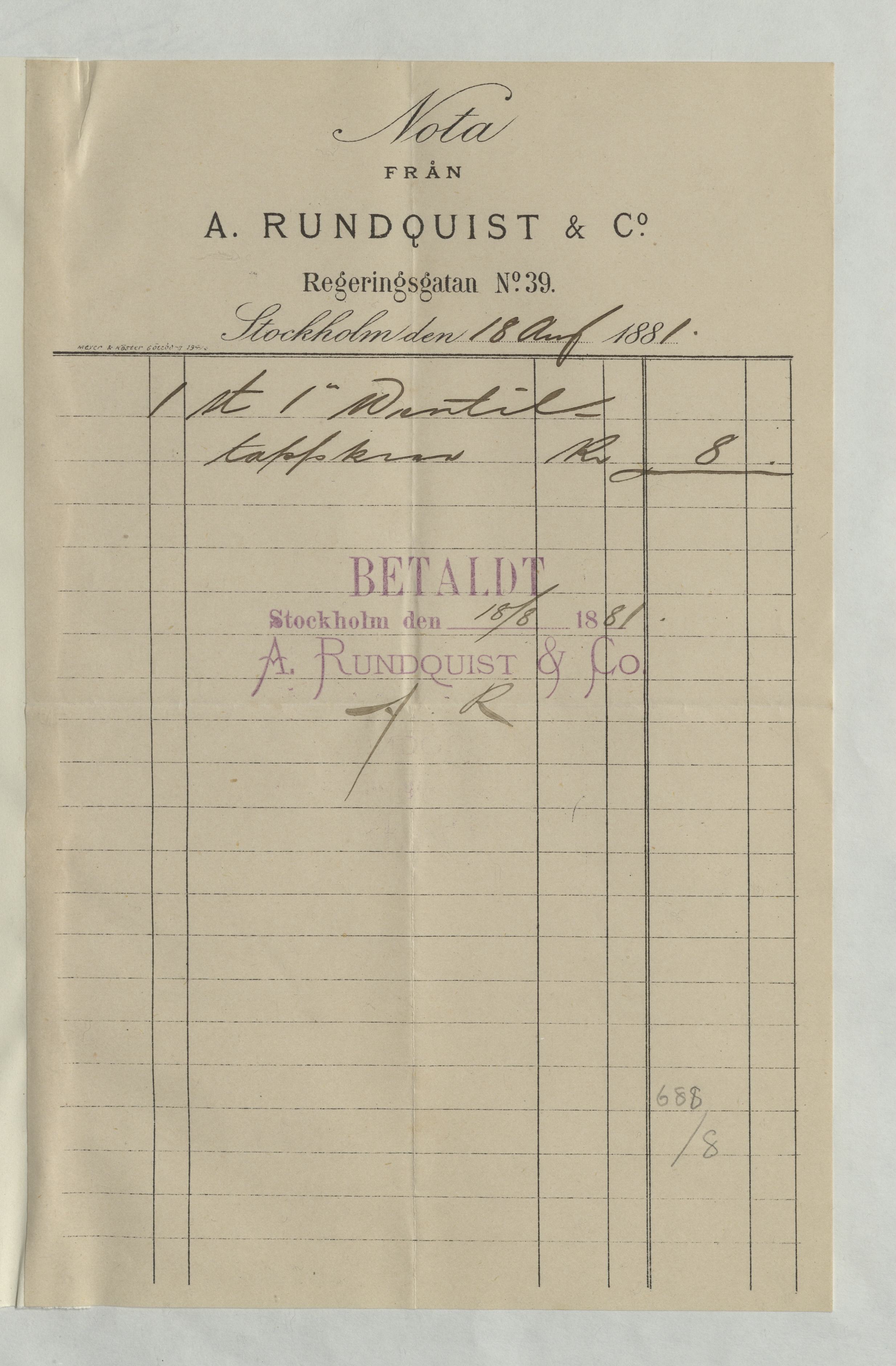 Kvitto från A. Rosberg & Co, ang "rörarbeten", till Greve W. von Hallwyl på Erikslund. Totalsumma 8Kr. Stockholm 18 augusti 1881.