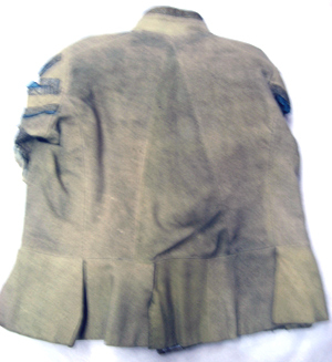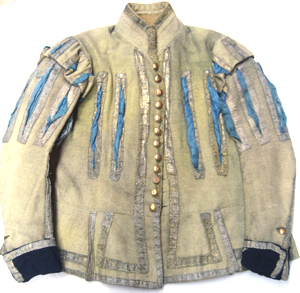 Jacka av gult kläde garnerad med guldgaloner samt med långa slitsar, kantade av guldgaloner och med blå sidenplösar. Knäppningen består av tolv runda, släta, förgyllda mässingsknappar med en kärna av trä. Jackan har en ståndkrage, h. 70 mm, garnerad med guldgalon. Ärmarna är långa, sydda av två stycken med sömmarna täckta av guldgaloner samt med guldgaloner lagda i ränder. Vid ärmsluten är uppvikt breda slag av svart kläde, b. 70 mm. I yttersömmen, vid ärmslutet, förekommer ett sprund, l. 130 mm. Sprundet kantas av en knäppning bestående av två knappar av samma sort som föregående. Slag och sprund kantas av smala guldgaloner. Över ärmhålssömmen är försett med axelkarmar med slitsar. Ryggstycket är formsytt, tillskuret av tre delar. Jackan är sydd med en midjesöm från vilken bildas ett skört med åtta trapetsformade skörtkappor, kantade med guldgalon. Jackan är på insidan fodrad med gråvit twills samt med vit linnelärft. Ärmar, skörtkappor samt framstyckenas framkanter, är fodrade med gul linnelärft. I fodret är på vänster framstycke iskuret en horisontell ficka, l. 200 mm.