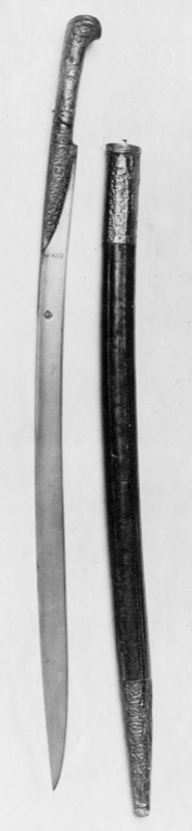 Fäste av silver med kantbårder och längsgående bårder av niello samt på ut- och insidan en utdragen rektangel med graverade rankor. 15 mm bred holk med tvärgående bårder av niello, från denna över klingbasens rygg ett konturerat, snett utskjutande beslag med samma ornering som fästet i övrigt. Ett parti närmast holken med förgyllda rankor. Klinga med på båda sidors starka del etsade ornament, blommor och rankor samt på insidan skrivtecken samt två runda stämplar (se inv.1867), på utsidan blom- och rankornament.