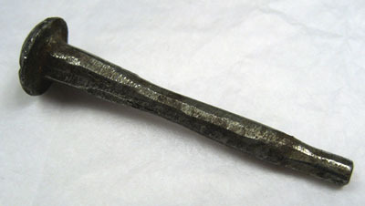 Tillverkad i blankt stål. Cirkulär kullrig plattad skalle med spår. Kroppen kraftigt filad och svagt konisk. Gängning saknas.