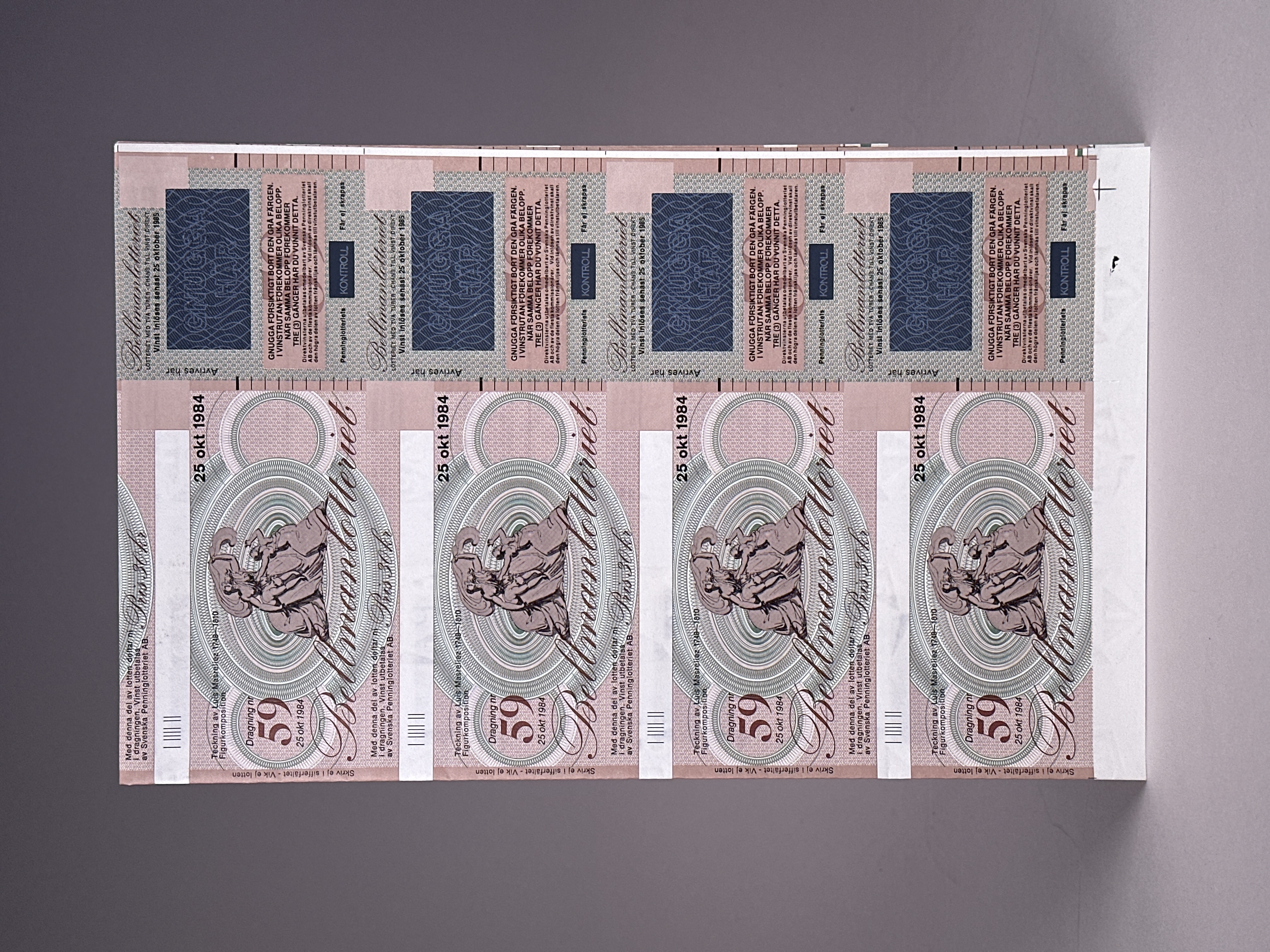 Provark med plats för 28 lotter, vikt. Pris 30 kronor. 59:e dragning, 25:e oktober 1984. Lottens vinstplan presenteras på baksidan av lotten. Motiv: figurkomposition, teckning av Luis Masreliez Färger: brun, grön, svart Märkning: området i det övre högra hörnet är överstruket och markerat med ordet "specimen", även märkt "Y2".