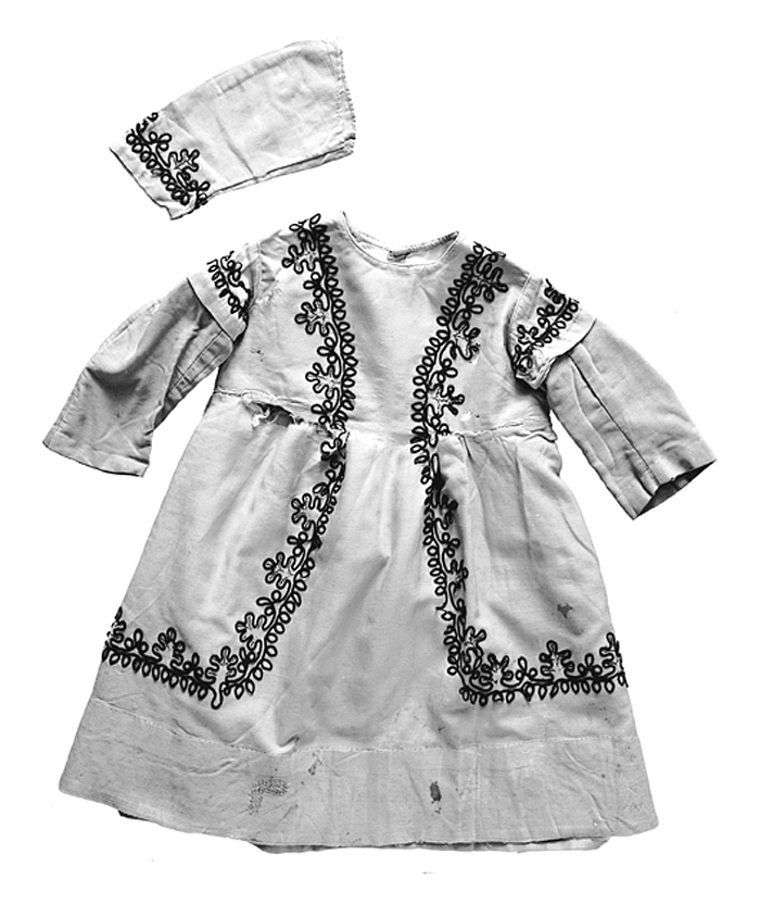 - Af rosafärgadt ylletyg (kaschmir), med broderi af svarta ylleganser. Handsydd. Lif och kjol sammanhängande. Lifvet bestående af ett framstycke och två ryggstycken med raka sidsömmar och svagt sneddade axelsömmar, hopsydda med förstygnssöm. Halsringning rundad, kantad med en snoddad smal snedslå, påsydd med för- och fållstygnssöm af rosafärgadt silke. Lifvet fodradt med crémegult tvåskaftadt bomullstyg. Å ryggstyckenas ytterkanter öfvertyget omviket och fastsydt med fållstygnssöm af rosafärgadt silke. Å ena kanten fyra langettsydda tränsar, tre af gul bomullstråd, en af svart; å motsatta kanten fem hakar af mässing, fyra stora och en liten, fastsydda dels med rosafärgadt silke, dels med svart eller grå bomullstråd. Utanpå samma kant fyra kupiga runda knappar af svart massa, med finstrierad framsida, baksidan starkt kupig och med ett tvärgående hål; knapparna isydda dels med svart, dels med grå bomullstråd. Å baksidan i upphöjdt tryck å ena kanten: S. G. D. G. (»Sans garantie du gouvernement»), å den motsatta: BREVETE; i midten: J E. Ärmarna raka, hopsydda å undersidan med efterstygnssöm af grå bomullstråd. Öfre kanten fastsydd med en kantsnodd samt efter- och kaststygnssöm af rosafärgadt silke; nedre kanten fållad med förstygnssöm af dylikt silke. Lifvets och kjolens framstycken klippta sammanhängande, kjolen med ett bredt motveck, baktill med tre breda veck samt tätt rynkad vid sprundet. Kjolen bestående af två raka våder, hopsydda med förstygnssöm af rosafärgadt silke. Å bakvådens midt ett sprund med fållade kanter. Kjolens öfre kant fastsydd vid lifvets nedre kant med en kantsnodd samt för- och kaststygnssöm af svart eller rosafärgadt silke. Å afvigsidan ett bredt hvitt fyrskaftadt bomullsband, hvars nedre kant fastsydd samtidigt med sistnämnda söm. Å kjolens nedre kant en skoning af tyg som liffodret, öfre kanten fastsydd med förstygnssöm af svart silke, den nedre med fållstygnssöm af hvitt silke. Broderiet å lifvets framstycke sammanhängande med det å kjolens framvåd och bestående af ganser i två jämlöpande rankor, den ena med mönster af tätt sittande ovala öglor, den andra med eklöf, omväxlande med tre ovala öglor; löfven ådrade med kråksparkssöm af svart silke. Broderiet gående från axelsömmarna snedt nedåt öfver lifvets framstycke, å kjolen snedt utåt och nedåt, markerande en sneddad framvåd; nedtill bården med rundade hörn gående åt sidorna rundt kjolen. Ärmarnas broderi något förminskadt. Ganserna påsydda med förstygnssöm af svart silke. Under de korta ärmarna ett par släta sneddade långa ärmar af dylikt tyg, fastsydda med förstygnssöm af rosafärgadt silke. De lösa ärmarna ofodrade, nedtill broderad bård som ofvan. Å hvartdera ryggstycket ett skärp af tyg och med broderi som å ärmarna. I skärpets ena ända tre. hakar af hvit metall, de båda nedre fastsydda med kaststygn af hvit bomullstråd, den öfre med svart dylik tråd; i motsatta ändan tre hyskor af svärtad metall, fastsydda med svart silke och bomullstråd. Längd: 55 cm.; vidd nedtill: 1.6 m. Anm. Å lifvet fattas en träns. Klädningen och de lösa ärmarna mycket nötta, blekta, fläckiga, stoppade och med malhål. Buren af Ebba eller Ellen von Hallwyl åren 1869 och 1870.