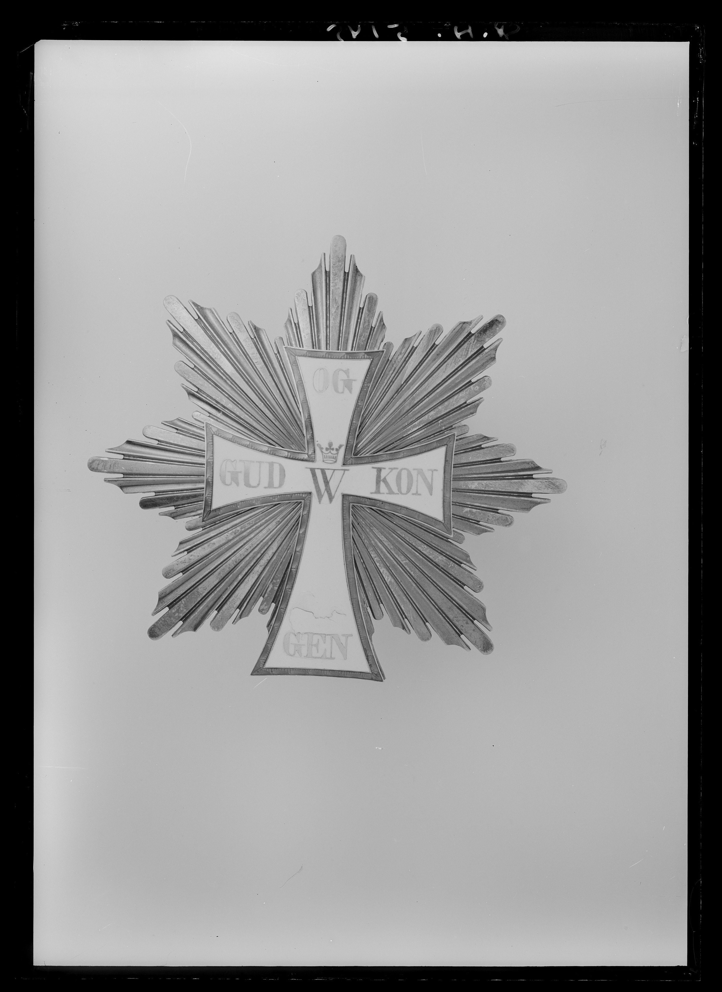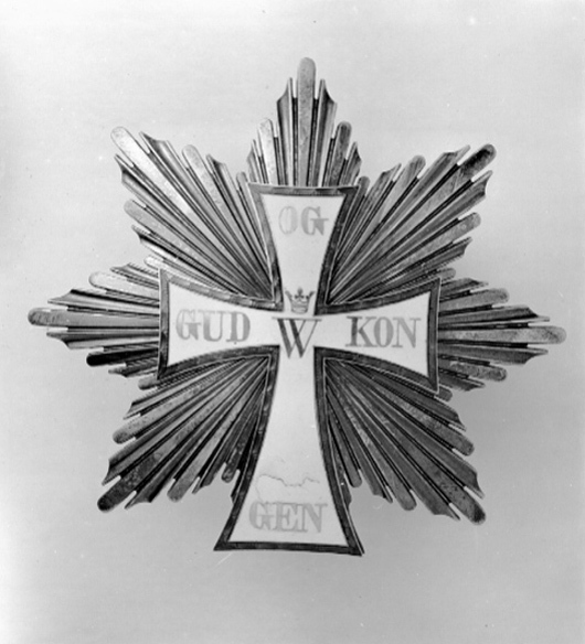 Sjuuddig strålstjärna av silver, omväxlande platta strålar med rundade ändar och skålade strålar. Stjärnan belagd med vitemaljerat utböjt latinskt kors med rödemaljerade kanter. I korsmitten monogram av guld, krönt med öppen krona: W. På korsarmarna guldtext: "GUD OG KONGEN". Korset fastskruvat med fem runda muttrar på kraschanens baksida. Säkerhetsnål med dubbla nålar. Vid nålen pappersetikett med nummer: 5145 (SHM-nr).