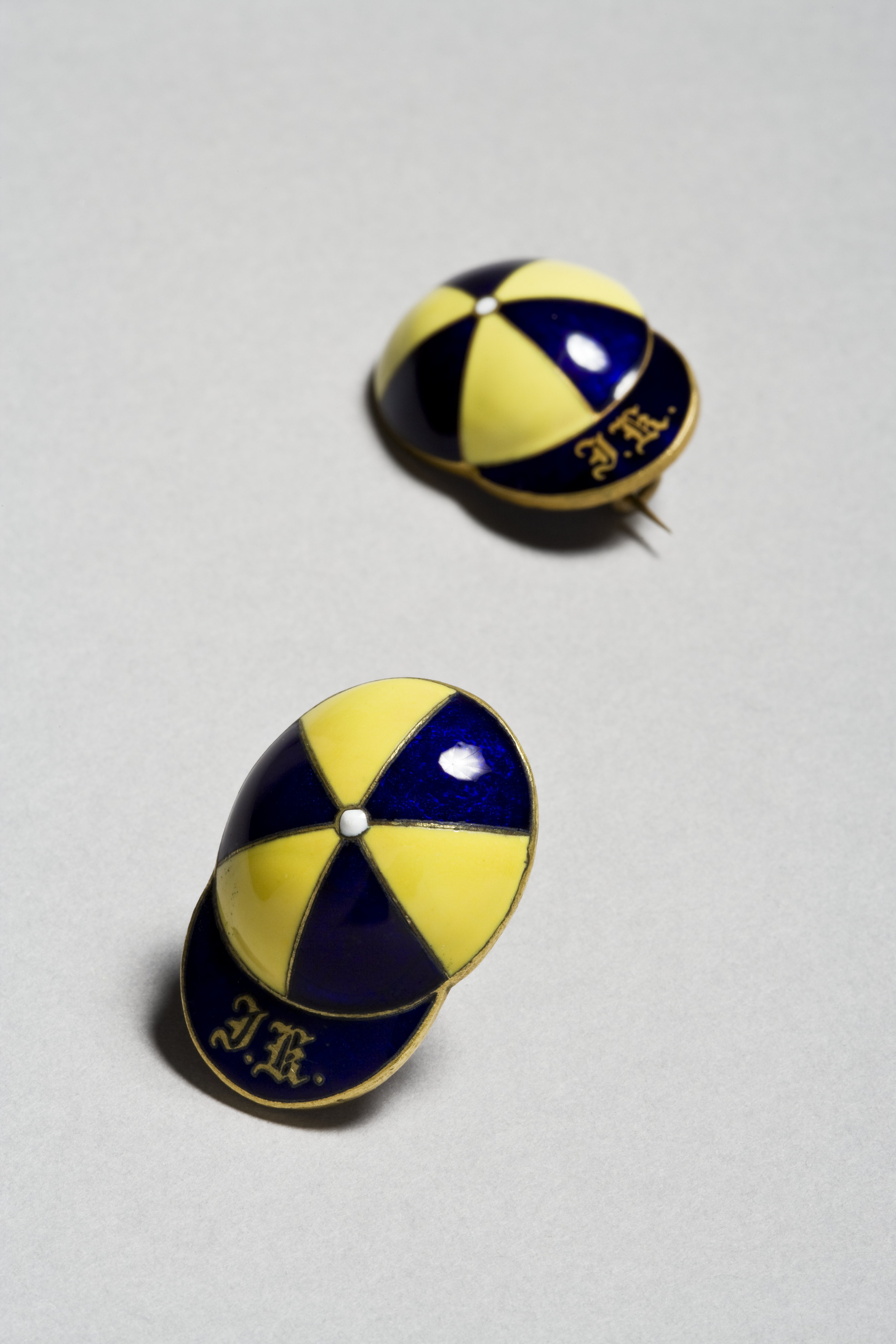 Märke i form av jockeymössa av emaljerad och förgylld koppar, på kullen tre blå och tre gula kilar, mitt på kullen knapp av vit emalj. Skärm, täckt på ovansidan med blå emalj, däri i frakturstil: "J.K." Baksidan ej förgylld, vertikalt placerad säkerhetsnål.