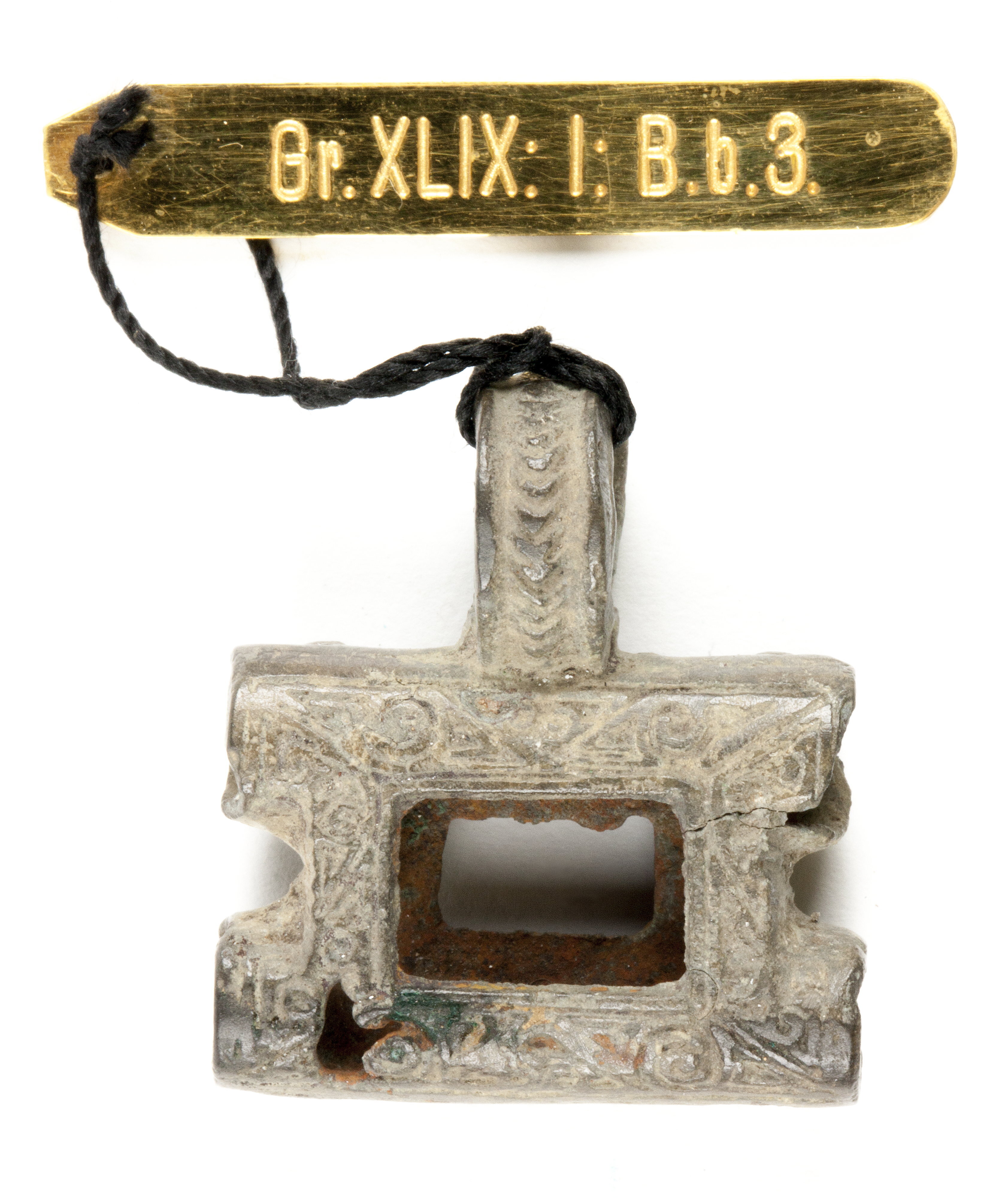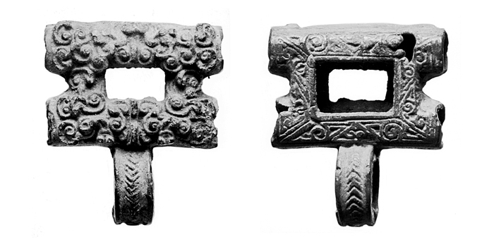 Del av hästmundering. Bestående av två intill varandra liggande cylindriska hylsor förenade med två breda, korta stolpar. Från ena hyslans mitt utgår en rund, bred ögla. På hylsornas framsidor en symmetrisk ornering av spiraler och knoppar i hög relief. På baksidorna en ornering av snedgående, smala spiraler, slutande i vinkelspetsar. Höjd: 3,3 cm,: bredd: 2,9 cm.