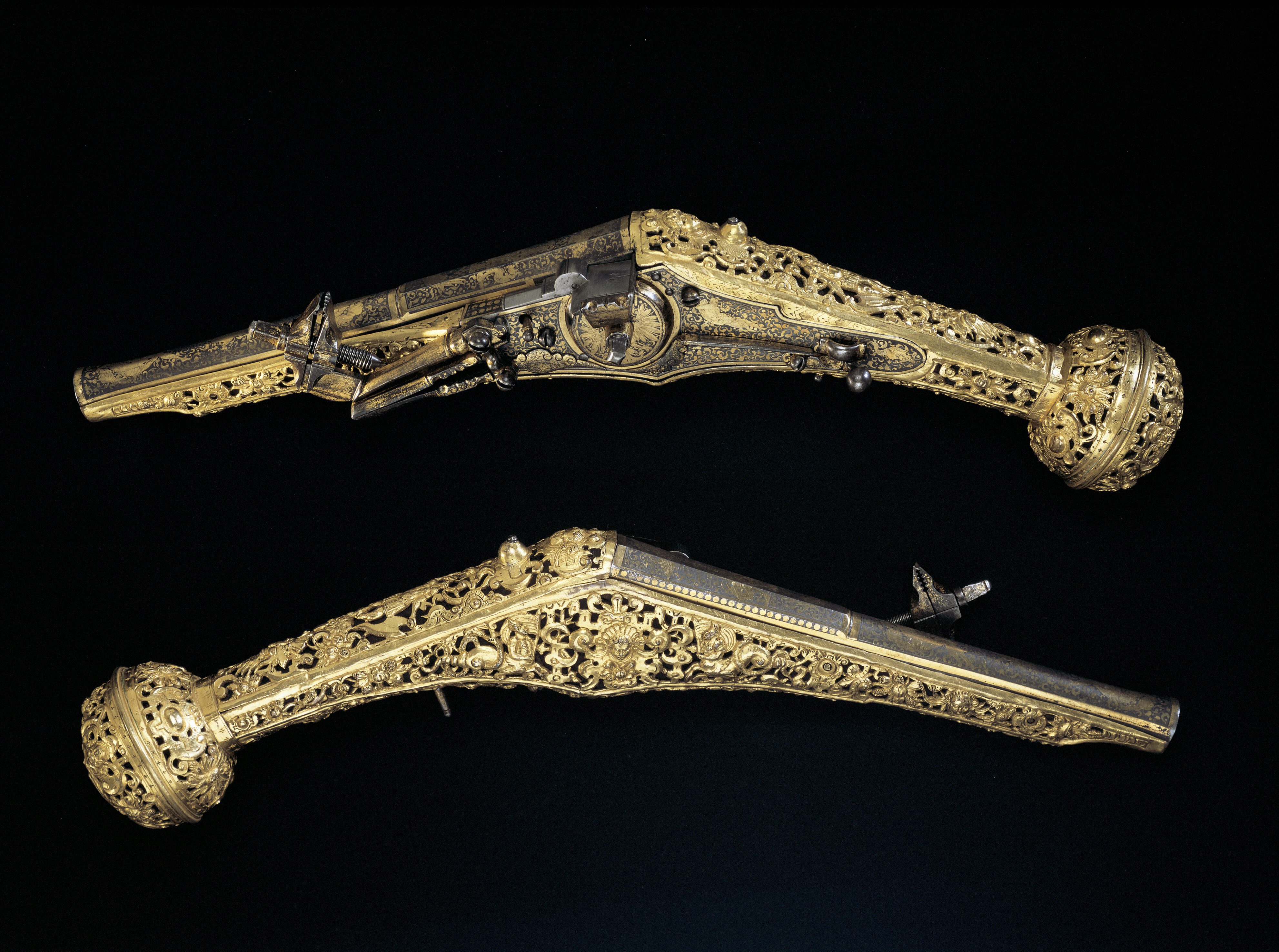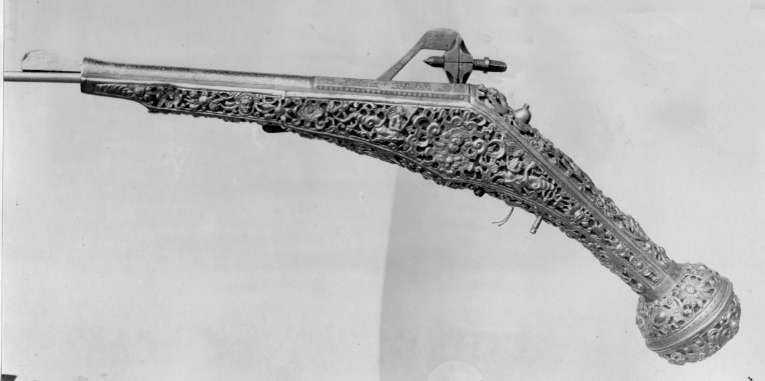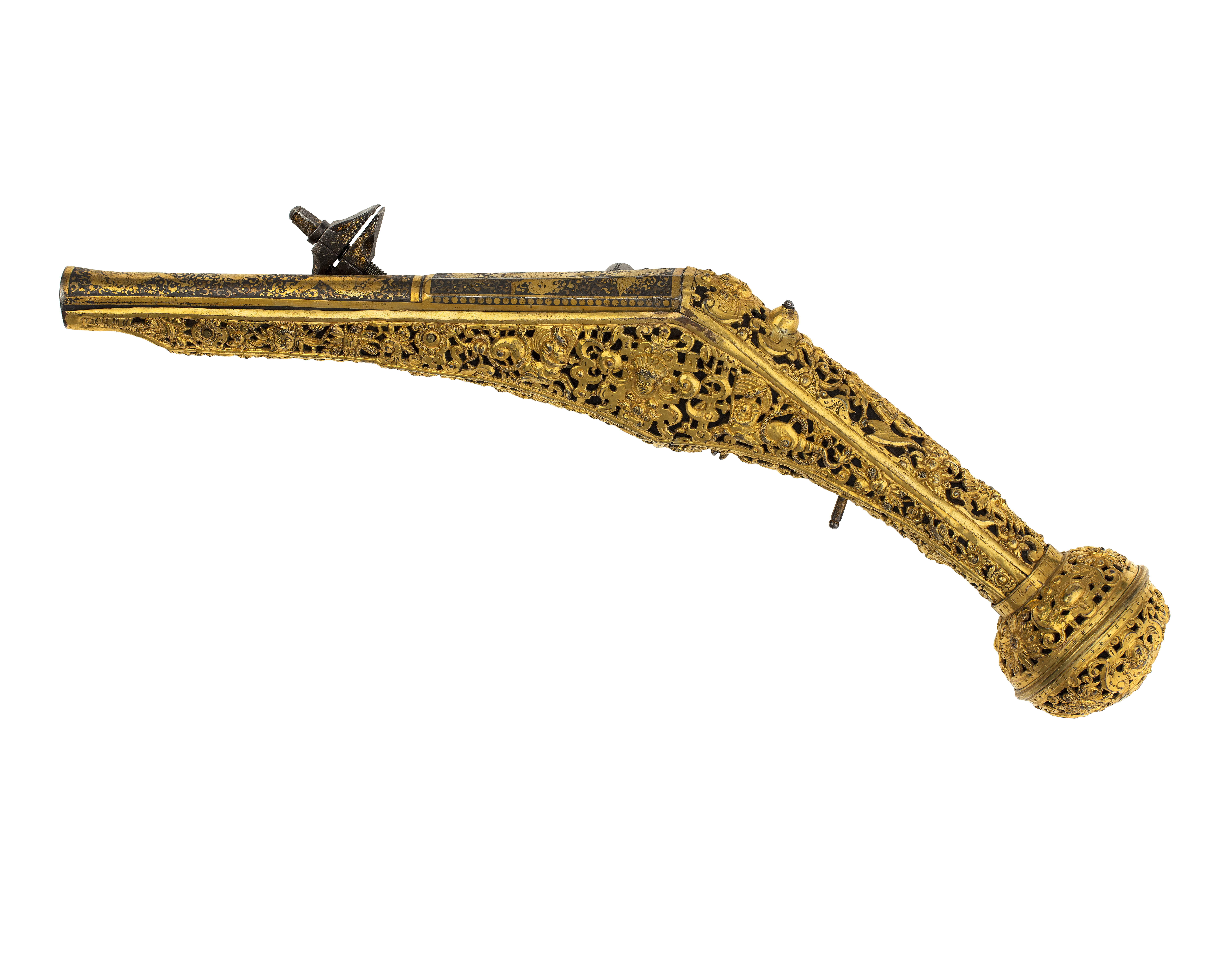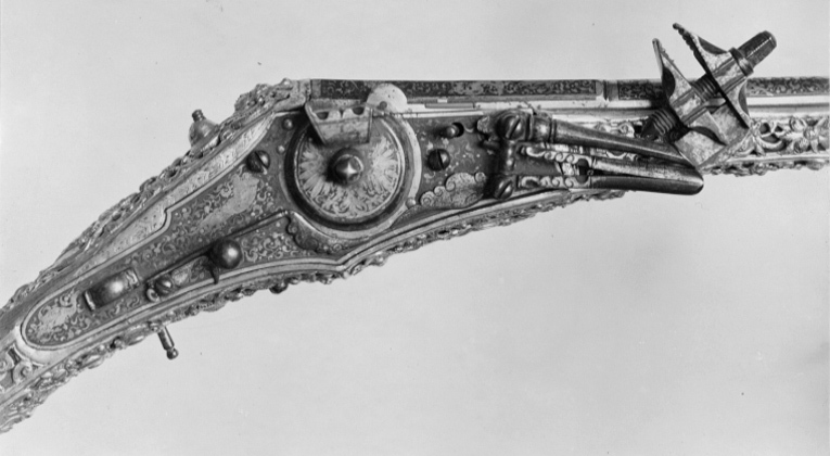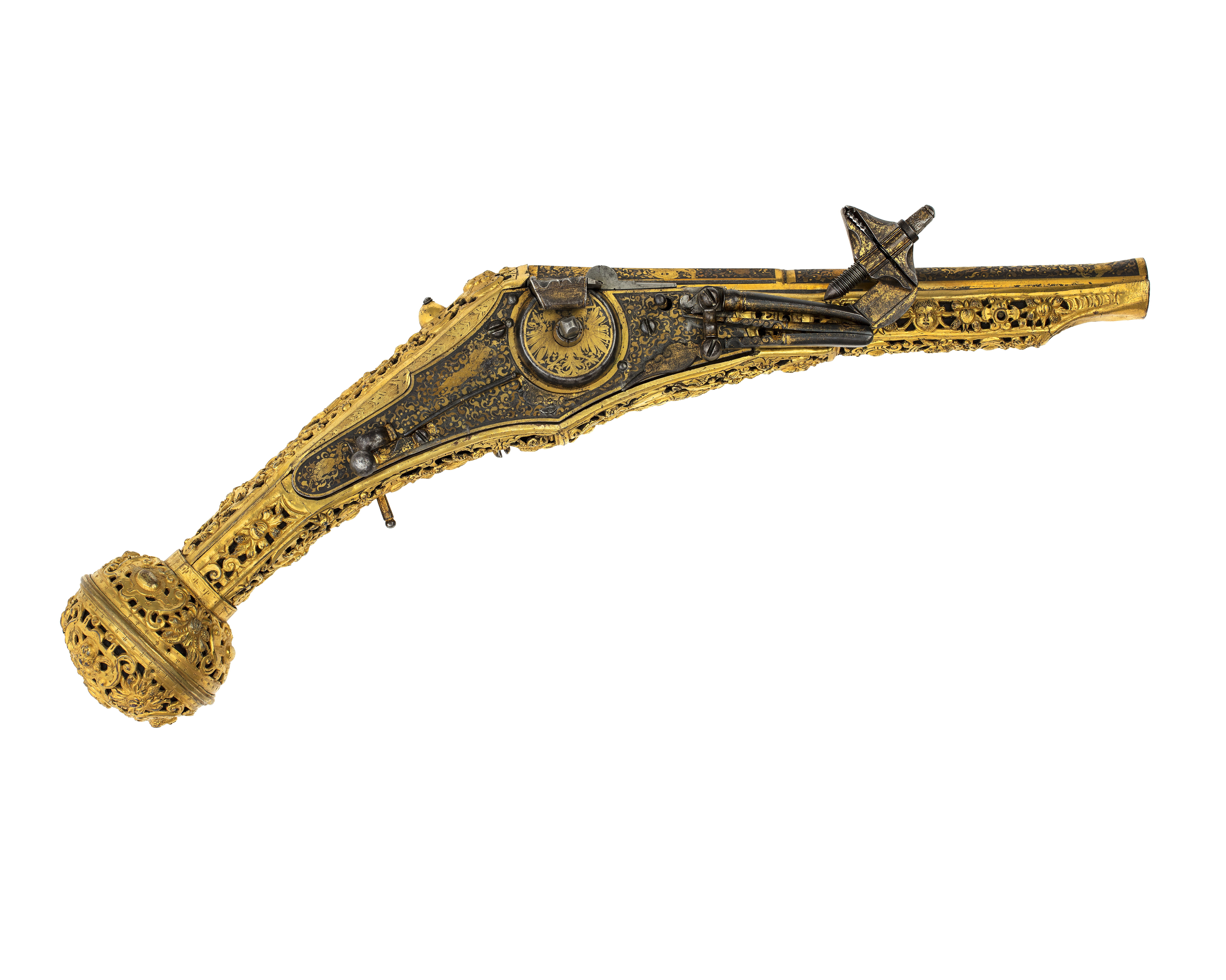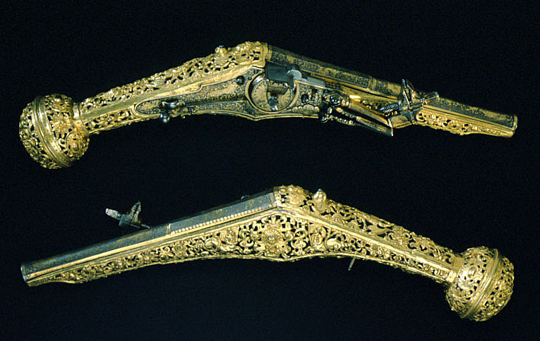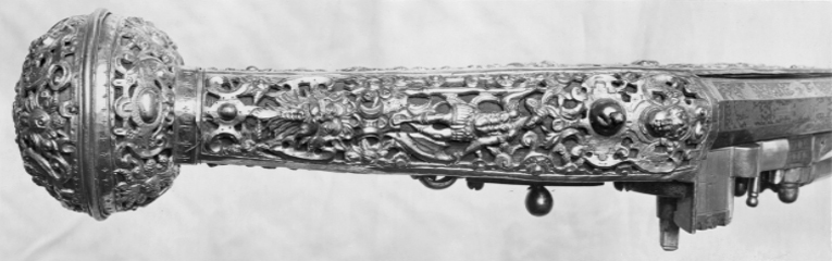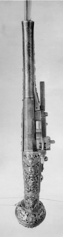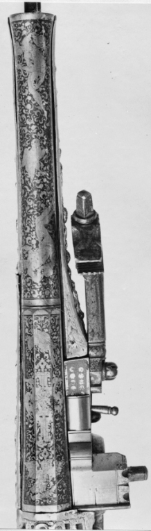 Rund, slätborrad, blånerad pipa med åttsidig kammare och trumf. Pipans ovansida försedd med yttäckande ornering av påslaget guld i form av rankor inom förgylld ram, i rankverket på kammaren en uggla, trofégrupp med amasonsköld och svärd samt fågel, på pipans runda del en halvliggande man och kvinna med krus ur vilket vatten rinner samt däremellan fågel. I vinkel böjt svansskruvblad, placerat något lägre än pipans översida. På kammarens undersida en djupt inslagen stämpel liknande en treklöver. Fästning: Två häften. Pipan fäst med krysskruv underifrån samt två pipstift av mässing. Hjullås av tysk typ med plant, på utsidan blånerat låsbleck med förgylld kant. Yttäckande dekor av påslaget guld i form av rankverk samt bakom hjulet en halvliggande människofigur, bakom säkringen en drake, förgylld kant. Hjul täckt av plan kapsel med påslagen dekor i form av dubbelörn. Fängpanna med förgylld gavel, blankt fängpannelock med rörlig arm, rundat grepp, på låsbleckets kant därunder guldkant och påslagna, rundade plattor. Svarvad, förgylld tryckknapp. Förgylld hane med lång, rundad kropp med ås på utsidan, balusterformig nedre del, hals med svängd framkant. Rektangulära käkar med runda fasningar framför och bakom käkskruven, underkäken lös, käkskruv med kantigt huvud. Förgylld hanfjäder med delvis rundade kanter, bakre delen i form av blad, balusterformig studel, långt fjäderlöv. Invändiga låsdelar blanka. Säkring: Förgylld virvelsäkring med knoppformigt grepp, fjäder med blad svängt efter hjulets rundning. Fästning: Två låsskruvar från h. sida. Avtryckare: Svarvad, förgylld avtryckare. Stock av trä med i vinkel mot pipan böjd, bakåt avsmalnande kolv med stor, rund kolvkula, d: ca 81 mm, h ca 66 mm. Stocken helt täckt av genombrutet, förgyllt kopparbleck i fyra delar över kolvrygg, resten av stocken samt två halvor på kolvkulan. Reliefdekor i beslagsornamentik med blad och frukter, kartuscher, maskaroner och människoansikten, på v. sida två mot varandra vända, tritonliknande figurer med fanor, flankerande kartusch med människoansikte. På kolvens undersida en stående krigare i antikiserande rustning, i ena handen en lans, i den andra en sköld, samma figur finns på blecket på kolvryggen. Blecket framdraget över svansskruvbladet. Kraftigt välvt fäste för krysskruven. På kolvkulan finns en profilerad vulst.