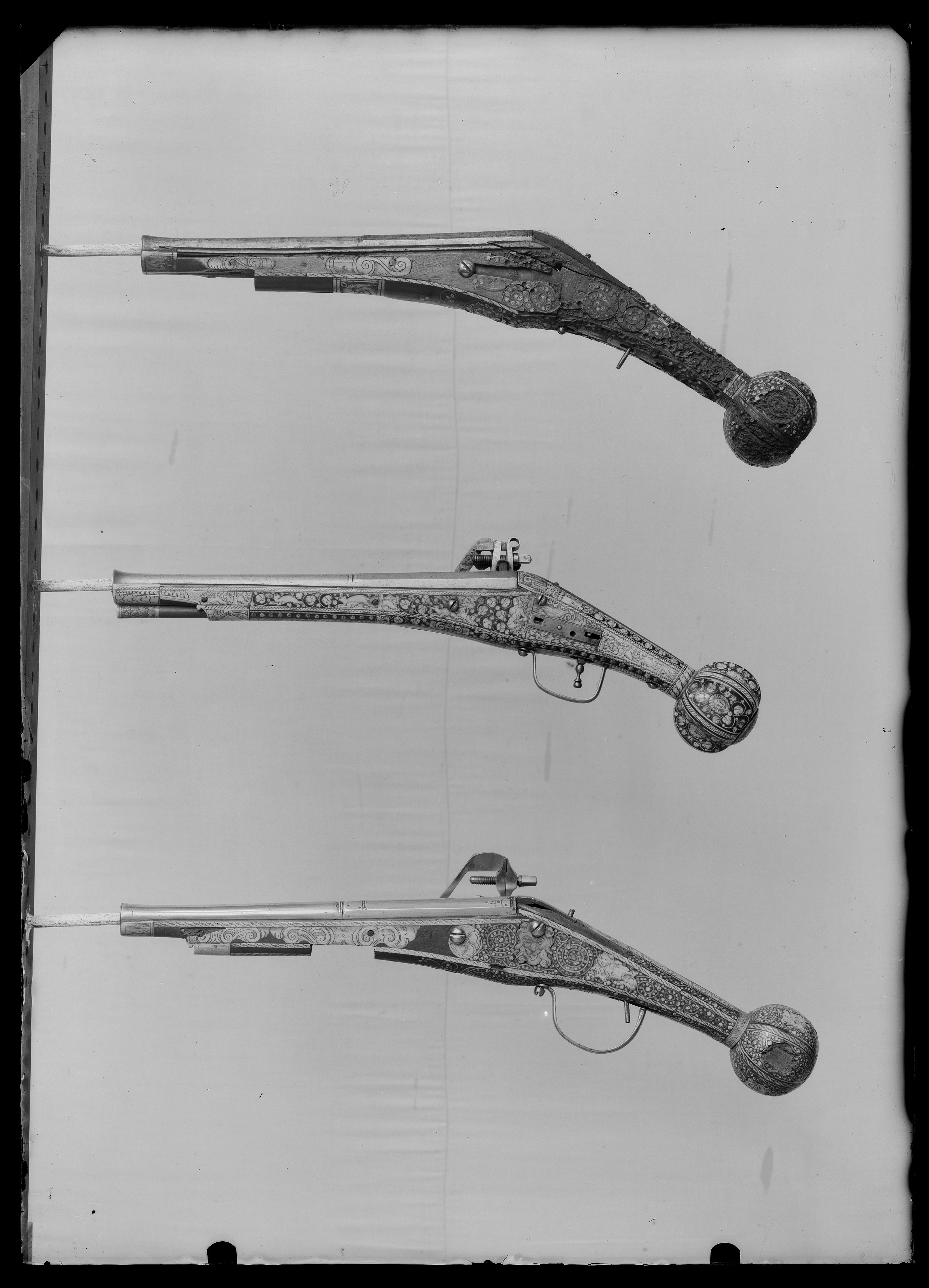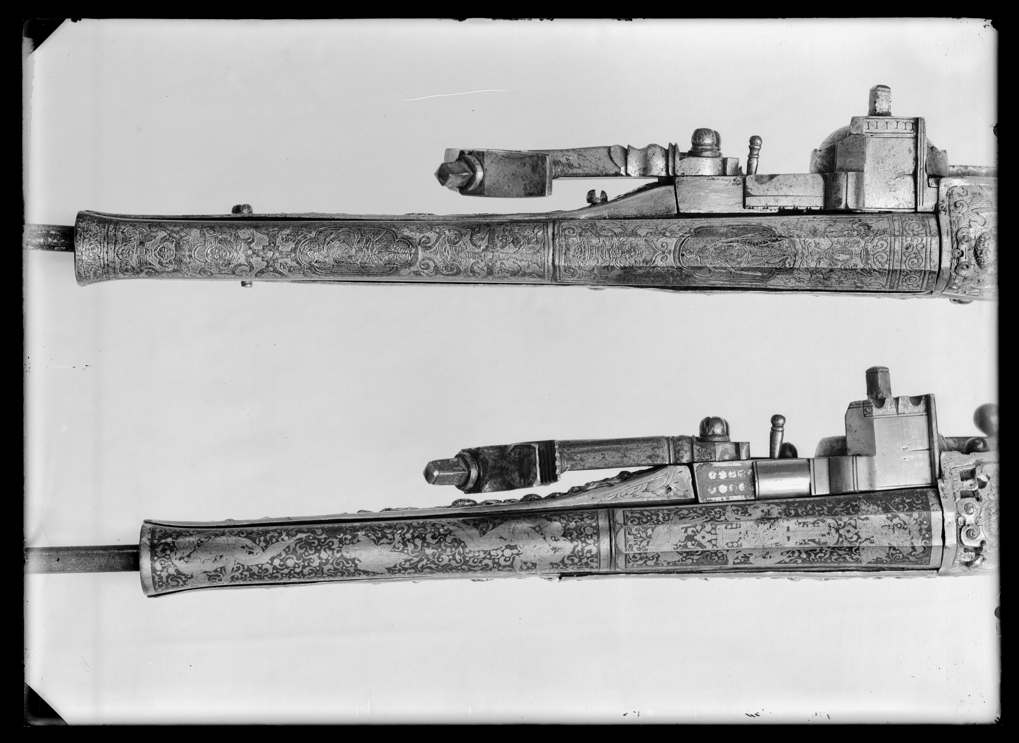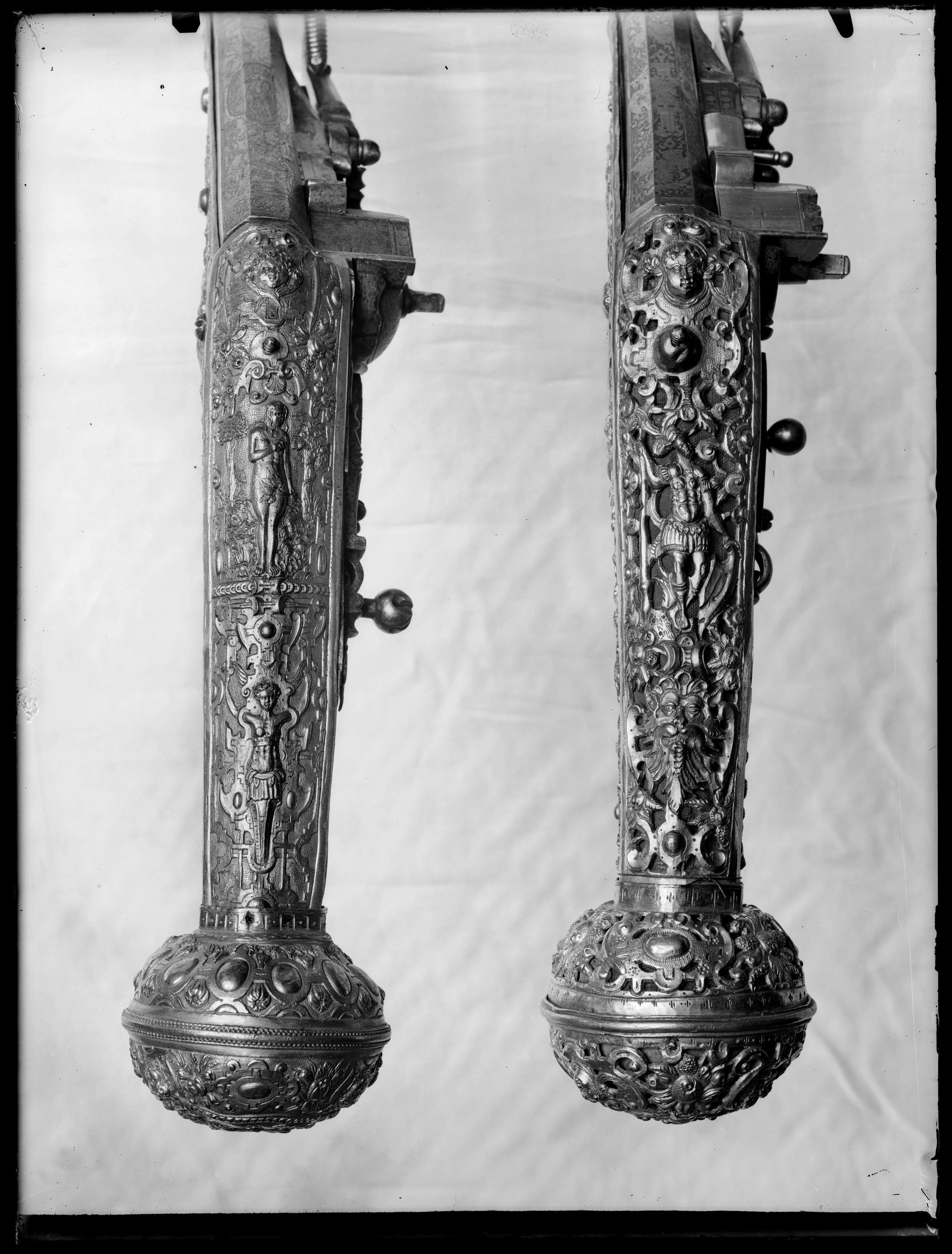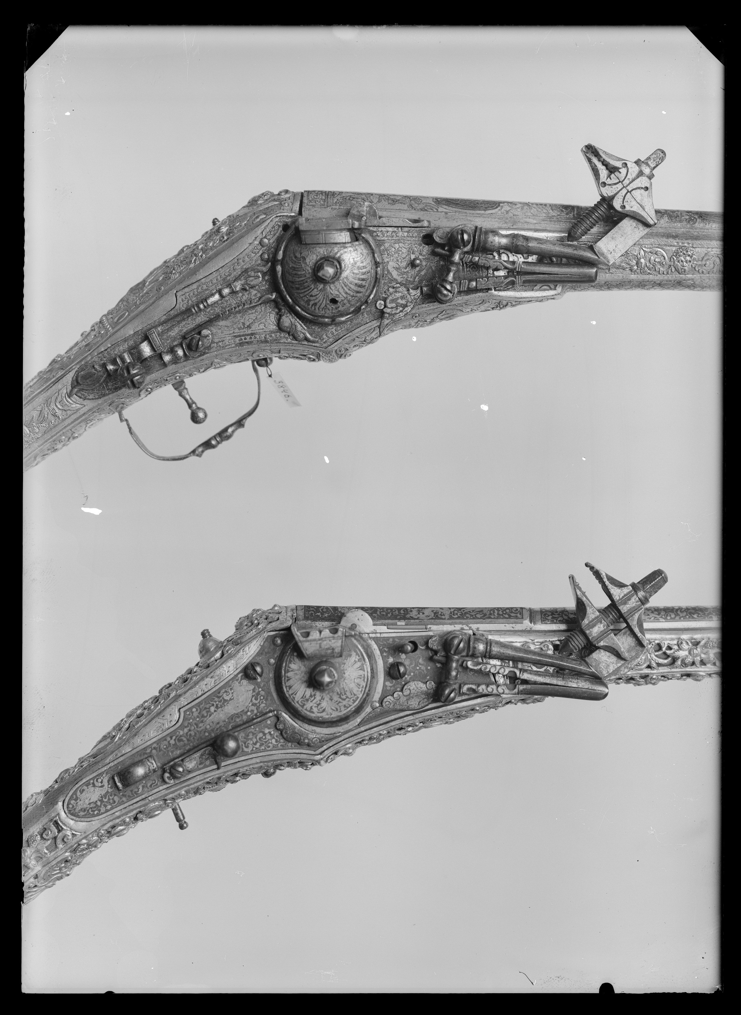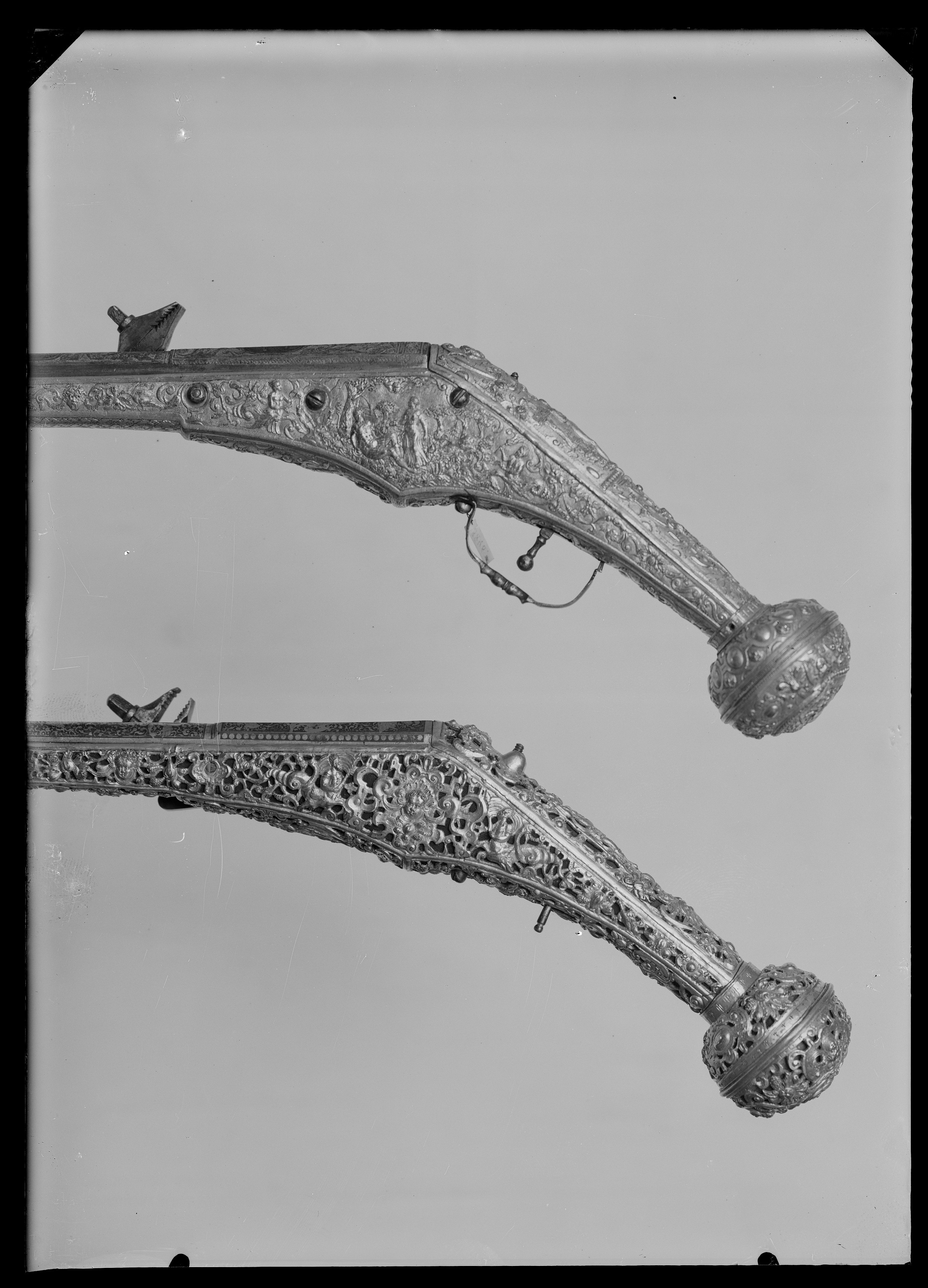 Rund, slätborrad, blånerad pipa med åttsidig kammare och trumf. Pipans ovansida försedd med yttäckande ornering av påslaget guld i form av rankor inom förgylld ram, i rankverket på kammaren en uggla, trofégrupp med amasonsköld och svärd samt fågel, på pipans runda del en halvliggande man och kvinna med krus ur vilket vatten rinner samt däremellan fågel. I vinkel böjt svansskruvblad, placerat något lägre än pipans översida. På kammarens undersida en djupt inslagen stämpel liknande en treklöver. Fästning: Två häften. Pipan fäst med krysskruv underifrån samt två pipstift av mässing. Hjullås av tysk typ med plant, på utsidan blånerat låsbleck med förgylld kant. Yttäckande dekor av påslaget guld i form av rankverk samt bakom hjulet en halvliggande människofigur, bakom säkringen en drake, förgylld kant. Hjul täckt av plan kapsel med påslagen dekor i form av dubbelörn. Fängpanna med förgylld gavel, blankt fängpannelock med rörlig arm, rundat grepp, på låsbleckets kant därunder guldkant och påslagna, rundade plattor. Svarvad, förgylld tryckknapp. Förgylld hane med lång, rundad kropp med ås på utsidan, balusterformig nedre del, hals med svängd framkant. Rektangulära käkar med runda fasningar framför och bakom käkskruven, underkäken lös, käkskruv med kantigt huvud. Förgylld hanfjäder med delvis rundade kanter, bakre delen i form av blad, balusterformig studel, långt fjäderlöv. Invändiga låsdelar blanka. Säkring: Förgylld virvelsäkring med knoppformigt grepp, fjäder med blad svängt efter hjulets rundning. Fästning: Två låsskruvar från h. sida. Avtryckare: Svarvad, förgylld avtryckare. Stock av trä med i vinkel mot pipan böjd, bakåt avsmalnande kolv med stor, rund kolvkula, d: ca 81 mm, h ca 66 mm. Stocken helt täckt av genombrutet, förgyllt kopparbleck i fyra delar över kolvrygg, resten av stocken samt två halvor på kolvkulan. Reliefdekor i beslagsornamentik med blad och frukter, kartuscher, maskaroner och människoansikten, på v. sida två mot varandra vända, tritonliknande figurer med fanor, flankerande kartusch med människoansikte. På kolvens undersida en stående krigare i antikiserande rustning, i ena handen en lans, i den andra en sköld, samma figur finns på blecket på kolvryggen. Blecket framdraget över svansskruvbladet. Kraftigt välvt fäste för krysskruven. På kolvkulan finns en profilerad vulst.