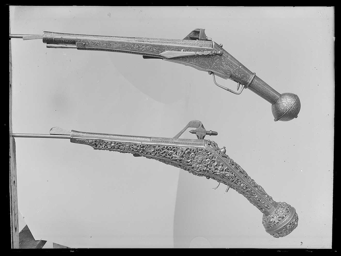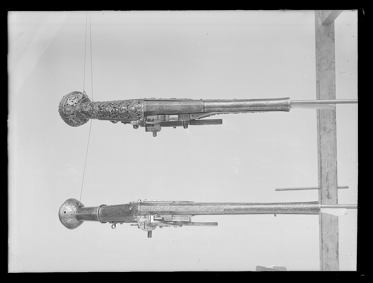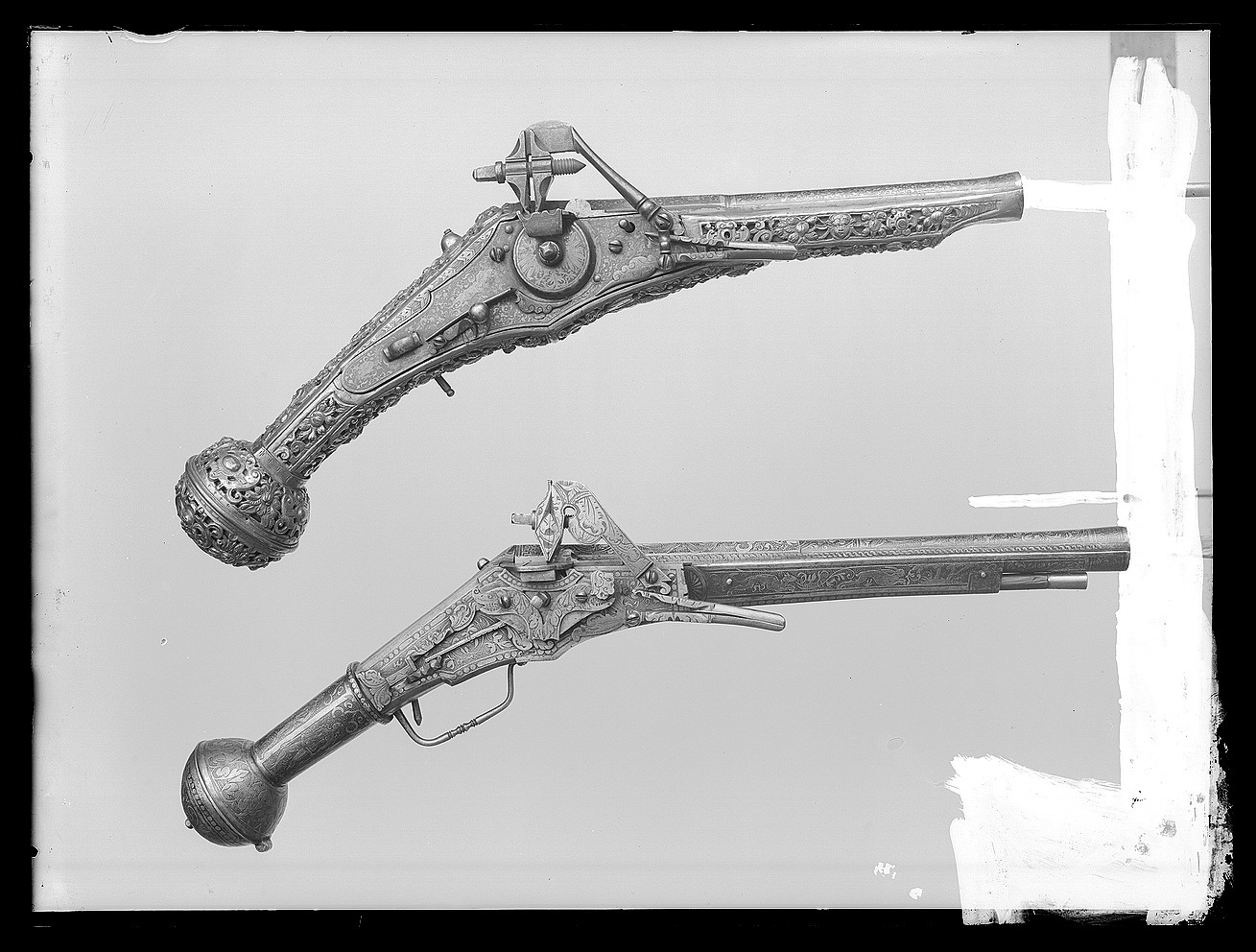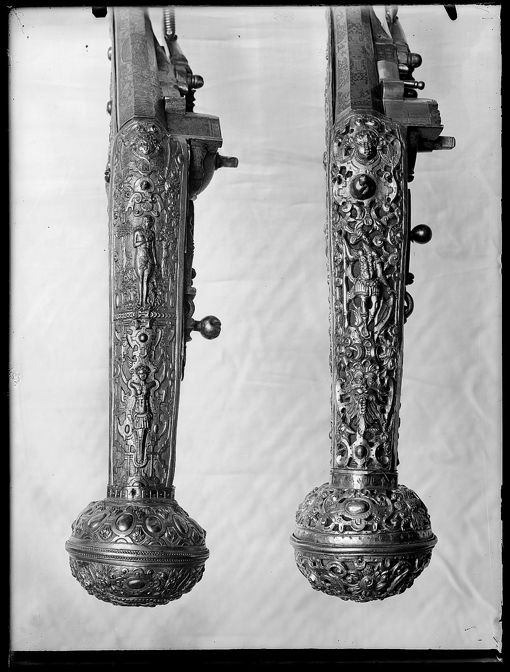 Rund, slätborrad, blånerad pipa med åttsidig kammare och trumf. Pipans ovansida försedd med yttäckande ornering av påslaget guld i form av rankor inom förgylld ram, i rankverket på kammaren en uggla, trofégrupp med amasonsköld och svärd samt fågel, på pipans runda del en halvliggande man och kvinna med krus ur vilket vatten rinner samt däremellan fågel. I vinkel böjt svansskruvblad, placerat något lägre än pipans översida. På kammarens undersida en djupt inslagen stämpel liknande en treklöver. Fästning: Två häften. Pipan fäst med krysskruv underifrån samt två pipstift av mässing. Hjullås av tysk typ med plant, på utsidan blånerat låsbleck med förgylld kant. Yttäckande dekor av påslaget guld i form av rankverk samt bakom hjulet en halvliggande människofigur, bakom säkringen en drake, förgylld kant. Hjul täckt av plan kapsel med påslagen dekor i form av dubbelörn. Fängpanna med förgylld gavel, blankt fängpannelock med rörlig arm, rundat grepp, på låsbleckets kant därunder guldkant och påslagna, rundade plattor. Svarvad, förgylld tryckknapp. Förgylld hane med lång, rundad kropp med ås på utsidan, balusterformig nedre del, hals med svängd framkant. Rektangulära käkar med runda fasningar framför och bakom käkskruven, underkäken lös, käkskruv med kantigt huvud. Förgylld hanfjäder med delvis rundade kanter, bakre delen i form av blad, balusterformig studel, långt fjäderlöv. Invändiga låsdelar blanka. Säkring: Förgylld virvelsäkring med knoppformigt grepp, fjäder med blad svängt efter hjulets rundning. Fästning: Två låsskruvar från h. sida. Avtryckare: Svarvad, förgylld avtryckare. Stock av trä med i vinkel mot pipan böjd, bakåt avsmalnande kolv med stor, rund kolvkula, d: ca 81 mm, h ca 66 mm. Stocken helt täckt av genombrutet, förgyllt kopparbleck i fyra delar över kolvrygg, resten av stocken samt två halvor på kolvkulan. Reliefdekor i beslagsornamentik med blad och frukter, kartuscher, maskaroner och människoansikten, på v. sida två mot varandra vända, tritonliknande figurer med fanor, flankerande kartusch med människoansikte. På kolvens undersida en stående krigare i antikiserande rustning, i ena handen en lans, i den andra en sköld, samma figur finns på blecket på kolvryggen. Blecket framdraget över svansskruvbladet. Kraftigt välvt fäste för krysskruven. På kolvkulan finns en profilerad vulst.