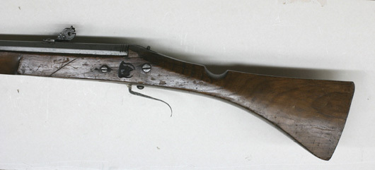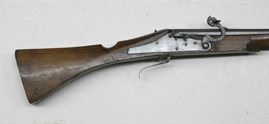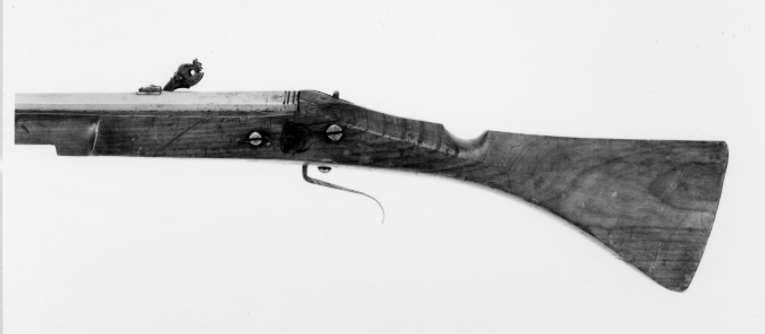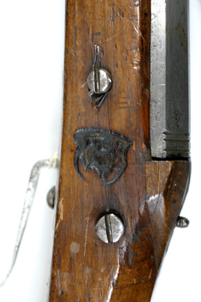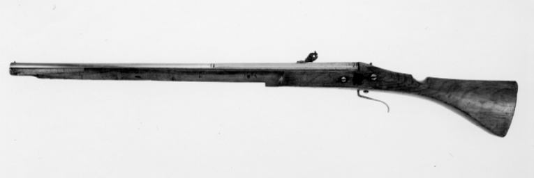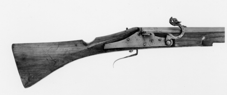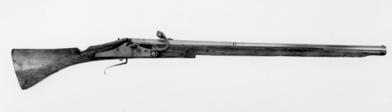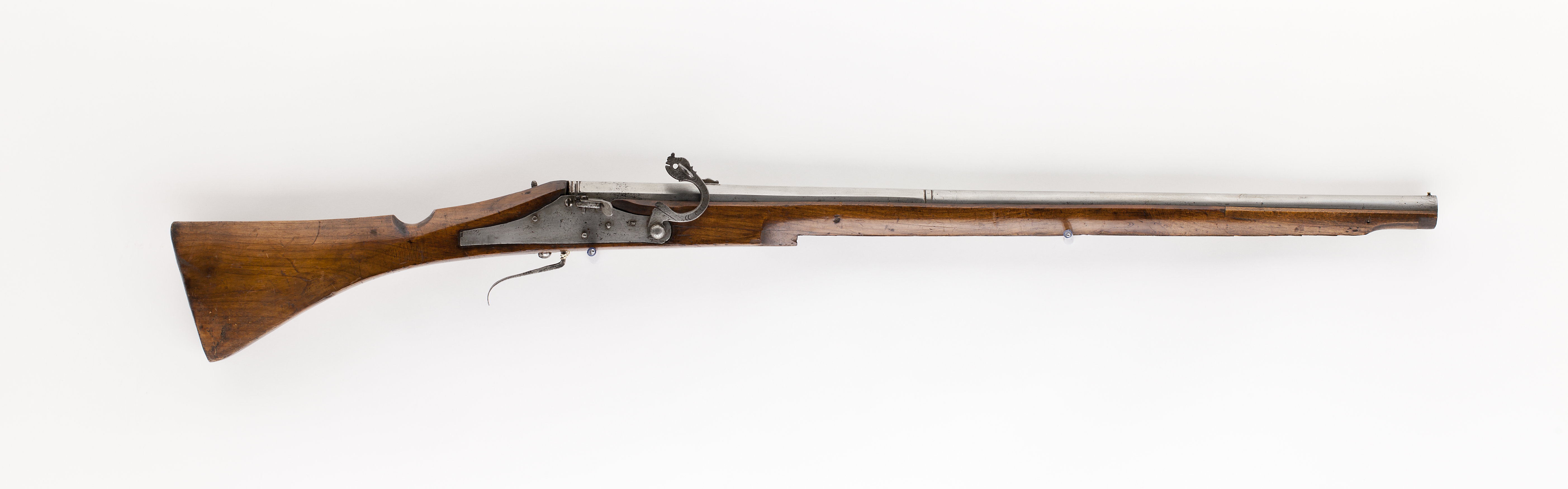 Rund, slätborrad pipa av stål med åttsidig kammare. Vid pipbasen tre tvärgående infilade streck. Den åttsidiga delen avslutad med ett slätt band med punsade streck samt däromkring bladornament, återkommande runt kornet. Riktmedel: Siktskåra från svansskruvbladet nästan fram till siktet. Kulissikte av stål, knoppkorn av mässing. Fästning: Två häften, ett pipstift av stål. Krysskruv underifrån. Luntlås med triangelformat plant låsbleck. Hane med plan kropp. Drakliknande krutklämma med punsad dekor, hjärtformad klämskruv. Fängpanna med rak eldskärm. Vridbart fängpannelock med bladformigt grepp. Hävstångsmekanism. Fästning: Två låsskruvar. Avtryckare gängad på låsets insida. Brun helstock av alm? med kolv av musköttyp med nedskuret tumläge. Mellan låsskruvarna inbränt sköldliknande märke (rustkammarstämpel?).