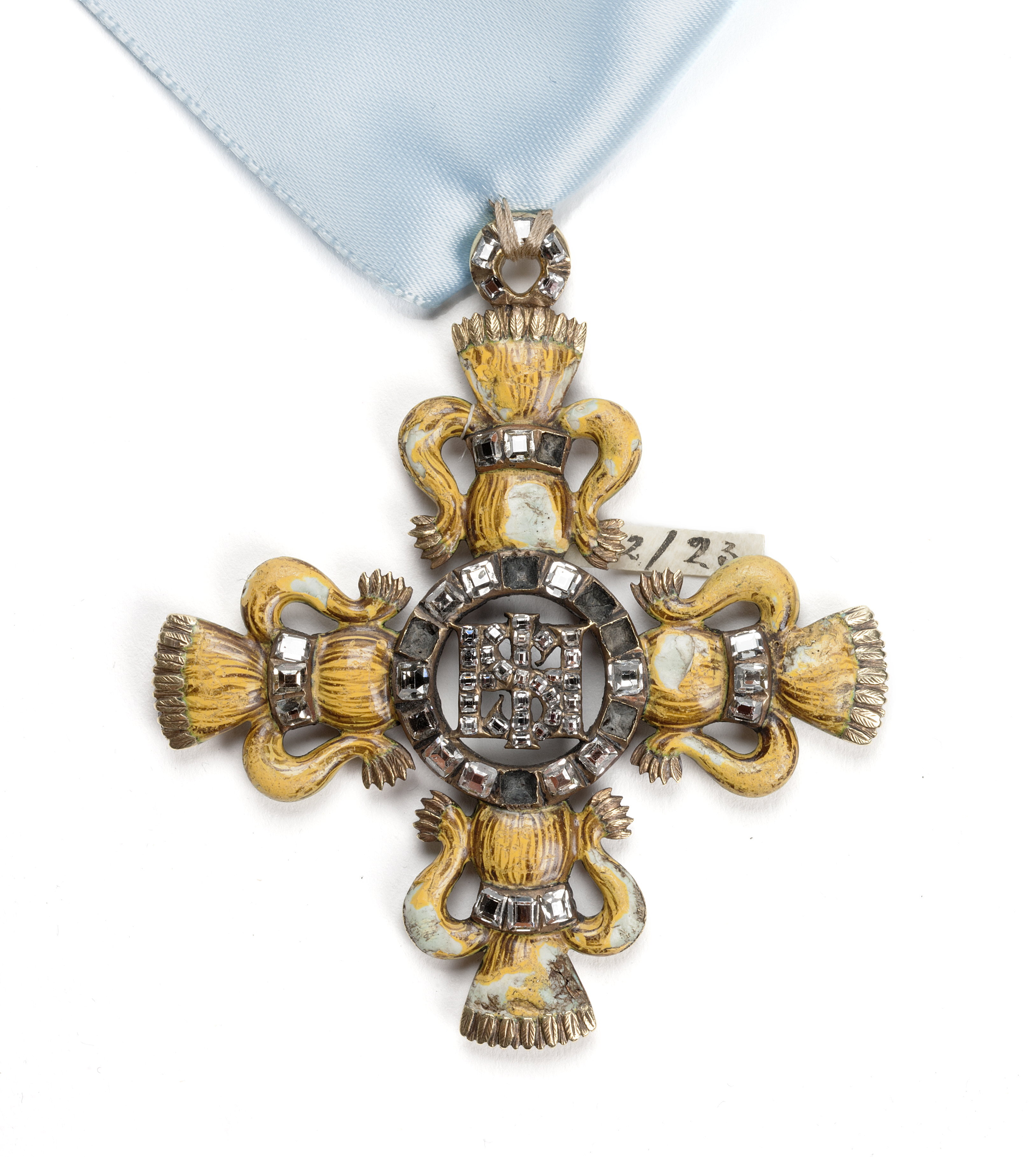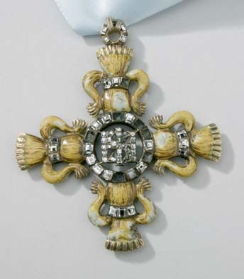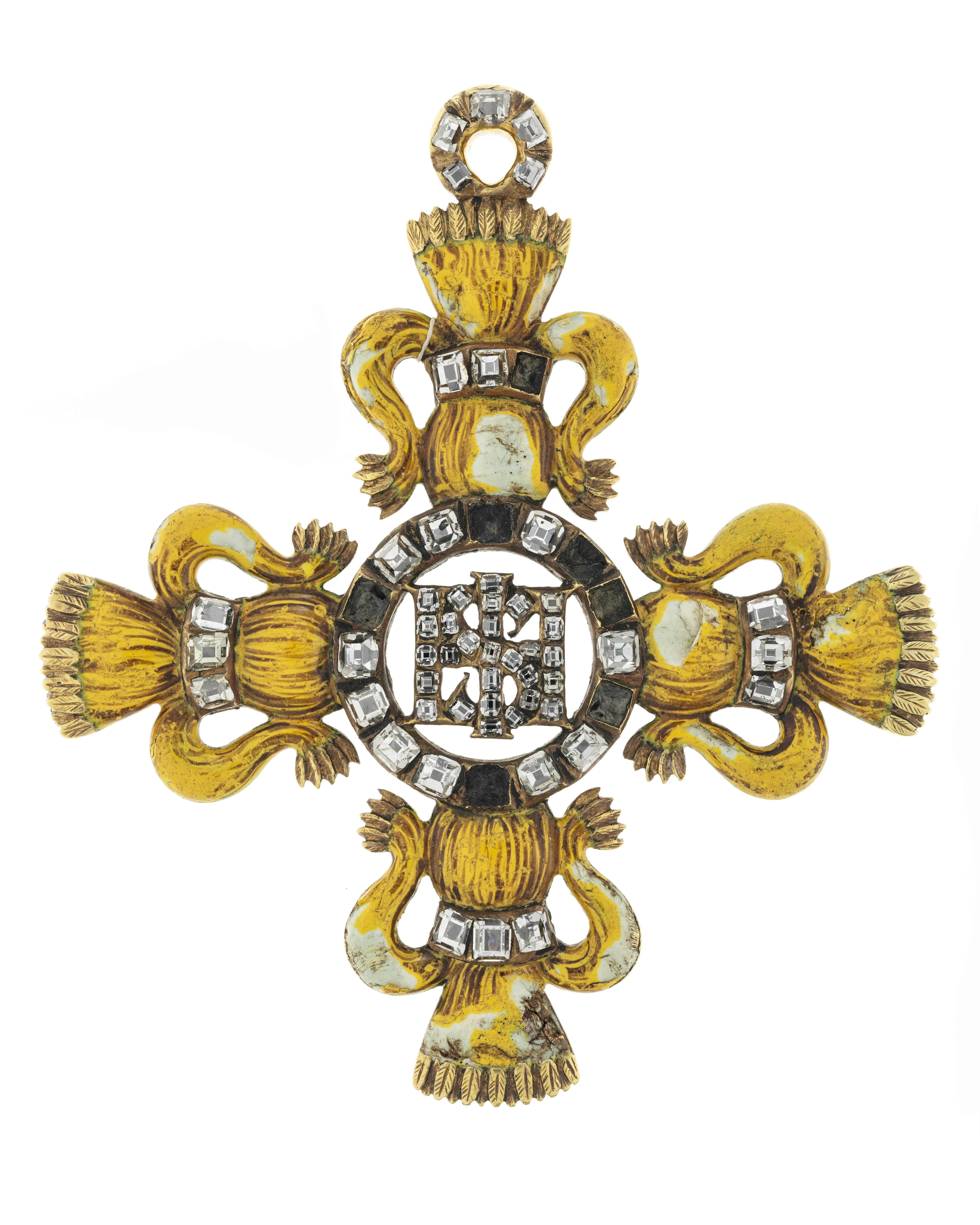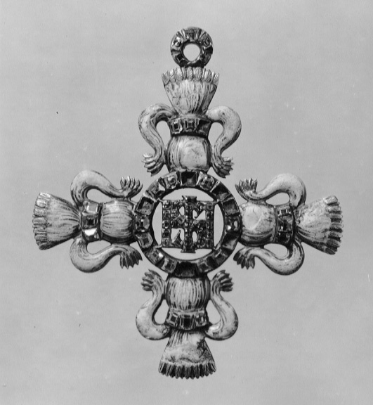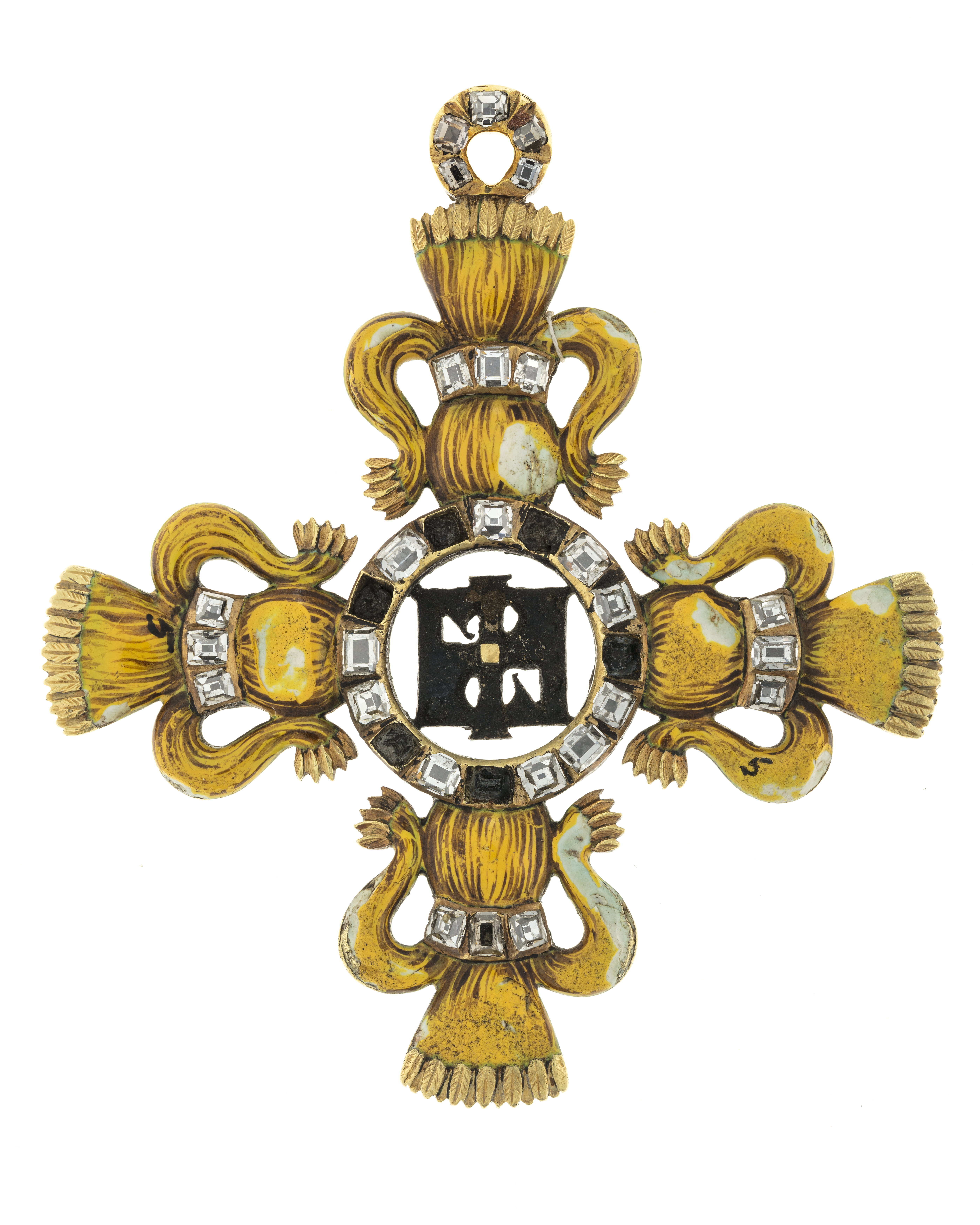 Kors bildat av fyra mot varandra ställda, 28 mm höga vasar av guld och gul emalj. Vardera kärven "sammanbunden" med ett band besatt med tre taffelslipade, ofärgade ädelstenar (diamanter?; en saknas), guldet synligt i kärvarnas ändar. Vasarna utgårifrån en ring besatt med på vardera sidan med 10 (urspr.16) taffelslipade, ofärgade stenar. Inuti ringen namnchiffer I H S besatt med 27 mindre stenar (baksidans monogram saknas). Upptill en ring av guld, besatt med 5 ofärgade stenar på vardera sidan.