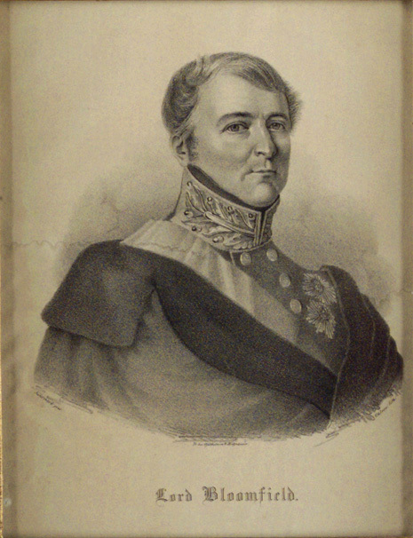 Bröstbild , fas höger. Uniform med kappa. Underskrift : "Lord Bloomfield". Signerad : "Södermark pinx". "Tr. hos Gjöthström & Magnusson". "Ohlson lith". Förgylld ram med pastellagelister. Ramlistens bredd 65 mm. På ramen och stödskivan skrivet "No 1" med blyerts , h ca 1 cm