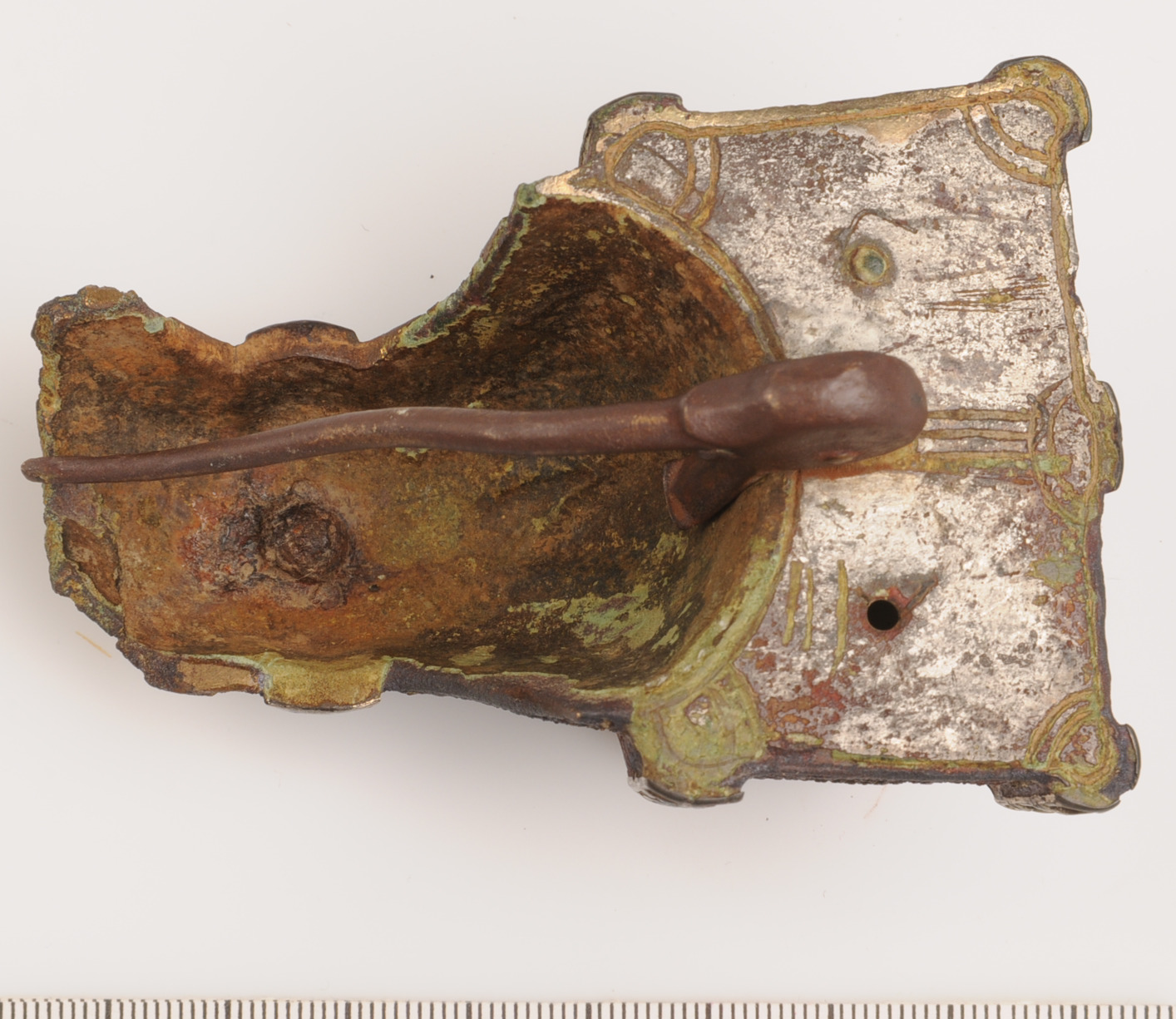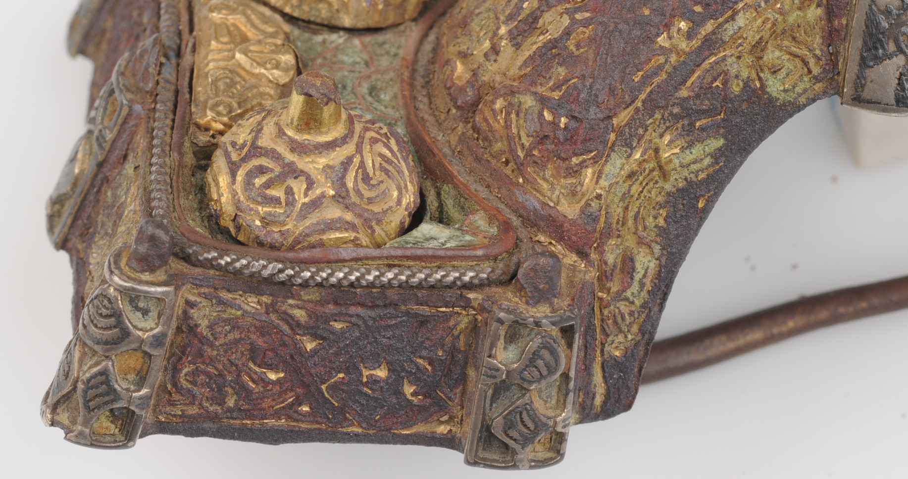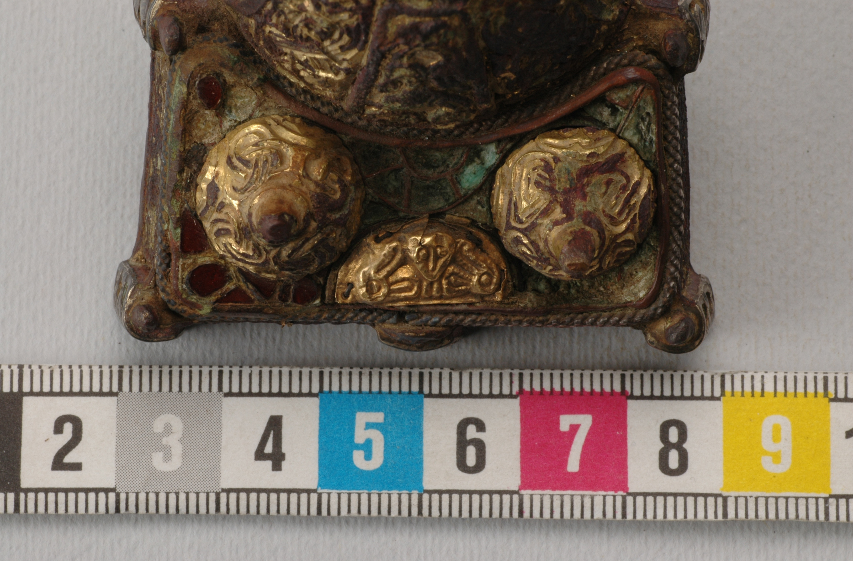 Ryggknappspänne i förgylld cu-leg med rester av closionné med granater