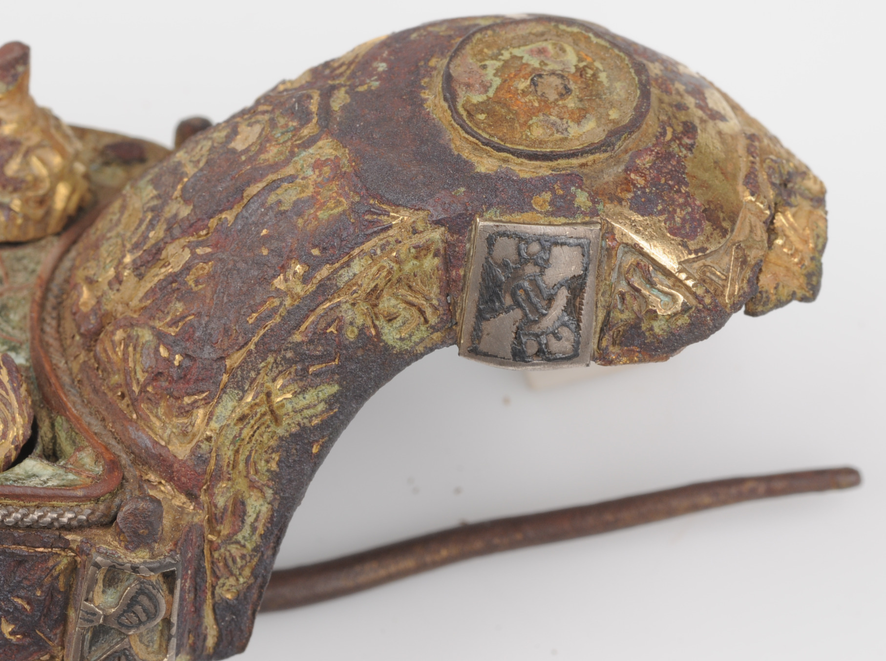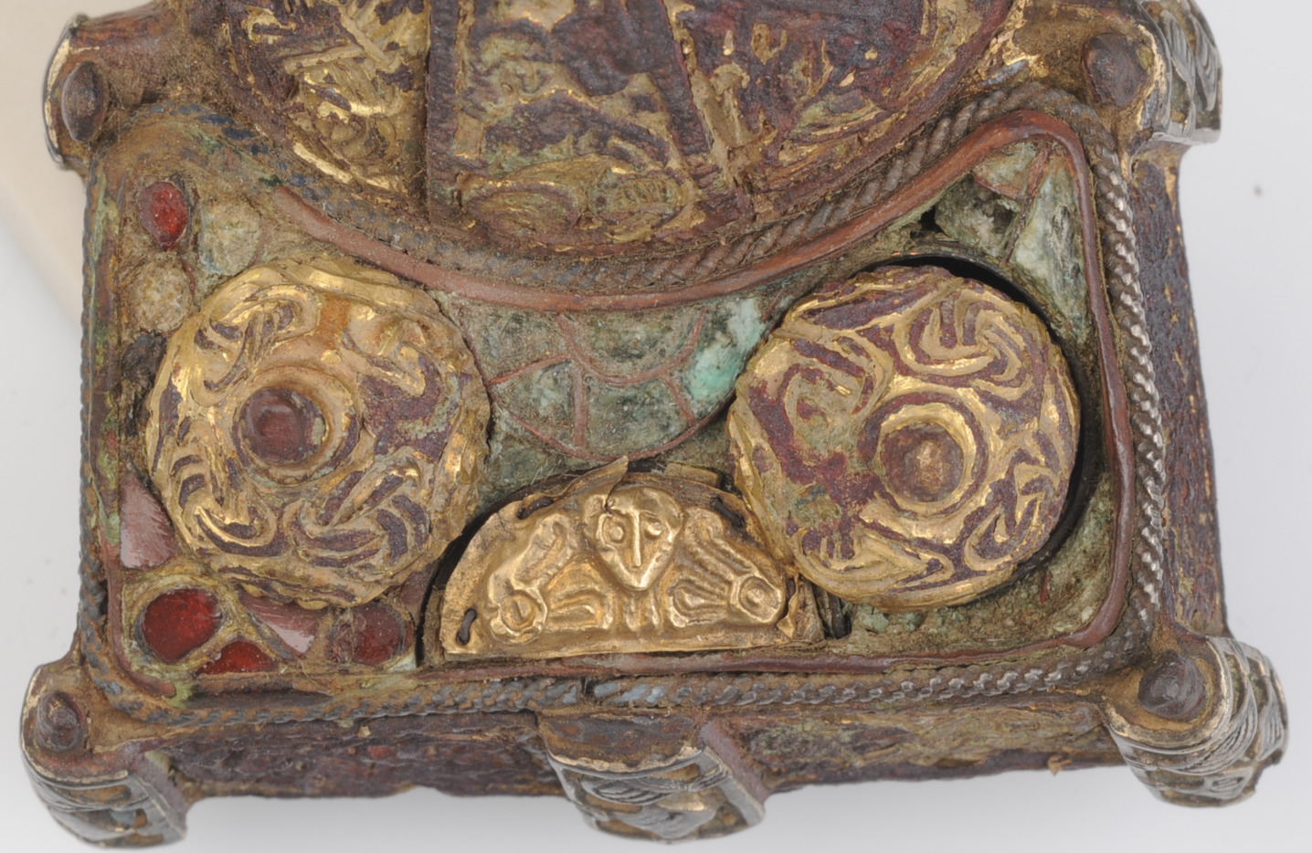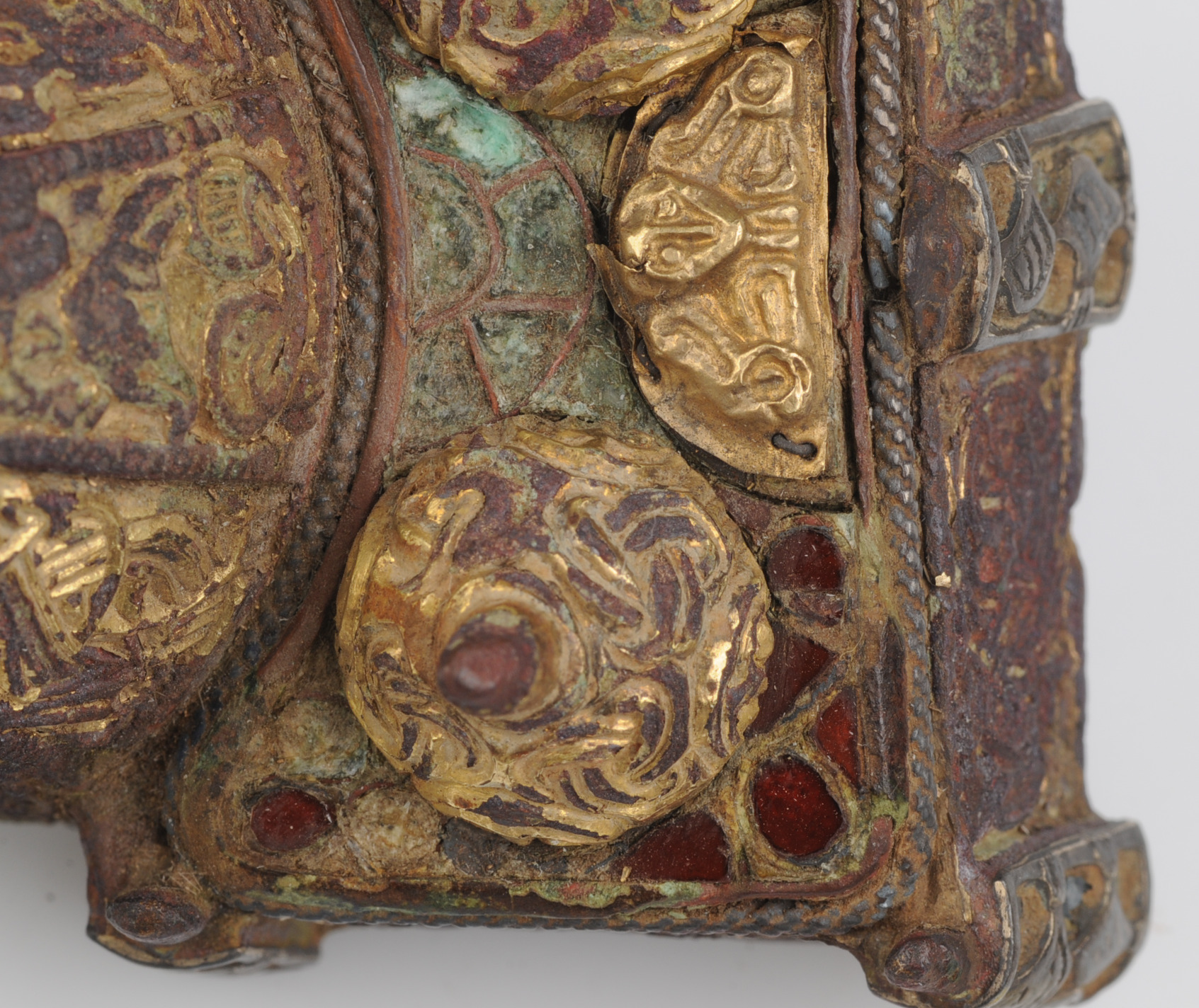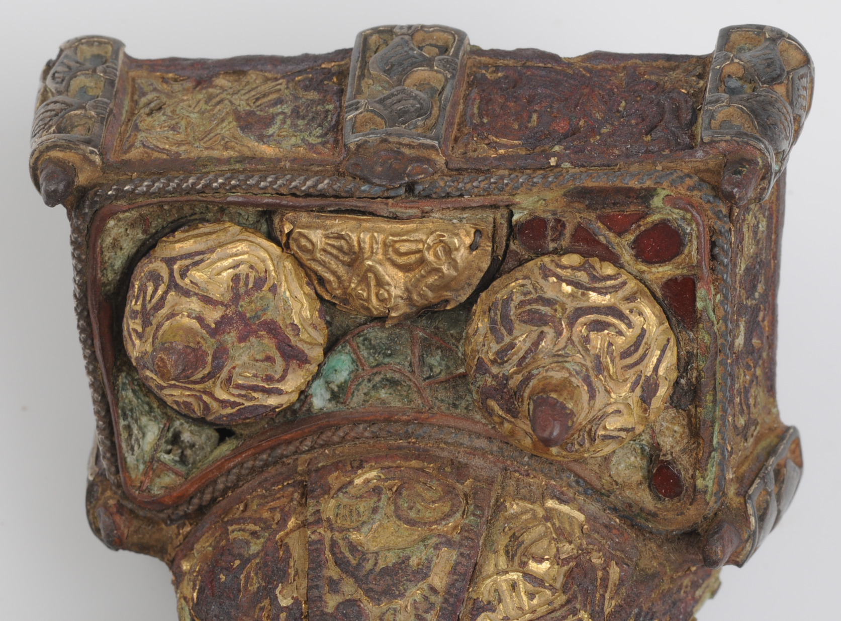 Ryggknappspänne i förgylld cu-leg med rester av closionné med granater
