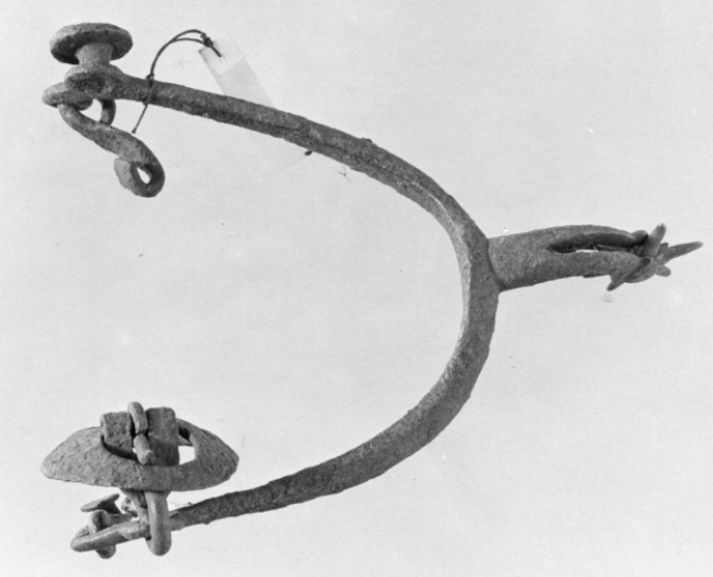 Svagt svängda, tunna bygelarmar. Inre bredd mellan armarna: 82 mm.Framtill med rundovalt spänne resp. krok för sporrläder. Kort,mjuktnedåtböjd sporrhals med sexuddigt stjärnhjul.