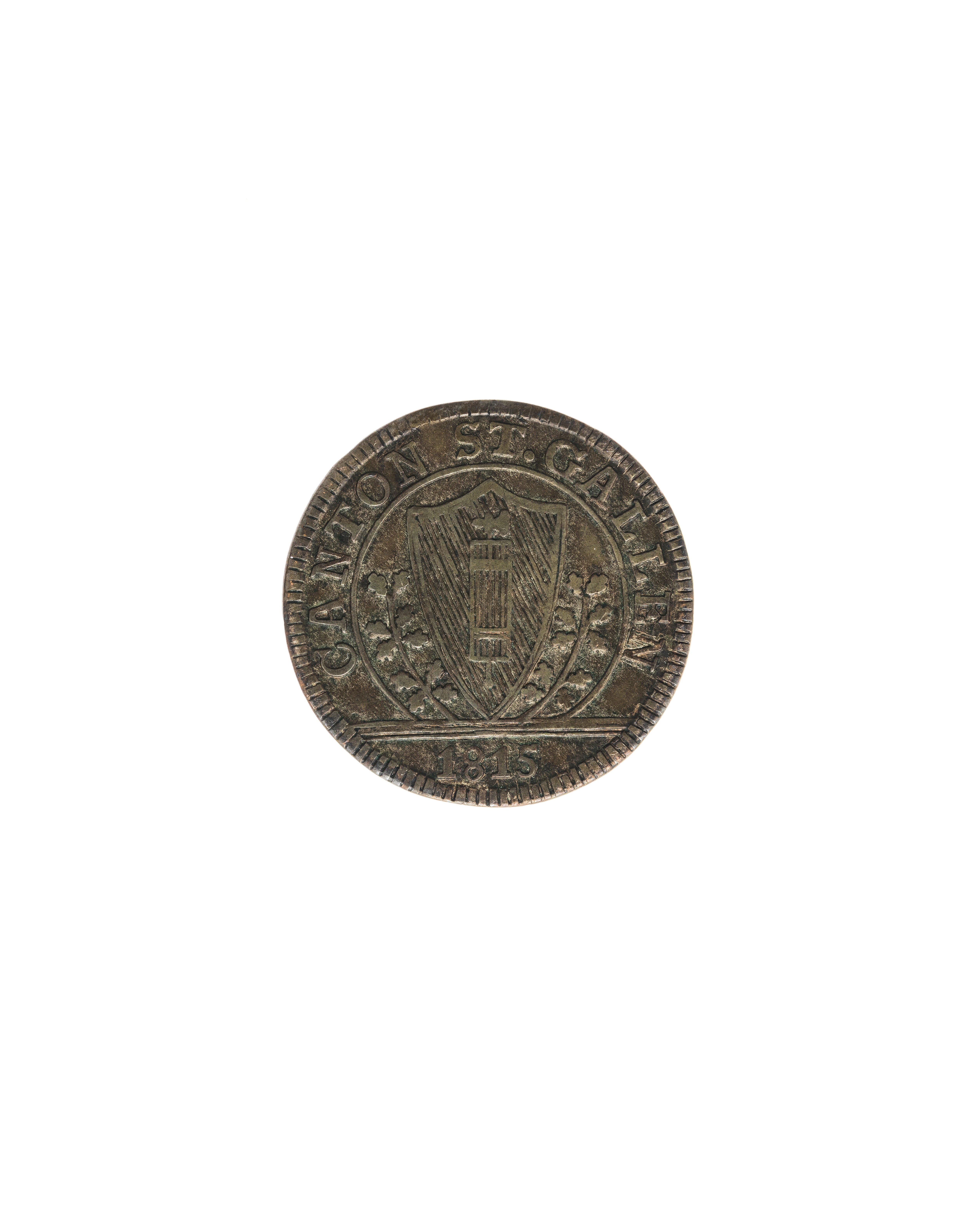 Åtsida: krans och därinnanför: "I // BAZEN // 1807". Frånsida: sköld med skraffering för grönt, däri fasces, omkring skölden två ekkvistar, omskrift på övre halvan: "CANTON ST. GALLEN". Släta kanter. Har tillhört Gustav IV Adolf under landsflykten. Gåva efter sonens (Gustav, prins av Vasa, 1799-1877) död av sondottern, drottning Karolina av Sachsen till kammarherre Adam Magnus Emanuel Lagergren (1844-1920). Enligt uppgift gåva av honom till LRK via Göteborgs museum (se brev 208:1907).
