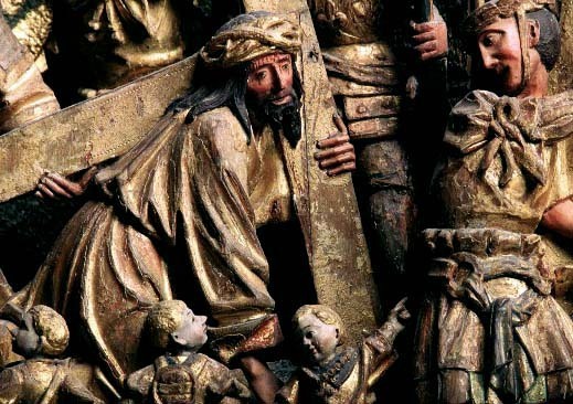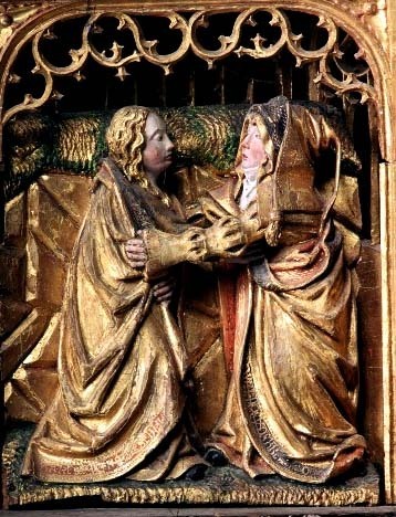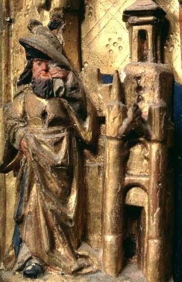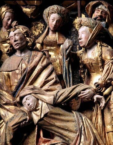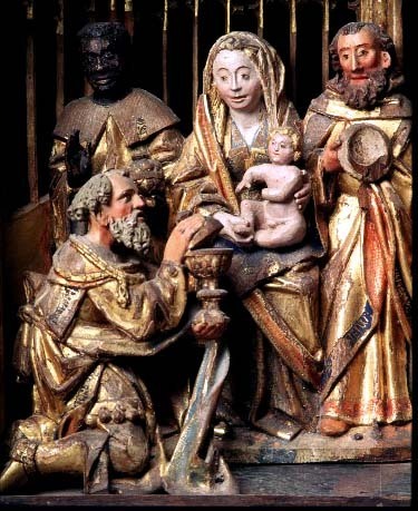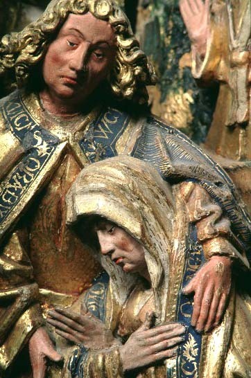 Kondition: i huvudsak välbevarad, enstaka händer och smärre detaljer bortfallna. Färg: god - obetydligt bortfall på skulpturen, pannåmålningarna något fragmentariska.