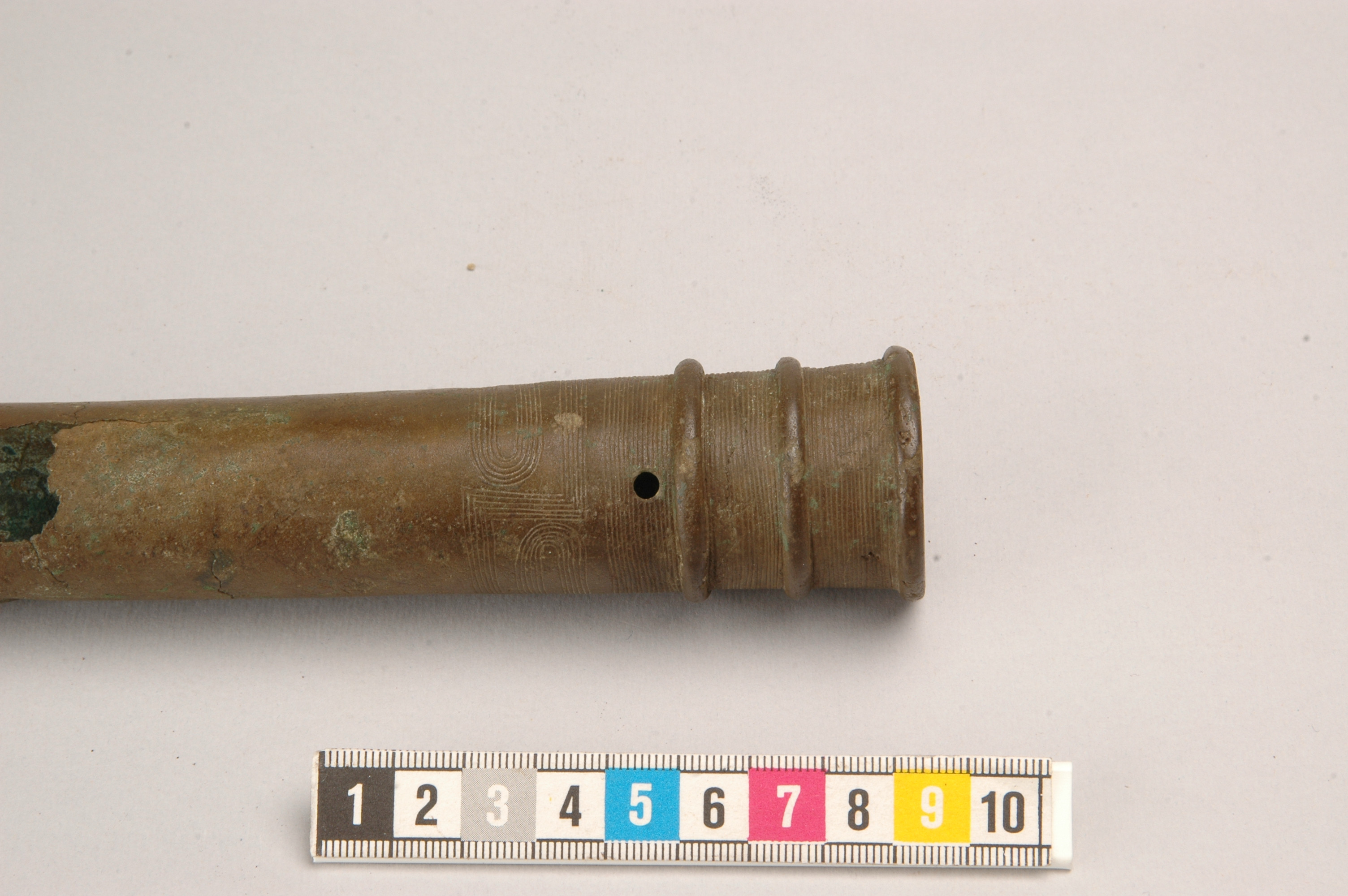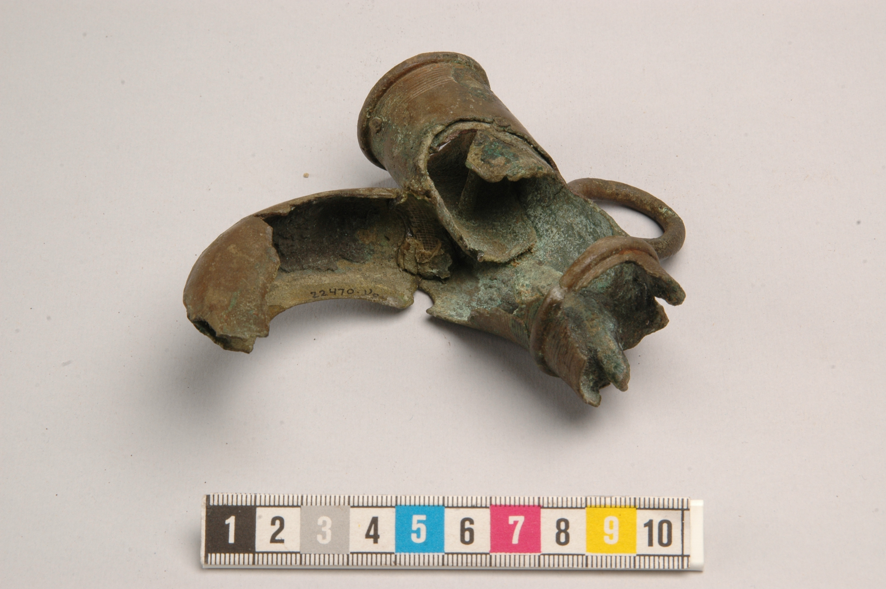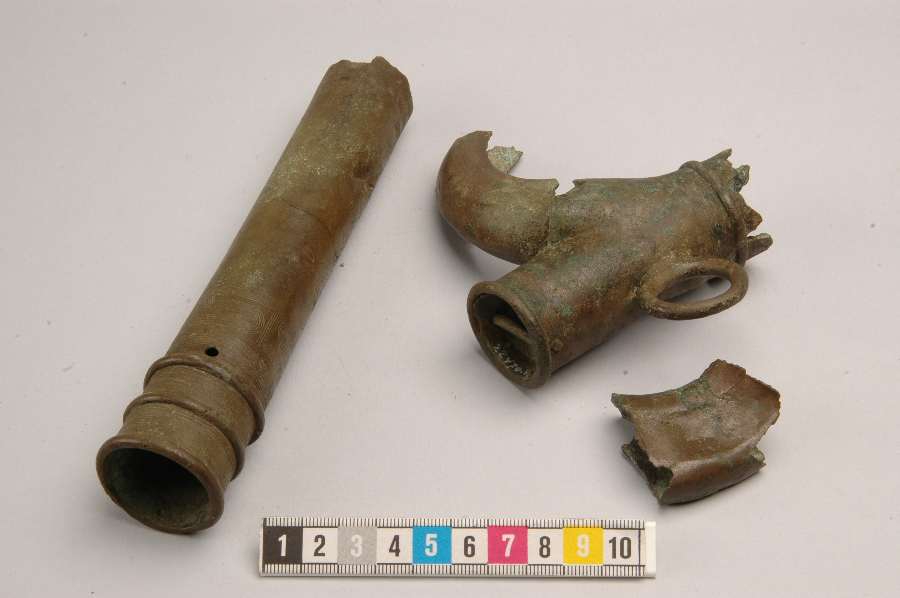 Rördelen som hör ihop med två hästhuvuden och möjligen flera fragment av rasselbleck m m. Röret har dekor av vulster, ränder och meanderband, I ena änden finns ett hål för en pigg. Det andra fragment har i änden har två genomgående piggar och möjligen rester av en lagning på insidan Dekor av ränder och vulster. På rörets ena sida sitter en stor ögla och på motstående sida finns en utgående böjd båge där sannolikt ett av hästhuvudena suttit. Den andra bågen har bara rester av fästet bevarat.