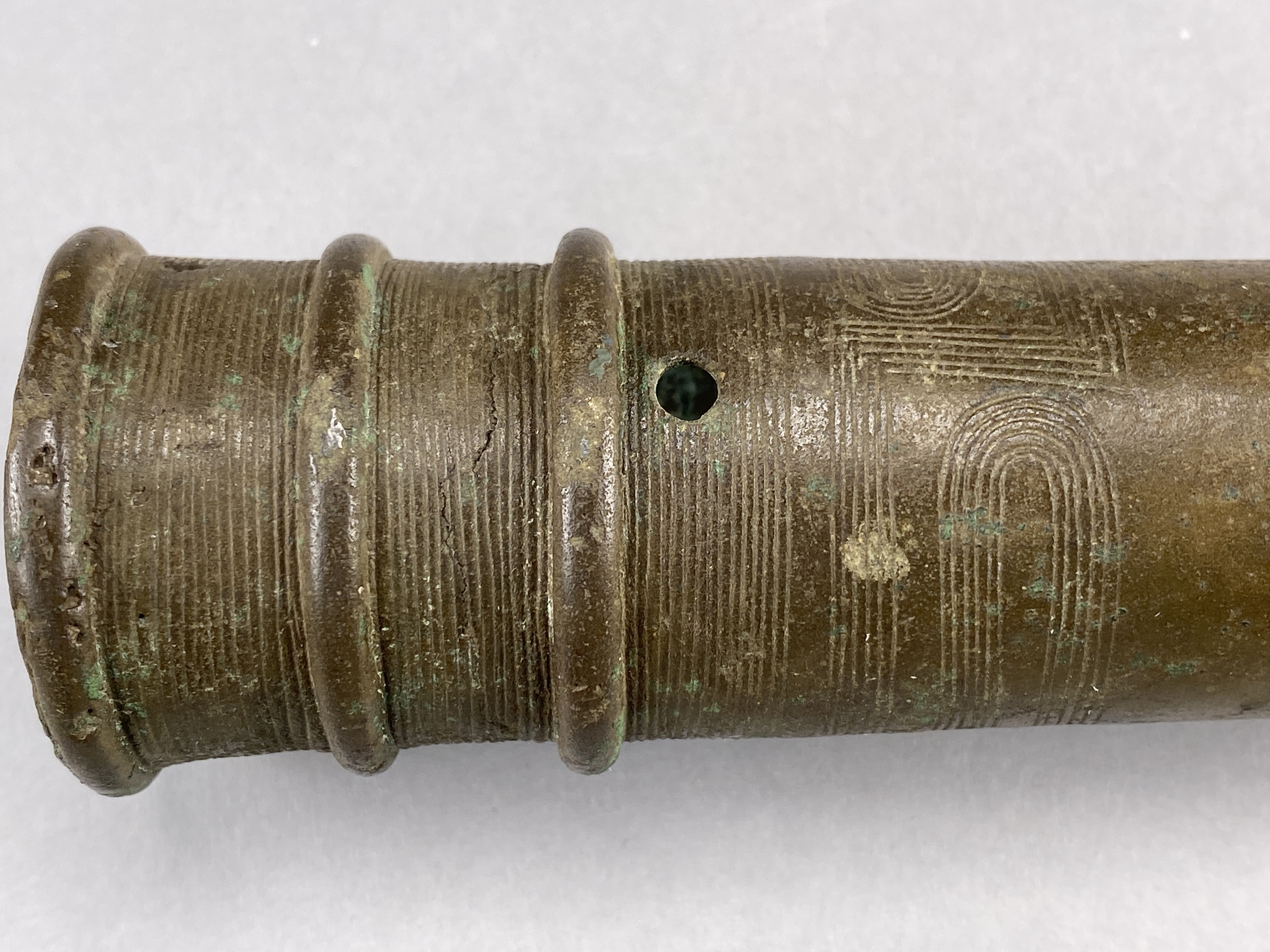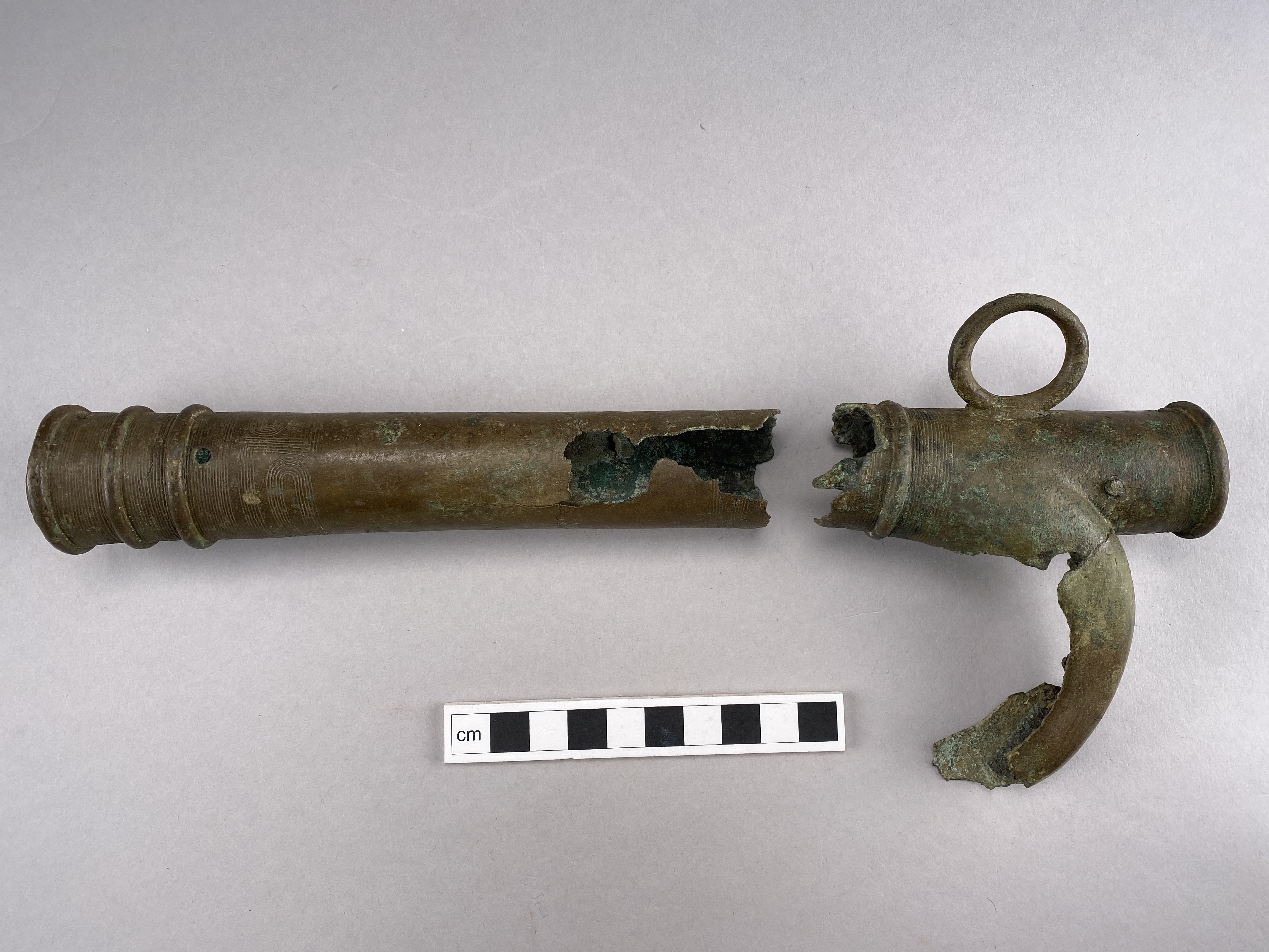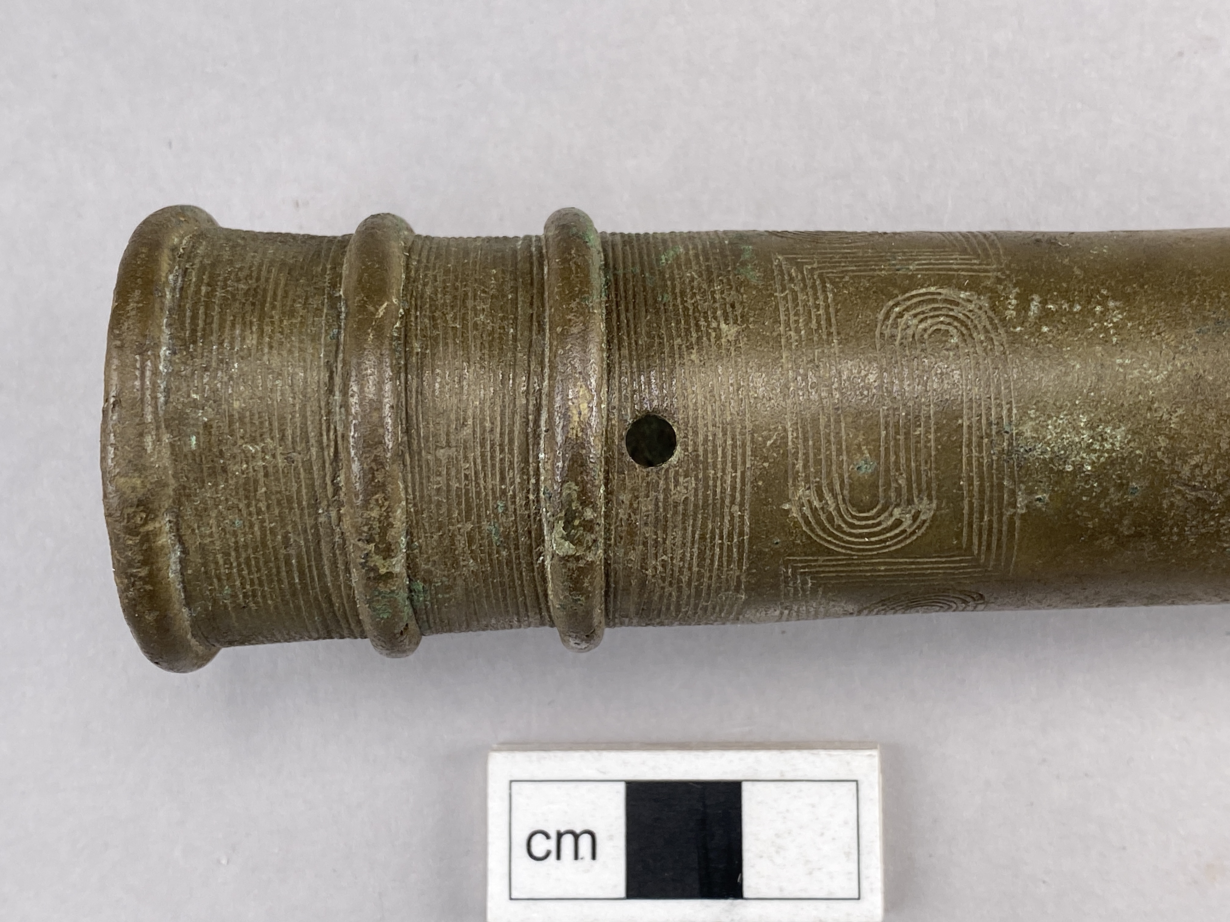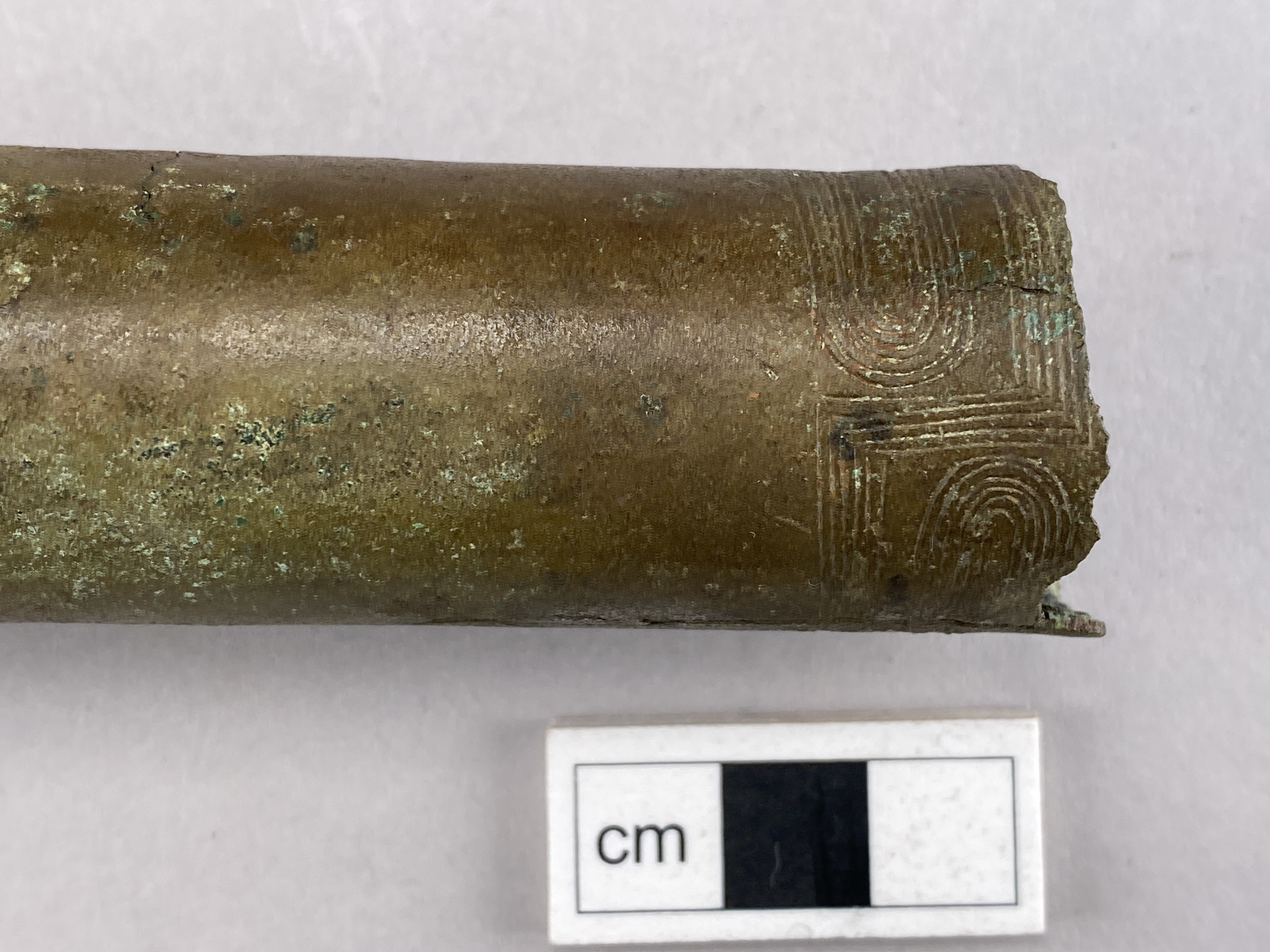 Rördelen som hör ihop med två hästhuvuden och möjligen flera fragment av rasselbleck m m. Röret har dekor av vulster, ränder och meanderband, I ena änden finns ett hål för en pigg. Det andra fragment har i änden har två genomgående piggar och möjligen rester av en lagning på insidan Dekor av ränder och vulster. På rörets ena sida sitter en stor ögla och på motstående sida finns en utgående böjd båge där sannolikt ett av hästhuvudena suttit. Den andra bågen har bara rester av fästet bevarat.