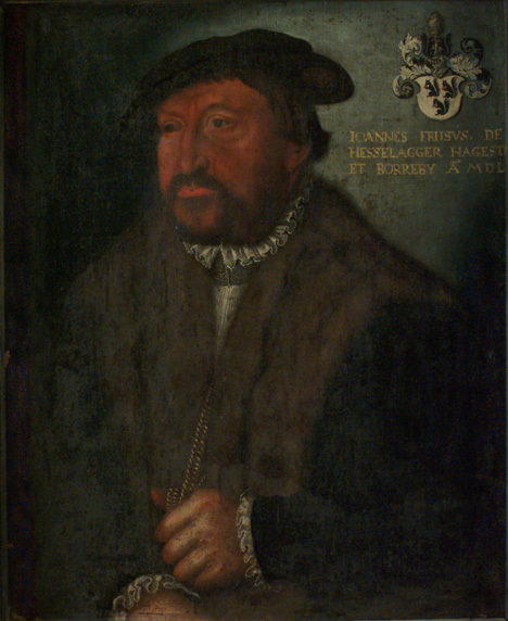Äldre man, rödbrun karnition, barett, mörk rock med stor pälskrage, pipkrage. Inskrift: “ IOANNES FRiiSVS. DE HESSELAGGER HAGESTE... ET BORREBY AO MDL...” Vapen sköld med tre ekorrar. Rester av Wrangellapp med oläslig text. Duken spikad direkt på svart, profilerad ram, bredd 110 mm.