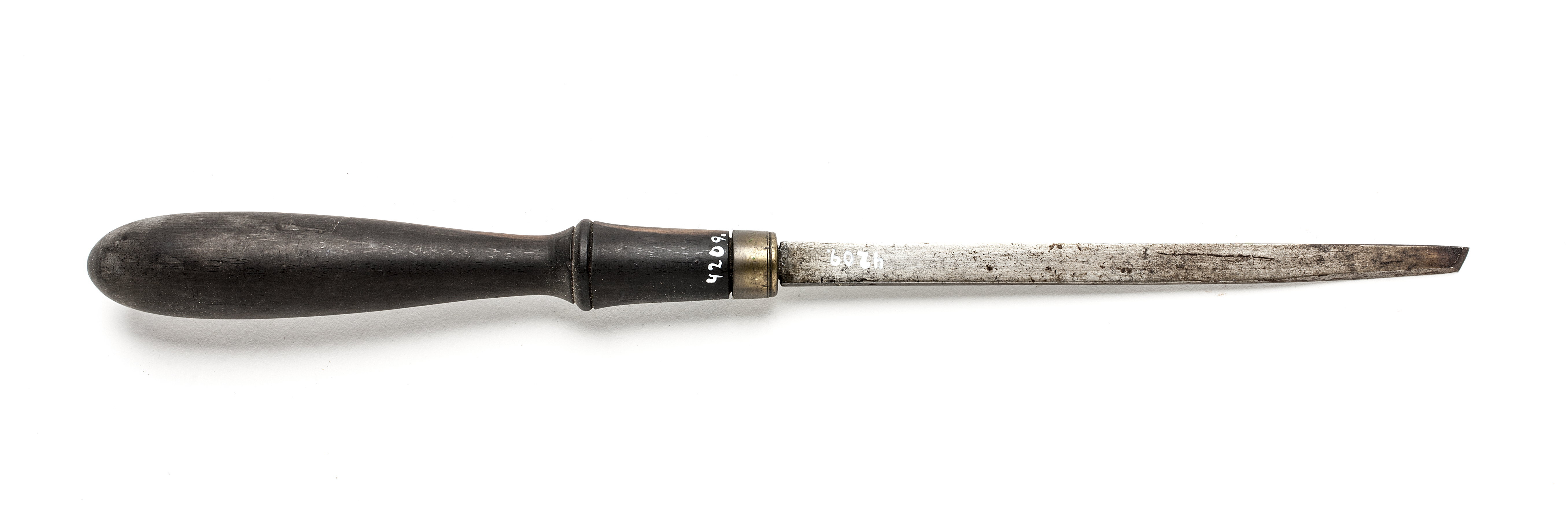 Klinga med rektangulär genomskärning. Sned främre egg samt en sidoegg. Svarvat skaft av ebenholts med en vulst. Mässingsring. Stämplat på klingan: "S B"
