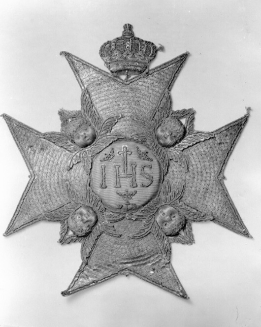 Malteserkors, broderat med paljetter och kantiljer av förgyllt silver serafer med huvuden i hög relief, broderade med förgylld silvertråd samt kantiljer och paljetter av förgyllt silver, vingar av paljetter. Välvd medaljong täckt med ljusblå sidenmoaré, därpå broderat IHS, kors, tre kronor och tre spikar av kantiljer och paljetter av förgyllt silver. Mellan den övre korsarmens spetsar en kunglig krona av lan, kantiljer och paljetter av förgyllt silver. På baksidan klistrat vit papp.