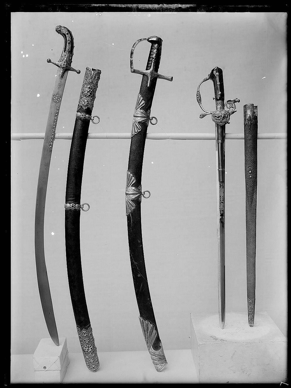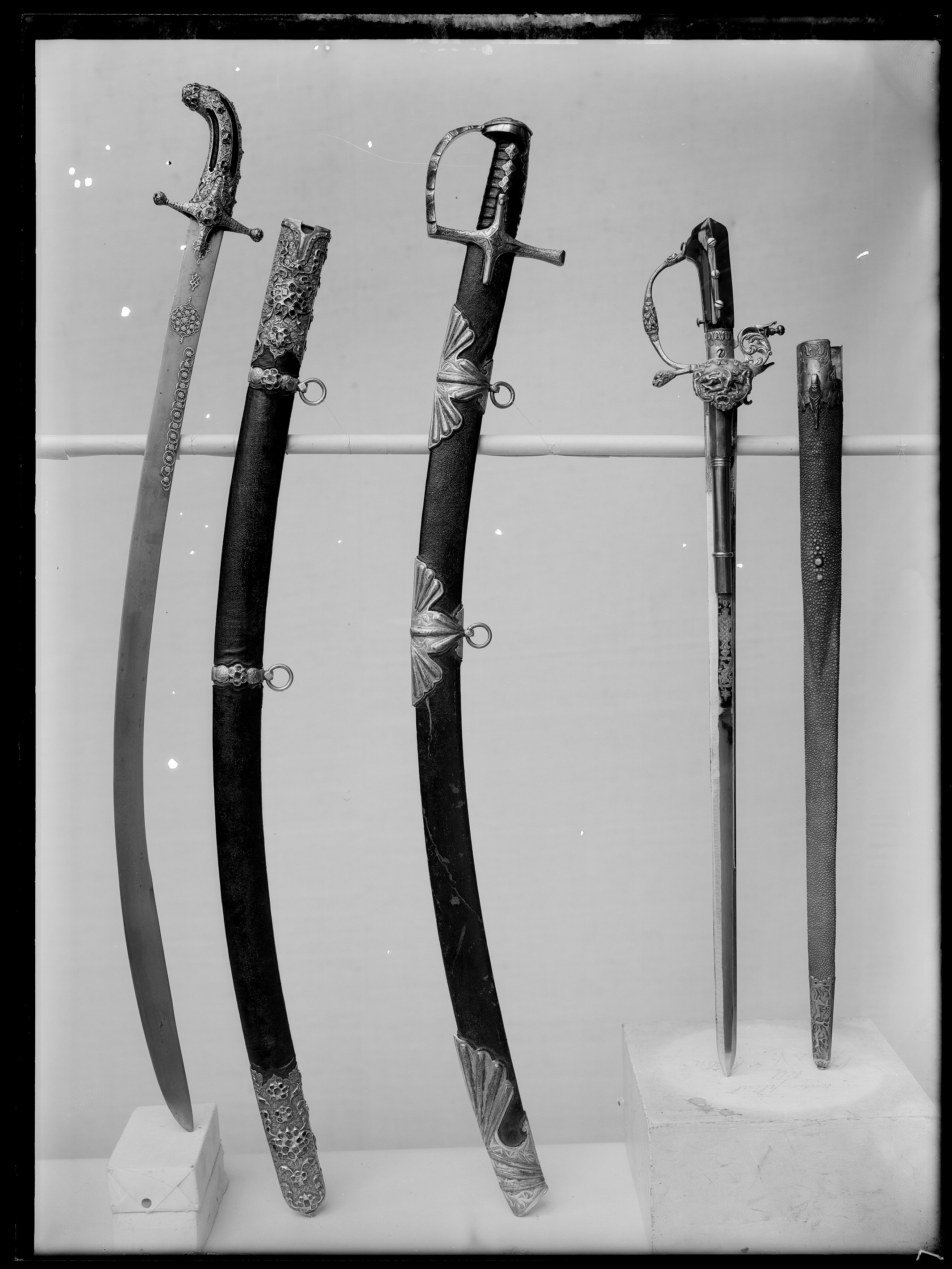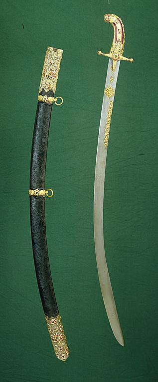Framåtböjt fäste av trä klätt med röd sammet och helt beslaget med förgyllt silver. Sammeten synlig genom fyra längsgående skåror. Korta raka parerstänger med runda knoppar i ändarna och styrskenor ornerade med ciselerad och graverad blomsterranka. Krysset inlagt med rosett av ursprungligen sex röda och en grön sten. På utsidan en röd och en grön sten borta, på insidan en röd sten borta. Parerstängernas ändar inlagda med sju små röda stenar, en borta på främre parerstången. Fästet ornerat med ciselerade och graverade rankor och inlagt med små röda och gröna stenar varav flera bortfallna. I fästets ände en tom infattning för en större sten. Klinga av damaskerat stål (wootz), 32 mm bred, böjd, eneggad utom det 230 mm långa spetspartiet som har (antydd) jelman. Klingan på utsidan på starka delen ornerad med blomsterornament av påslaget guld.