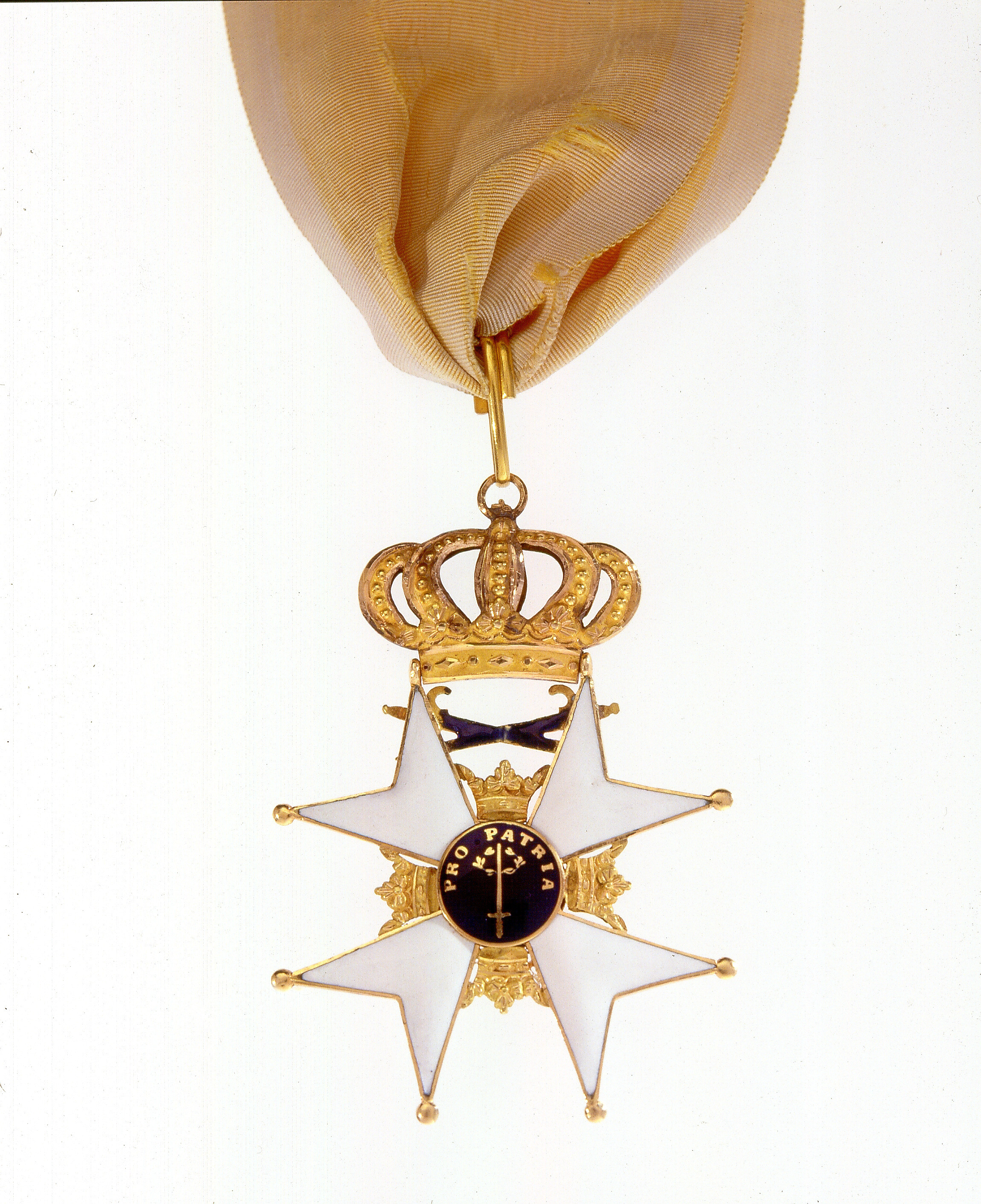 Vitemaljerat, liggande malteserkors av guld, platta kulor på spetsarna, mellan korsarmarna öppna guldkronor. Blåemaljerad medaljong med på framsidan svärd och tre kronor, på baksidan svärd, lagerkrans och text: "PRO PATRIA", allt av guld. Över de övre korsarmarnas övre spetsar två korslagda svärd med spetsarna nedåt, blåemaljerade klingor. Däröver på en axel mellan spetsarna en kunglig krona av guld, fast ring vid äpplet, däri fäst en öppen, päronformig bandring av guld. Har tillhört dåvarande kronprinsen Karl (XIV) Johan. Efter erövringen av Fredrikstad 1814 och fiendens fördrivande från Kohsön över Glomma vid Kylbergsbo tog Kronprinsen av sig dekorationen och hängde den om halsen på generalen, greve Gustaf Mörner (1768-1841).