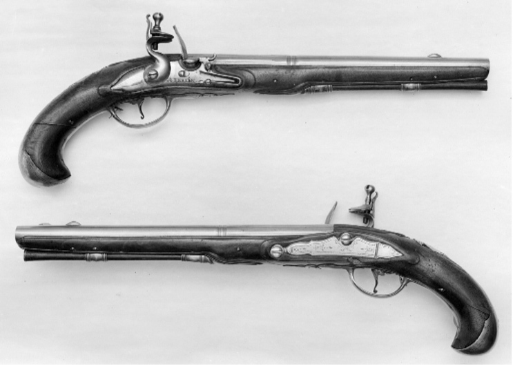 Rund, slätborrad pipa med åttsidig kammare, på ovansidan med profilerade kantlister, vid övergången en profilerad ring. På ovansidan graverad, tvivelaktig signatur(?): "LAZARINO.COMMINAZO". Svagt böjt, tvärt avskuret svansskruvblad. Riktmedel: Spolformigt korn av stål. Fästning: Två häften. Pipan fäst med krysskruv, bakre låsskruven i hak i svansskruvplattan samt två pipstift, ett av stål och ett av trä. Flintlås med slätt, välvt låsbleck, framför hanen graverad, delvis utplånad signatur, övre delen delvis dold av skjutsäkringens knapp: "FR..RY // A. BERLIN". S-formig, välvd hane med ovala käkar, överkäken lös, käkskruv med päronformigt huvud. Rundad fängpanna med fals, batteri med välvt fängpannelock och eldstål med antydd åsning, c-formig häl. Batterifjäder med litet, flikigt fjäderlöv. Avtryckarstången blånerad. Säkring: Mellan hane och fängpanna en skjutsäkring med ovalt, delvis fasat grepp. Fästning: Två låsskruvar. Avtryckare med upprullad ände. Spetsovalt, blånerat avtryckarbleck. Helstock av valnöt, enkla, snidade lister runt beslag, pipränna och laddstocksnot. Beslag av stål. Slät kolvkappa med konturerad flik på kolvryggen, punsad, dubbel kantbård samt dekor runt fästskruven. Omedelbart ovanför flikens ände en i låg relief profilerad tumplåt med graverad dekor. Plant sidbleck med fasade kanter och försänkt bakspets, punsad, dubbel kantbård samt graverade blad. En + en rundad rörka, slät spets. Varbygel med välvda, profilerade armar, främre armen 8-formig och avslutad med vasliknande spets. I låsurtaget inhugget: VIII. Tillbehör: Laddstock av trä, l: 261 mm, framtill förstärkt med stålplatta.