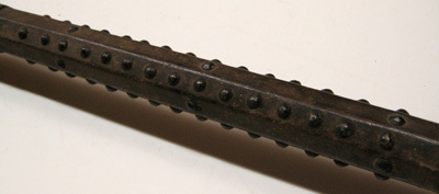 Stötklingan rak med fyrsidigt tvärsnitt. Basen konturerad med cirkulärrt tvärsnitt och tre utstående bygelformade ornament med drivna ansikten. Yxblad, H 183 mm, med konkav egg och smala spetsiga ändar. Mittpartiet genombrutet i åtta ornament. I sidorna utskott med ändarna formade till fågelhuvuden. Haken triangulär, snett nedåtriktad och genombruten i tre ornament. Basen med inskärning upptill och nertill. Stämpel på vänster sida i form av inom rektangel med spetsiga ändar ett + och möjligen ett M. Holken utgörs av bladbasen samt skenornas övre bredare del, ca 70 mm lång, ursprungligen fäst med två nitar på var sida. Skenorna därefter smalare och ca 120 mm långa, fästade med två nitar var. Stång, B 35 mm, av mörkbrunt trä med sexsidigt tvärsnitt. Från skenornas slut och 640 mm ner sitter kullriga nitar inslagna i täta rader. Nertill ringformigt beslag och inslagen 83 mm lång fyrsidig spets. Partiet mellan skenorna klätt med ett mycket smutsigt gulaktigt tyg, möjligen silke. Över detta är tre band med rester av frans. Fäst med nitar.