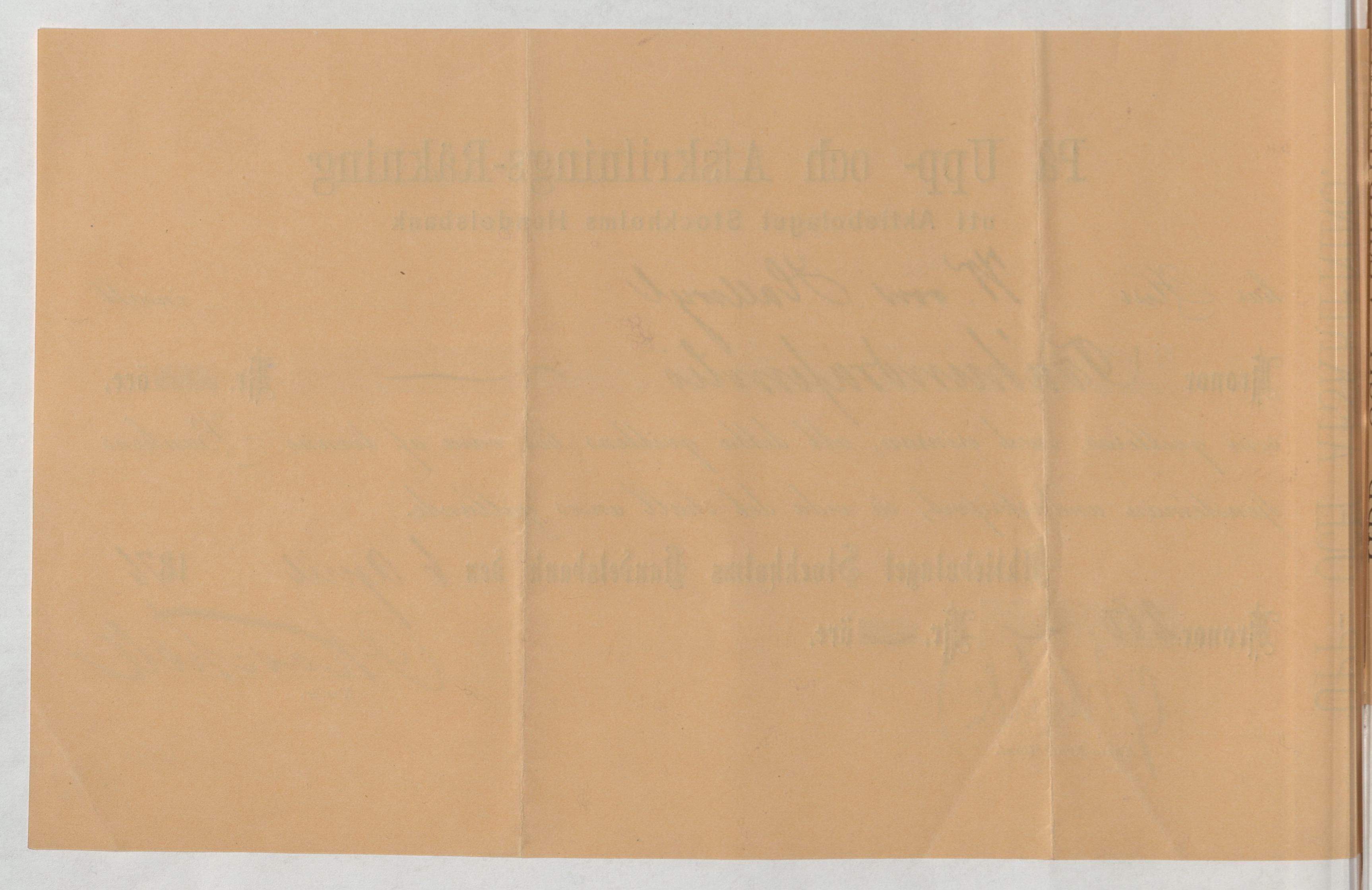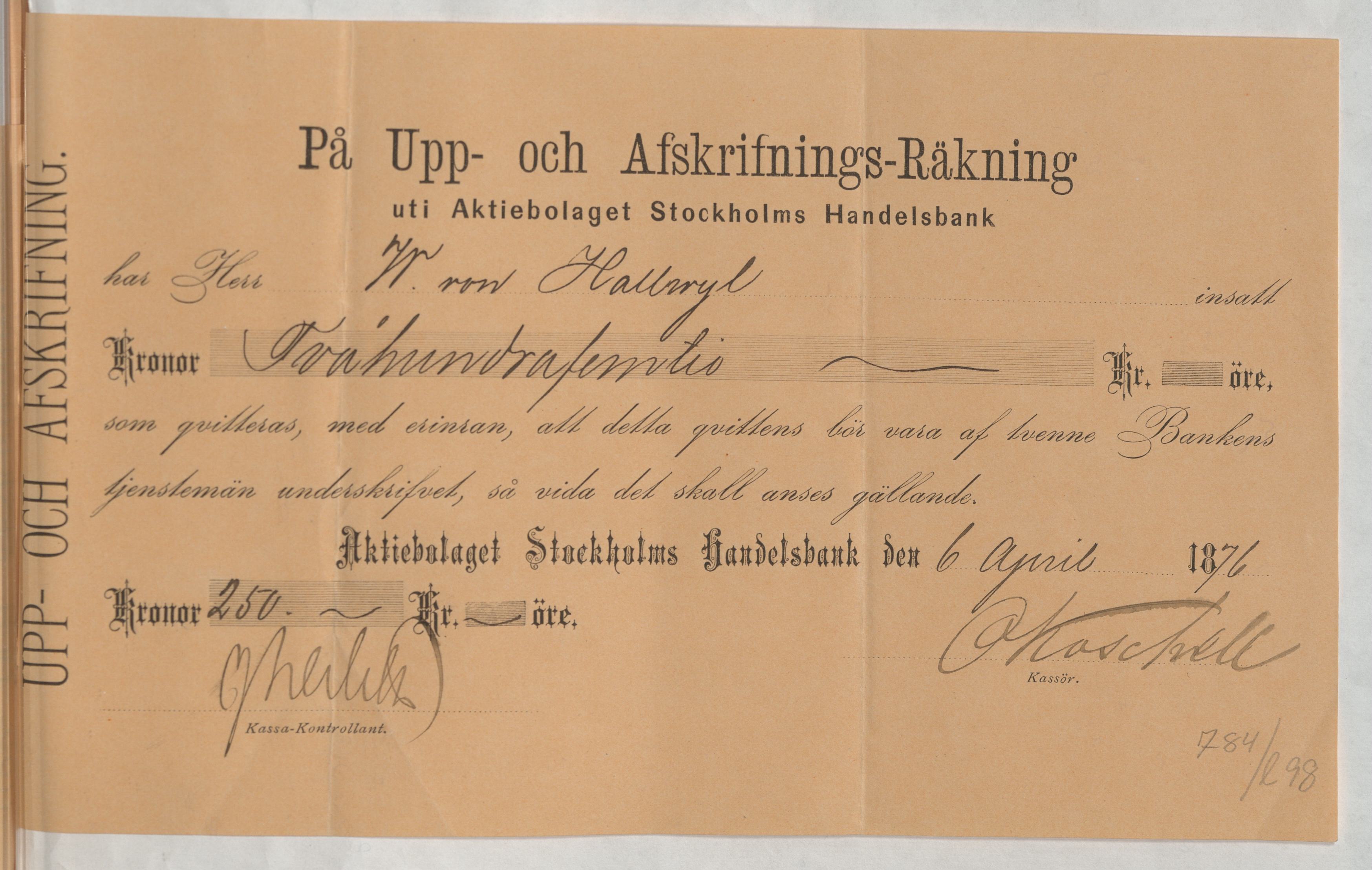 Kvitto från Aktiebolaget Stockholms Handelsbank rörande Upp- och Afskrifnings-Räkning