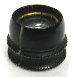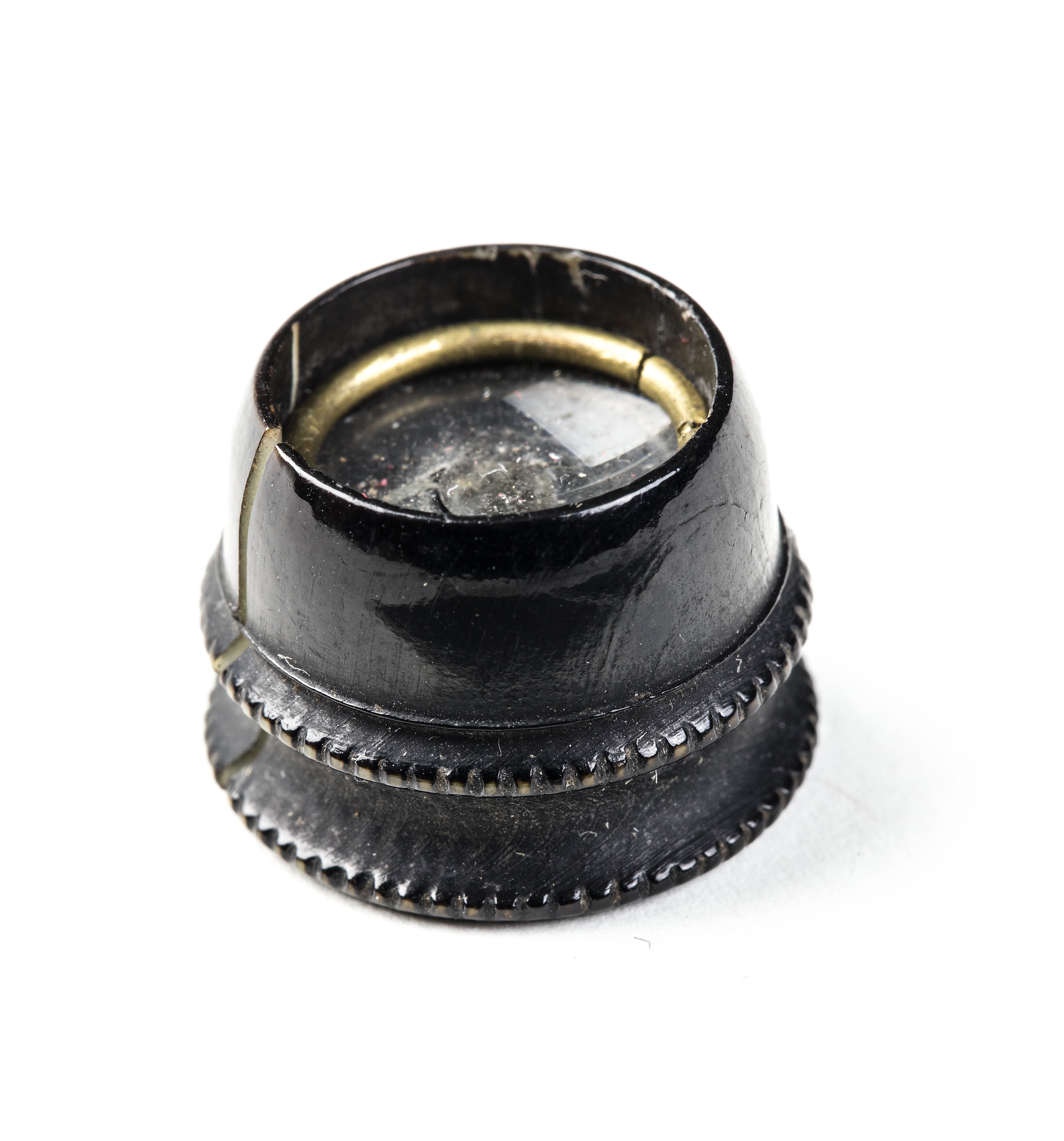 1700-talets mitt. Hus tillskuret i svartmålat horn el. ben ? Konisk form med nertill två räfflade ringar och upptill ringformg öppning. I denna en konvex lins, fasthållen av mässingsring. I husets breda ände skuret fem streck.