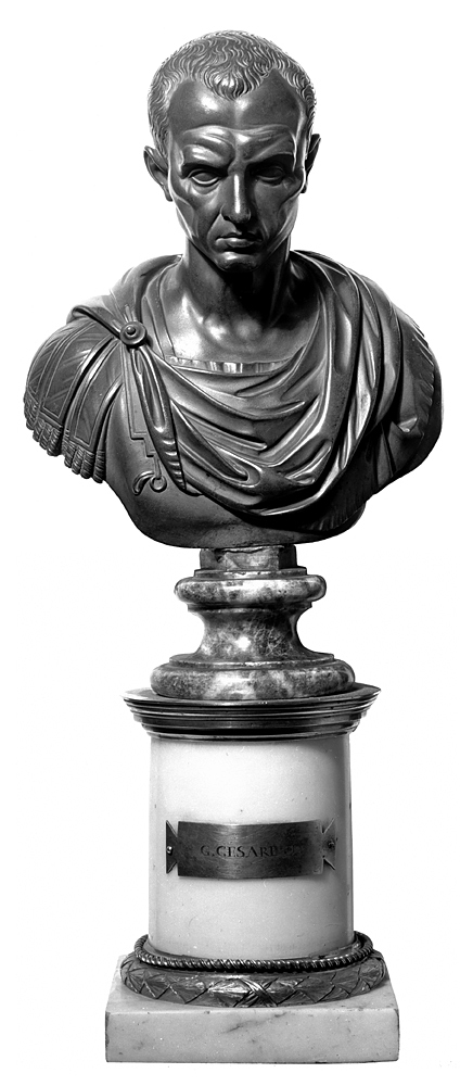 SKULPTUR. Byst av brons (ihålig) föreställande JULIUS CAESAR. Bysten står på en lös marmorsockel i form av en slät låg kolonn med mässingsbeslag och mässingsskoning, stående på en kvadratisk fotplatta. Inköpt på auktion av Willhelmina von Hallwyl på Bukowskis konsthandel 1910. Gaius Julius Caesar, född 13 juli 100 f.Kr. Rom, död 15 mars 44 f.Kr. i Rom, var en romersk militär, statsman och skriftställare som kom att spela en betydande roll då den romerska republiken omformades till det romerska kejsardömet. .