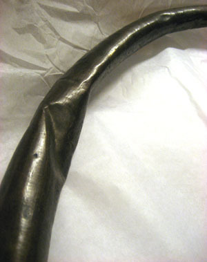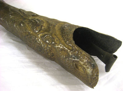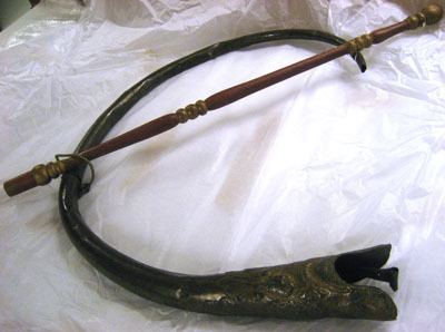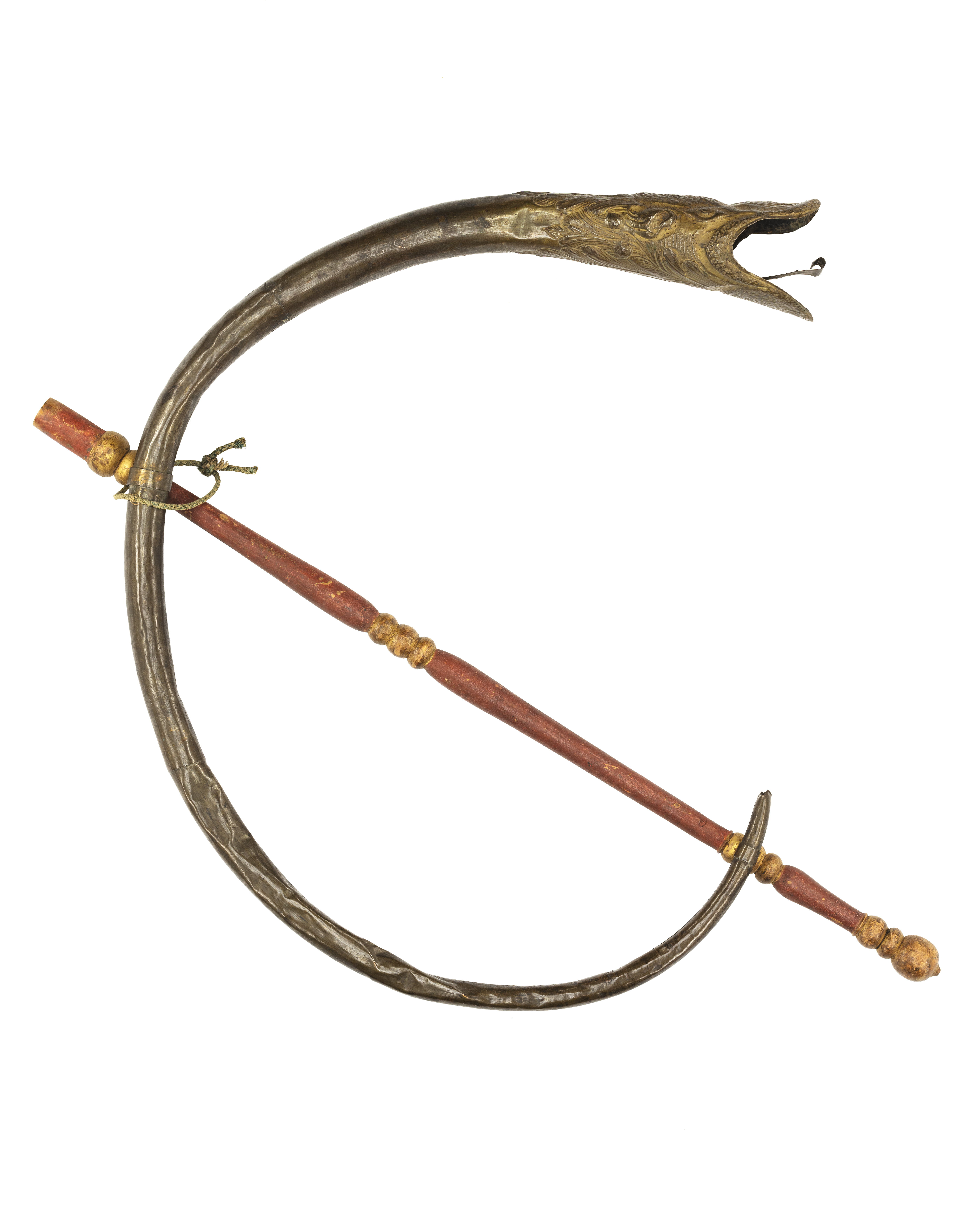 Böjt horn av mässing. Ihopsatt av två delar. Klockstycke i form av drakhuvud med öppen mun med en halvt upprullad tunga av metall i gapet. Upphöjd ornering. Munstycke saknas. Mitt över hornet är en rak, svarvad trästav fäst runt tonröret med metallband i gulmetall, som löper genom trät och är nerböjda på andra sidan. Staven är målad i gult och rött, avslutas med en knopp upptill, och har en rak avslutning nedtill. I båda ändar ett litet hål i mitten. Snöre runt nedre fästet, flätat i grönt och beigefärgat garn. Stavens längd: 995 mm.